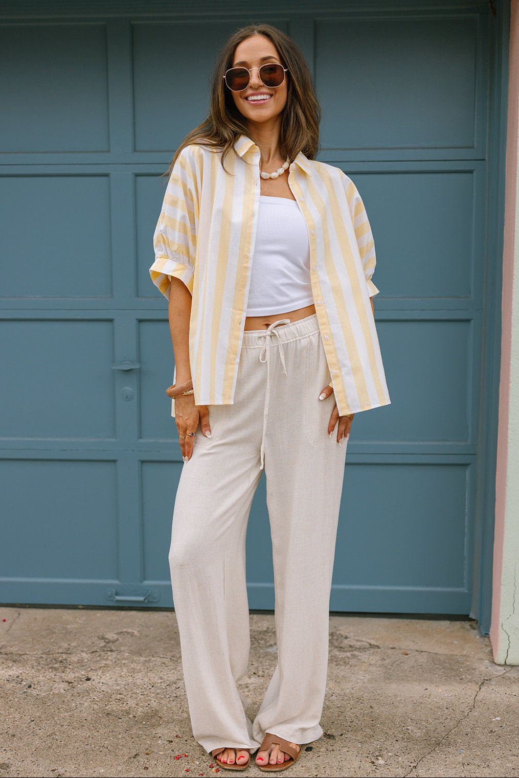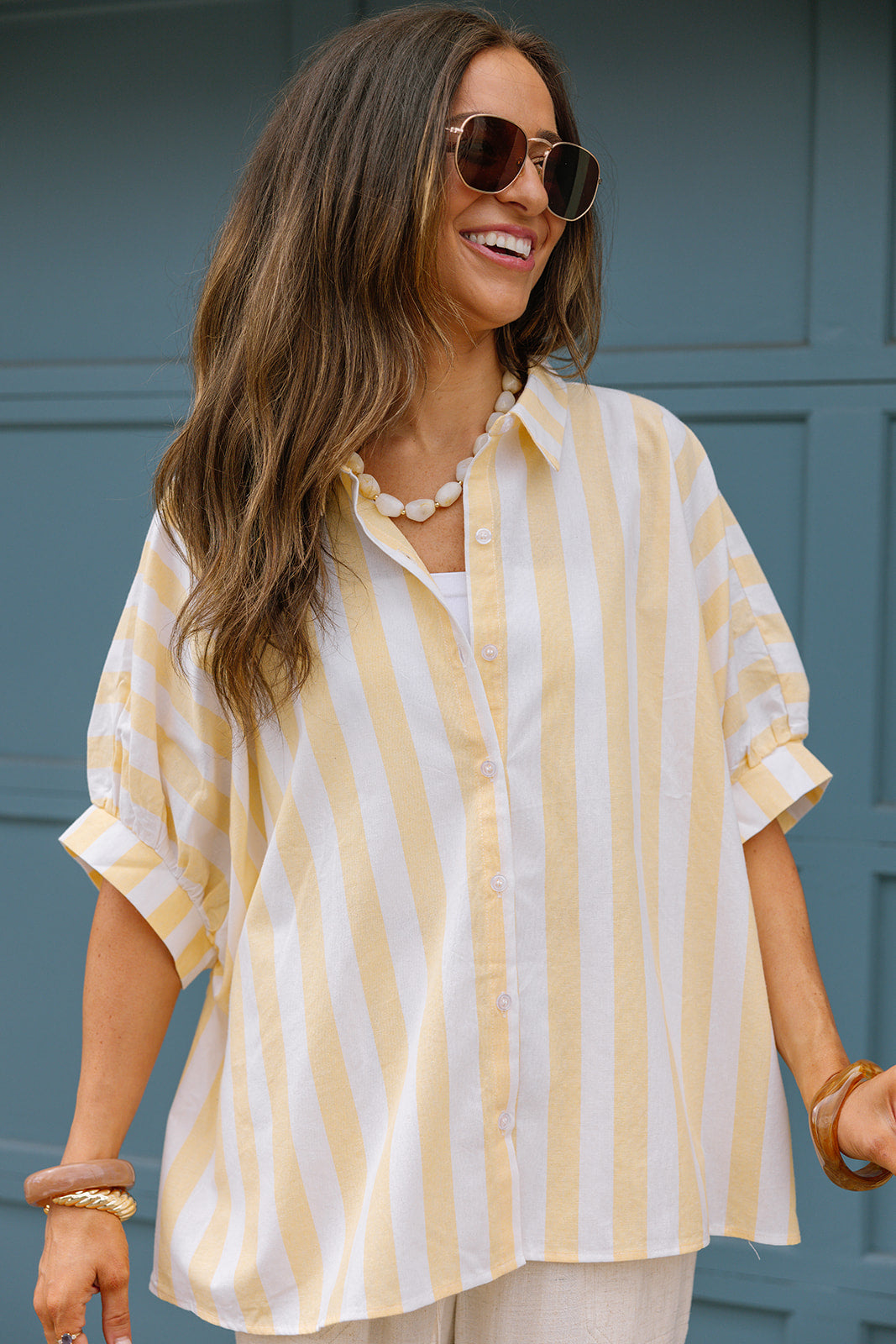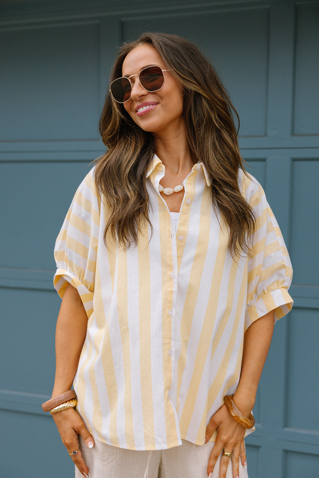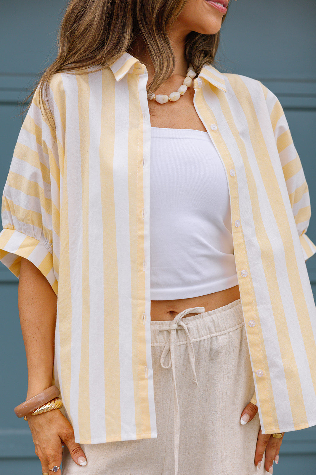The Blaire Yellow & White Linen Stripe Top is a bright and breezy piece perfect for effortless warm-weather style. Crafted from lightweight linen fabric in a cheerful yellow and white stripe pattern, this top features a classic collar neckline and a front button-up design for a polished touch. The short puff sleeves add a hint of feminine charm while keeping the look light and comfortable. Easy to dress up or down, the Blaire top pairs beautifully with denim, shorts, or skirts for a fresh and timeless outfit.