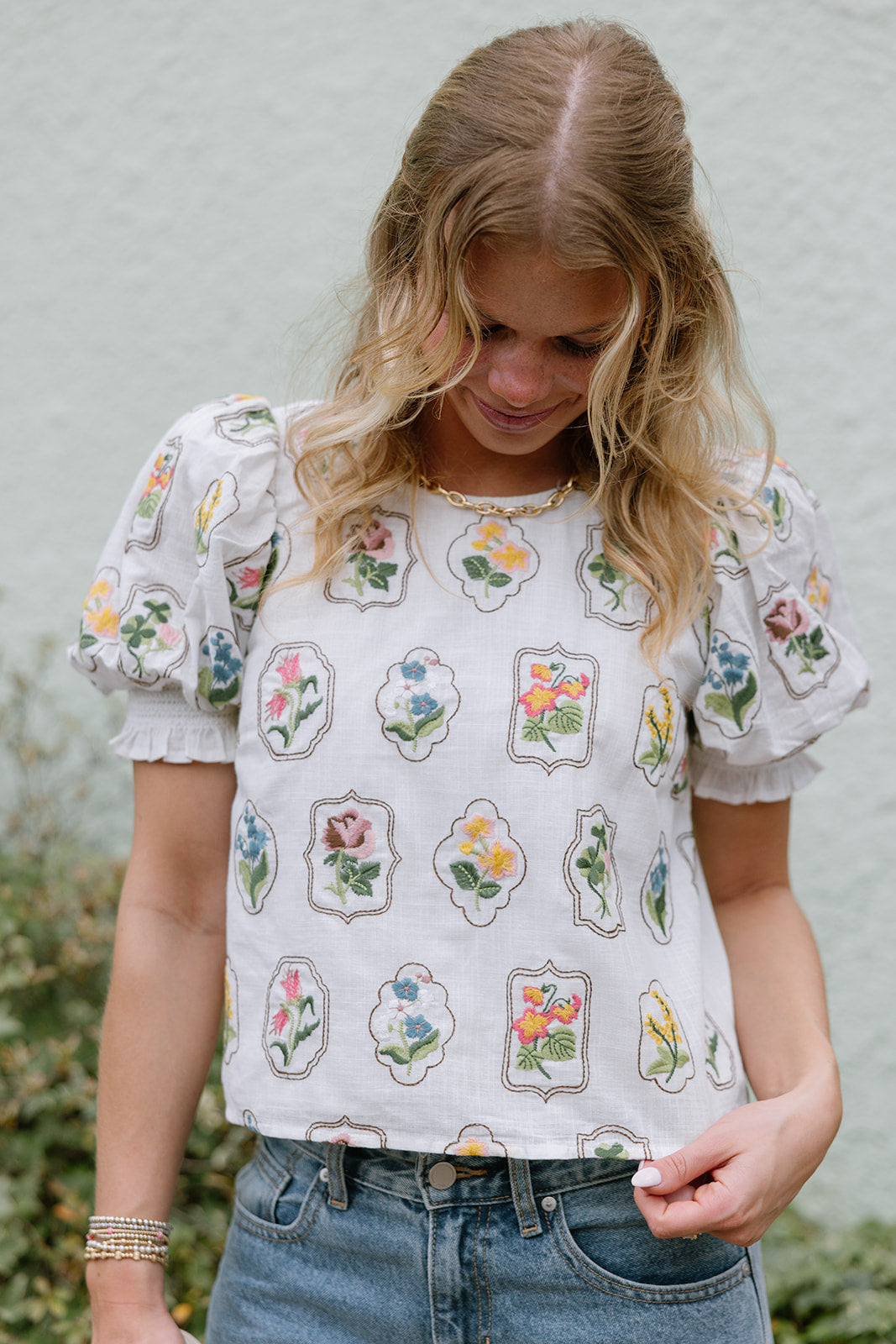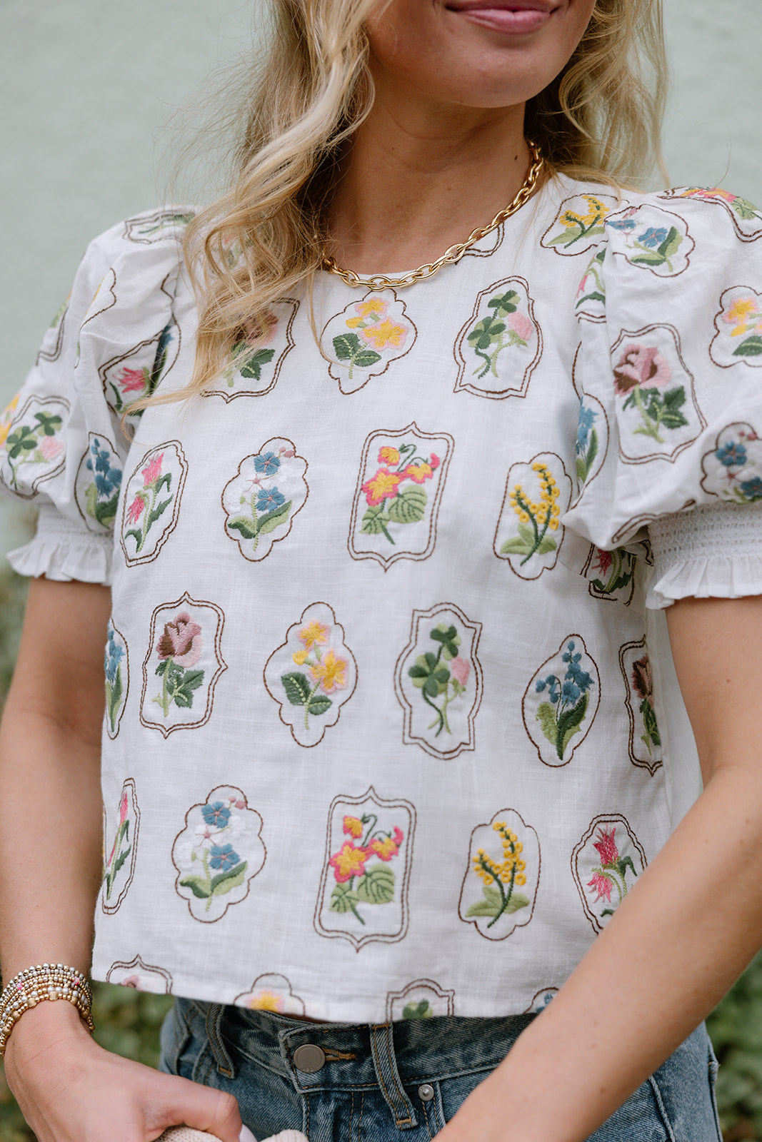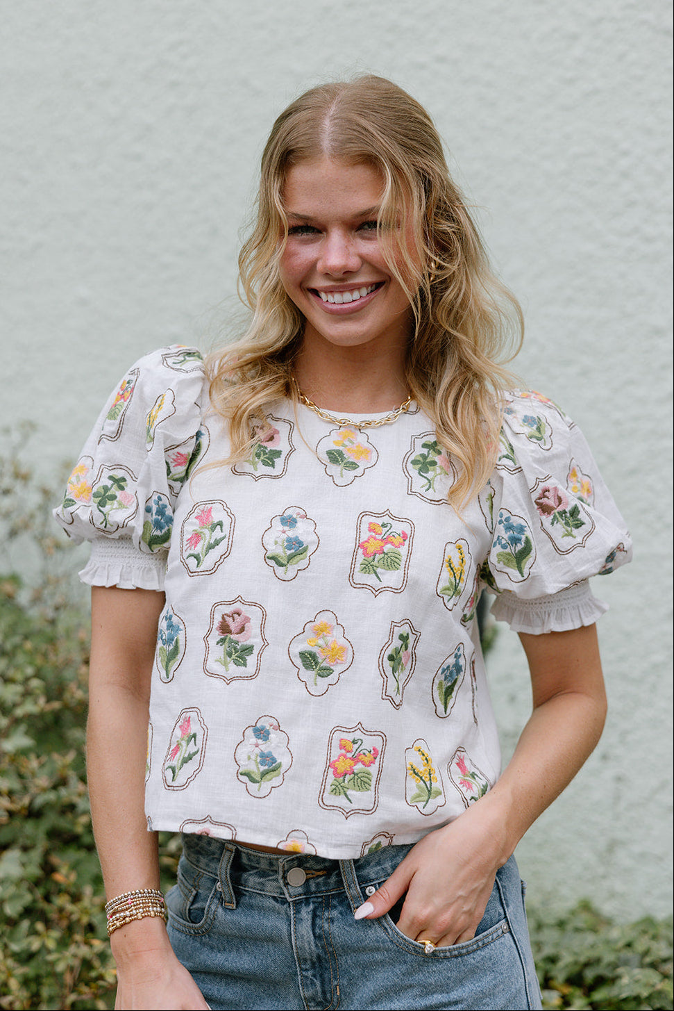 The Jane White Multi Floral Stitch Top is a delicate and feminine piece perfect for warm-weather days. Crafted from lightweight white linen fabric with colorful floral stitch detailing and a soft white lining, this top features a classic round neckline and short puff sleeves for a romantic silhouette. Finished with a back button closure for a secure and polished fit, the Jane top pairs effortlessly with skirts, shorts, or jeans, adding a charming, whimsical touch to any outfit.