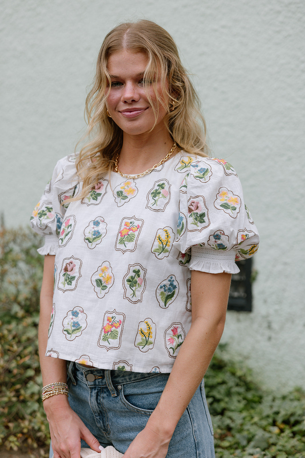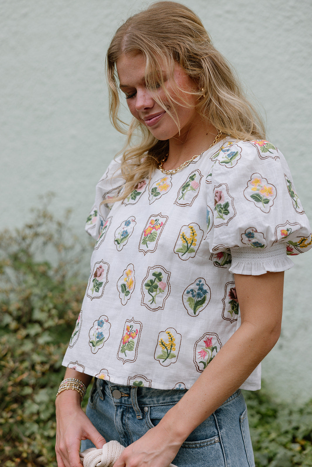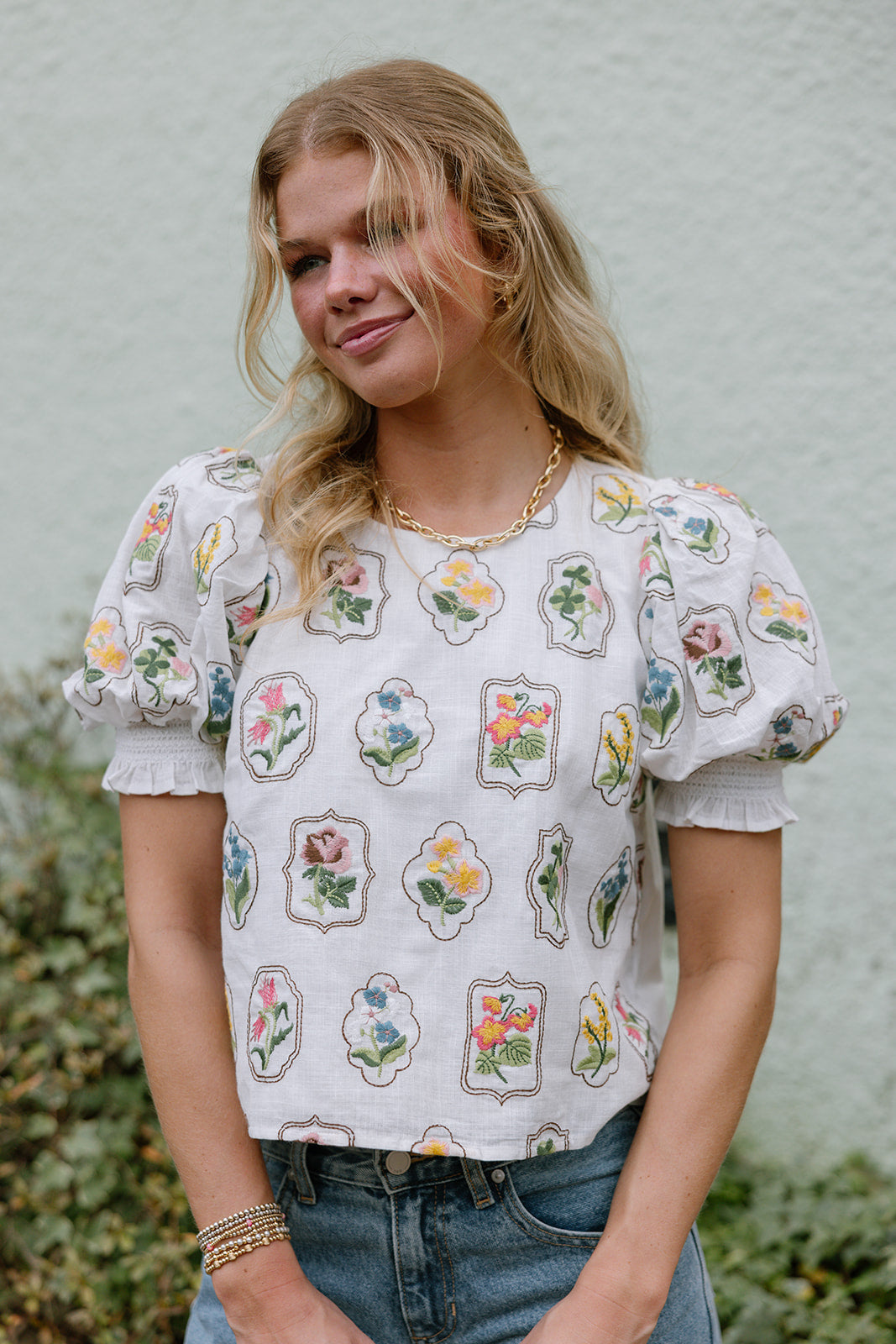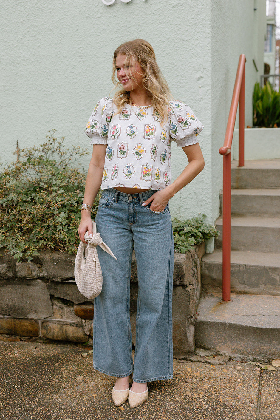 The Jane White Multi Floral Stitch Top is a delicate and feminine piece perfect for warm-weather days. Crafted from lightweight white linen fabric with colorful floral stitch detailing and a soft white lining, this top features a classic round neckline and short puff sleeves for a romantic silhouette. Finished with a back button closure for a secure and polished fit, the Jane top pairs effortlessly with skirts, shorts, or jeans, adding a charming, whimsical touch to any outfit.