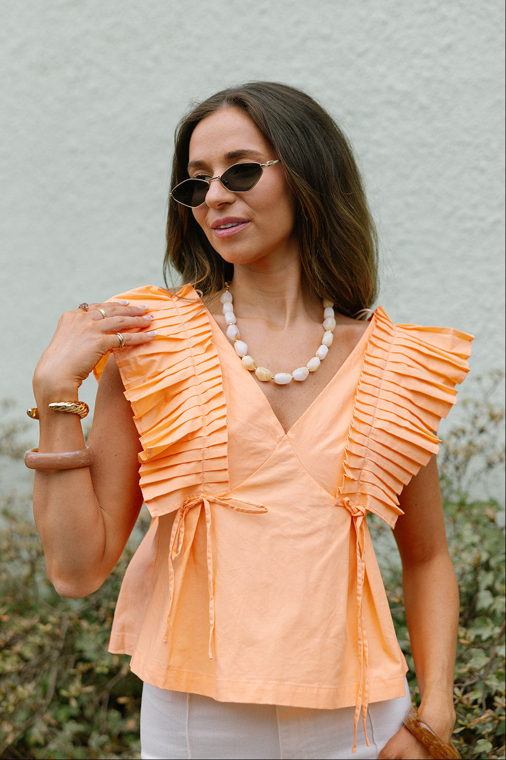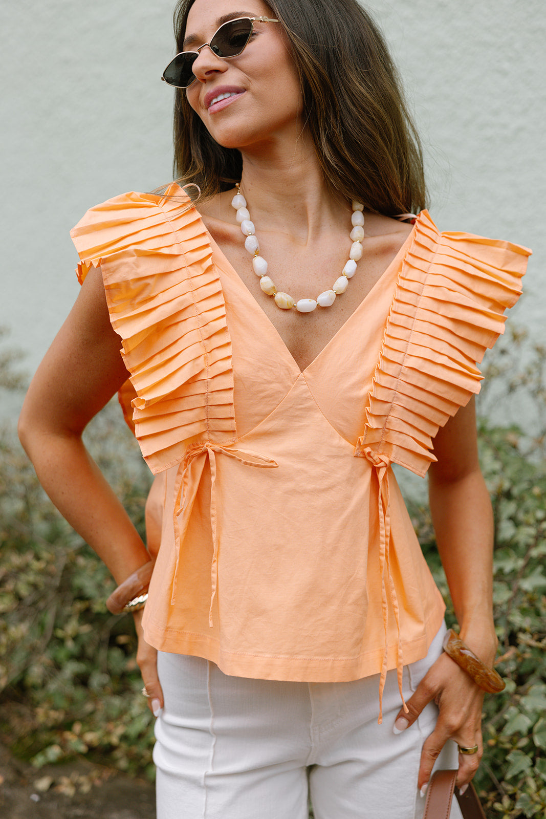 The Palmer Orange Coral Pleated Ruffle Top is a vibrant and feminine piece perfect for warm-weather styling. Crafted from lightweight orange coral fabric, this sleeveless top features delicate pleated detailing along the upper bodice and a flattering V-neckline. Front tie accents add a playful touch, while the back zipper closure ensures a secure and polished fit. Effortlessly chic, the Palmer top pairs beautifully with skirts, shorts, or trousers for a bright, standout look.