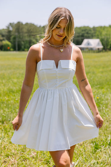 Fresh, flirty, and effortlessly timeless, the Janelle White Flare Mini Dress is a go-to for sun-soaked days and special moments. Made from lightweight white fabric with a soft lining for all-day comfort, this mini dress features a flattering square neckline and dainty front covered buttons for a classic touch.