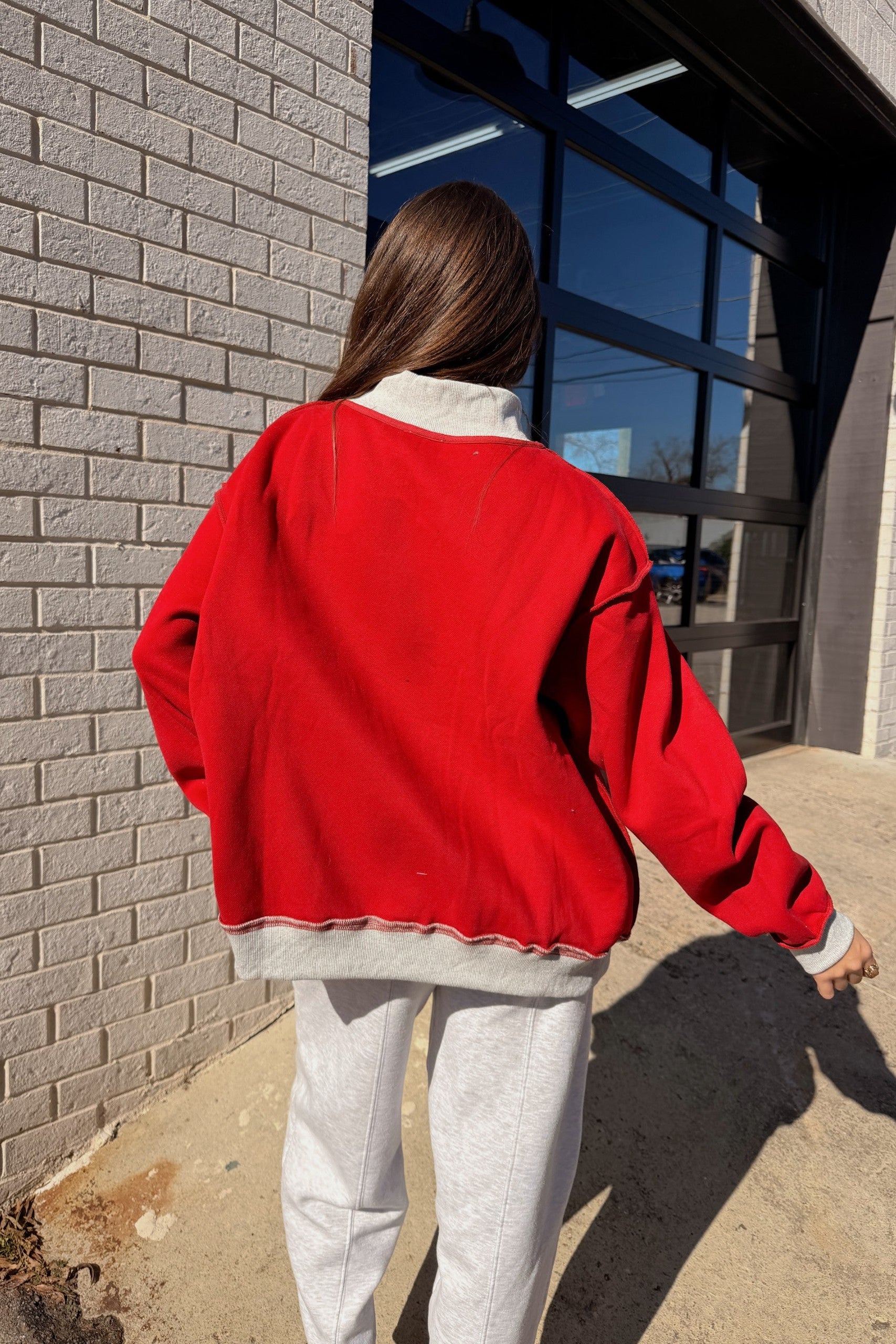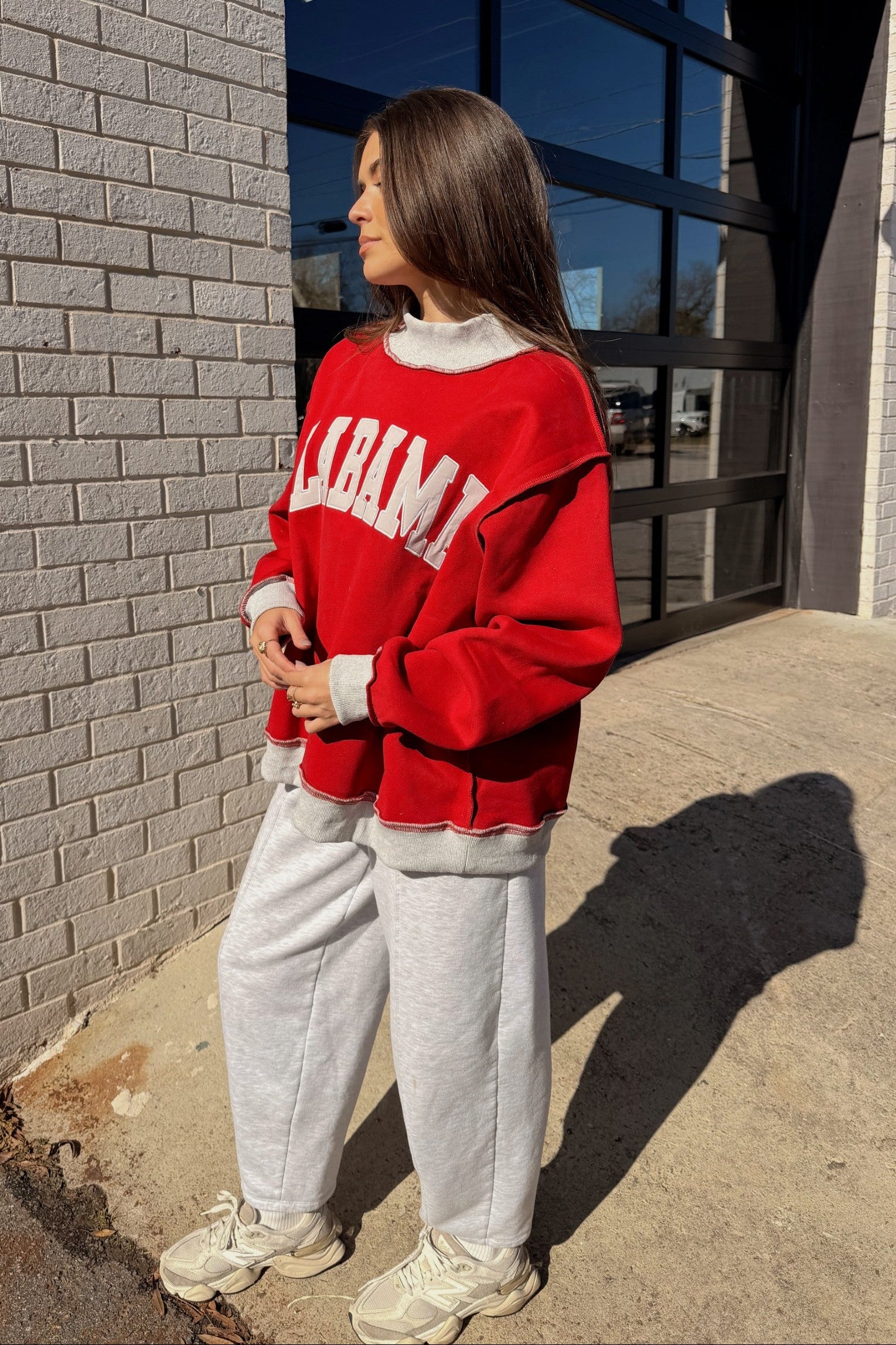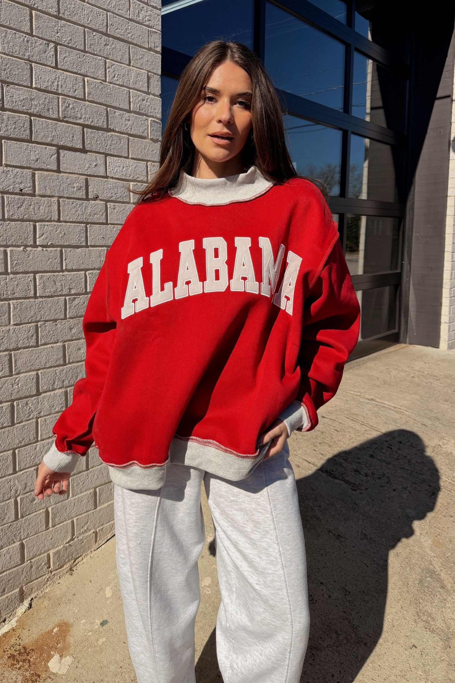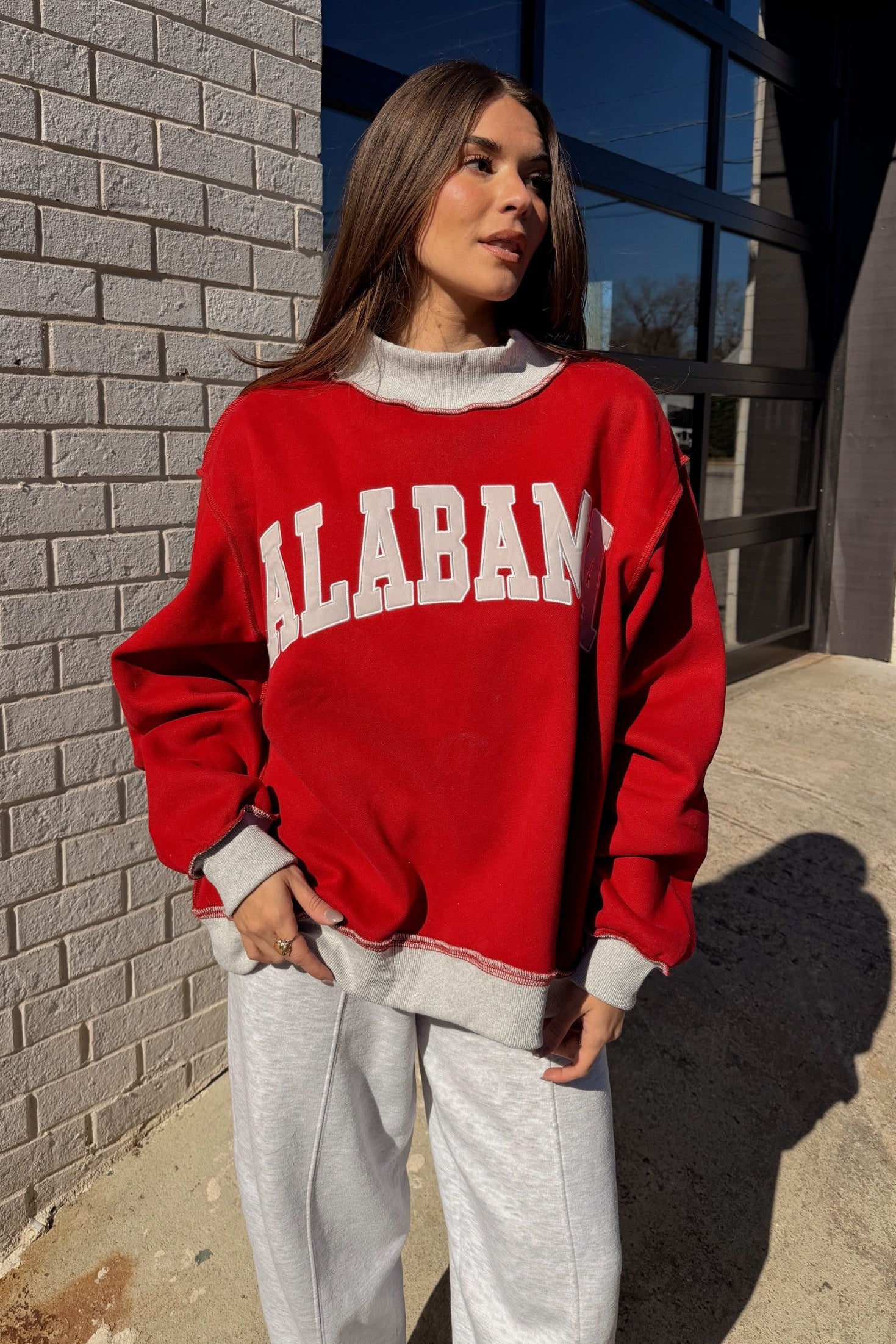 The Alabama Crimson & Grey Mock Neck Sweatshirt is the perfect cozy layer for showing your team pride in style. Made with crimson red lightweight knit fabric, this sweatshirt features light grey trim details and a bold “ALABAMA” graphic across the front. The high mock neckline and ribbed hem add a polished finish, while the relaxed silhouette keeps it comfortable for game days, campus strolls, or casual weekends.