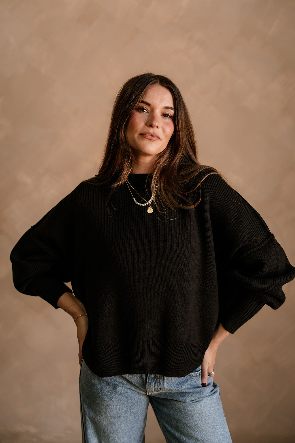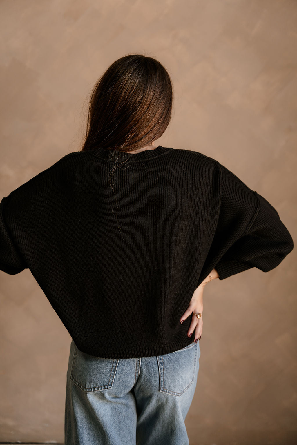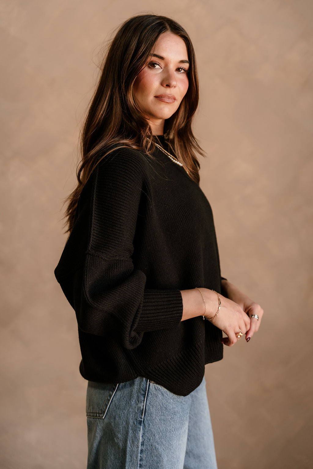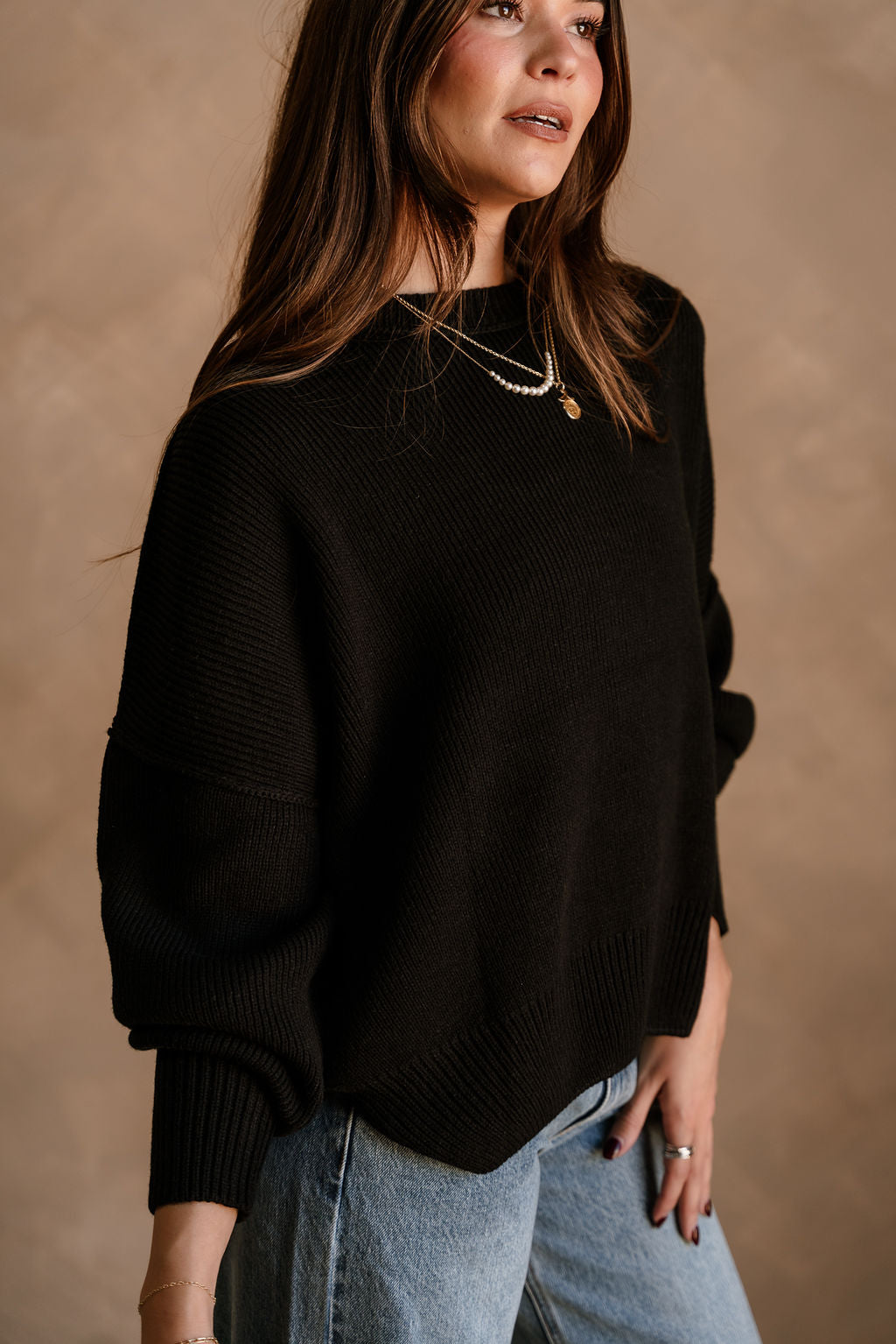 The Alaina Black Ribbed Knit Sweater is a sleek and versatile addition to any wardrobe. Made from soft black ribbed knit fabric, it features a classic round neckline and long sleeves with dropped shoulders for a relaxed, effortlessly chic fit. Small side slits add subtle detail while allowing ease of movement, making this sweater both stylish and comfortable.