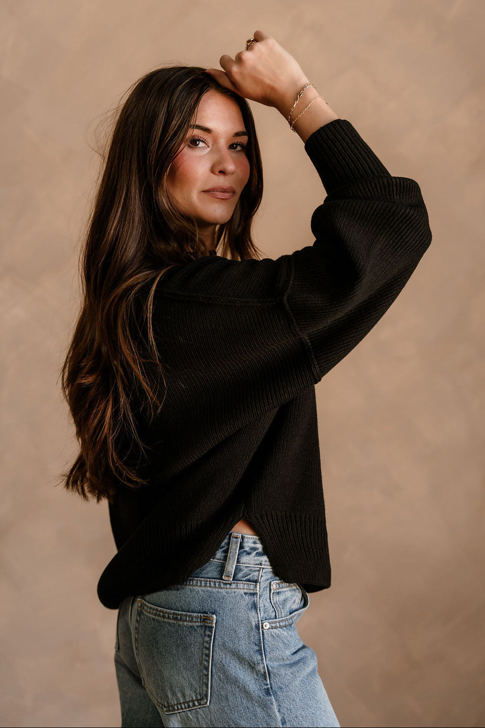 Perfect for layering over jeans, skirts, or trousers, the Alaina Sweater can easily transition from casual daytime looks to polished evening outfits. Its timeless black hue and minimalist design make it a wardrobe staple that pairs seamlessly with any ensemble.