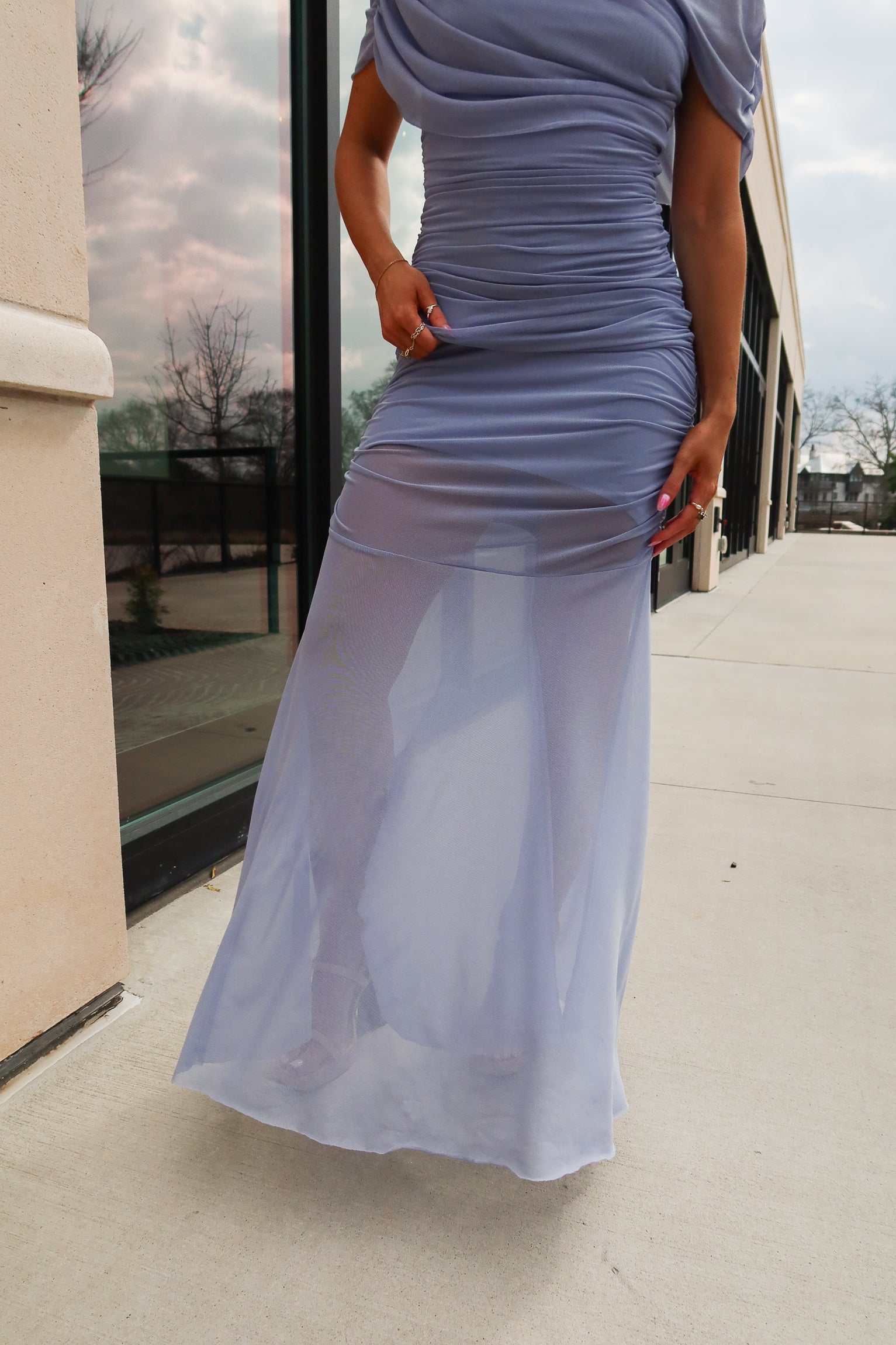 Alaina Blue Mesh Ruched Maxi Dress