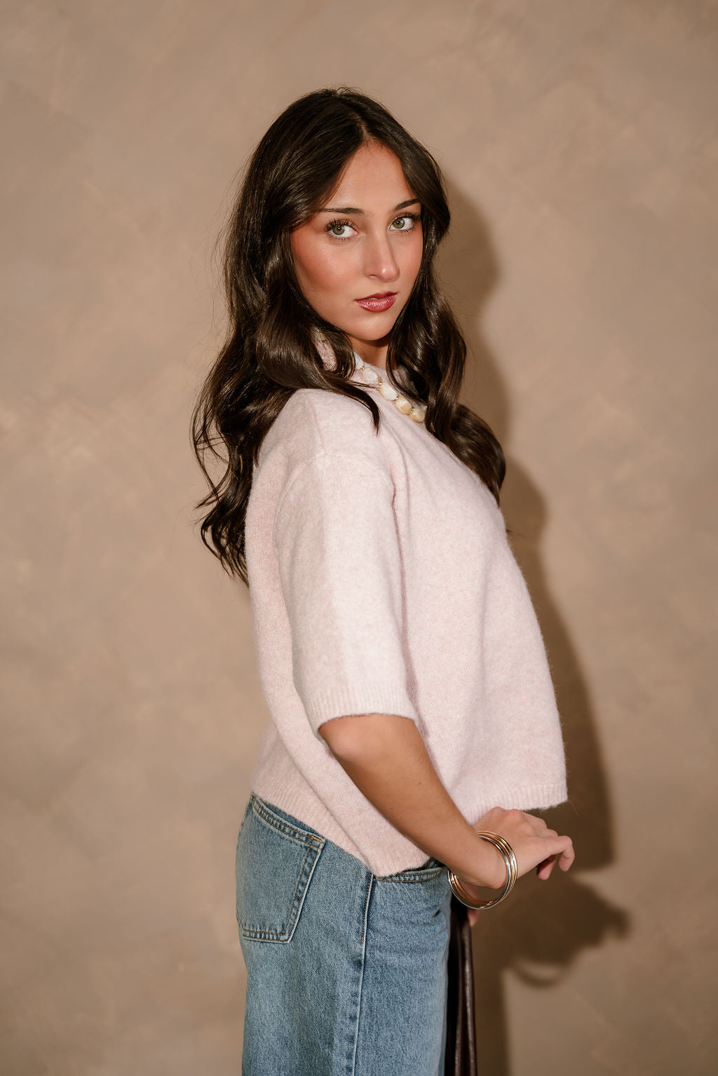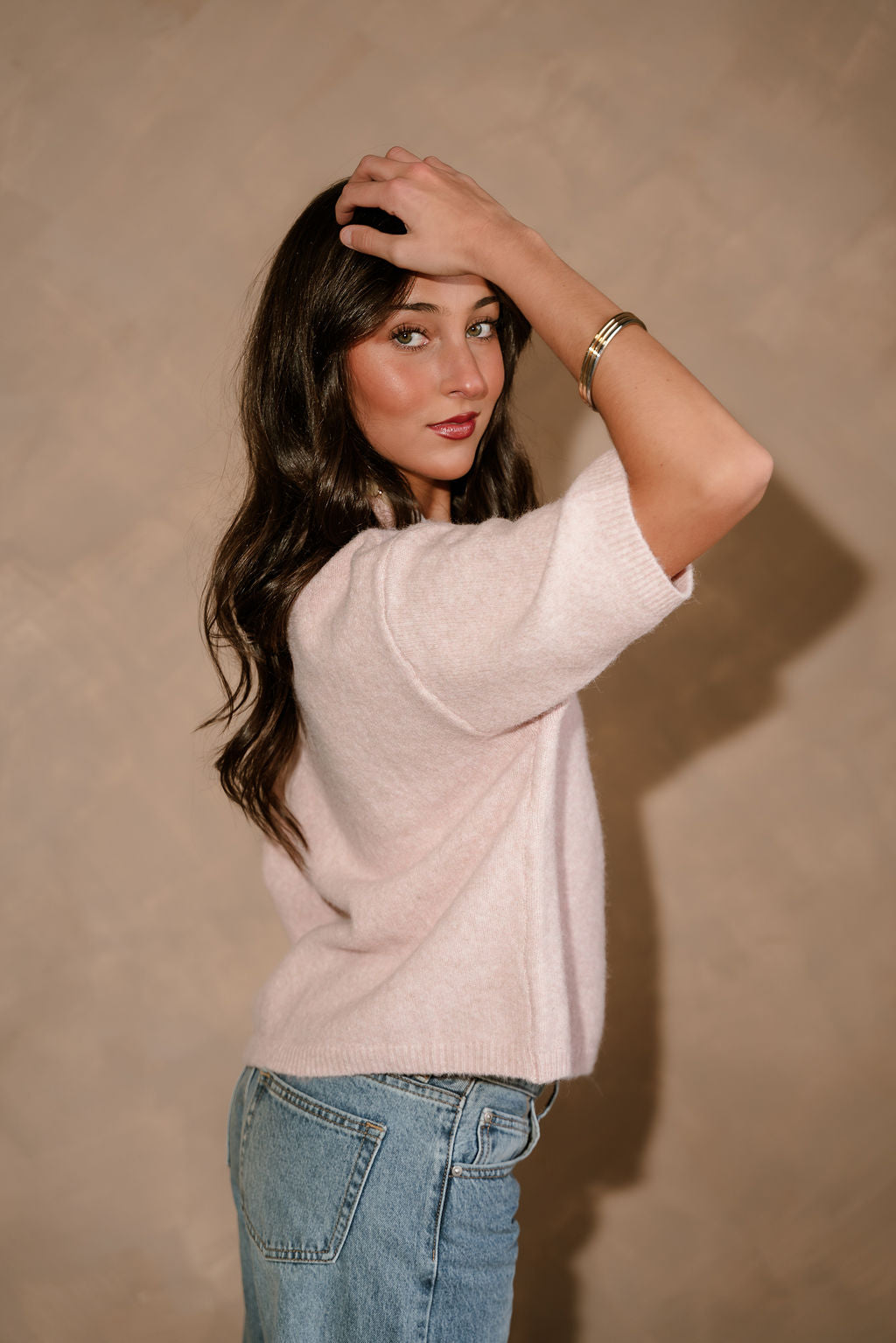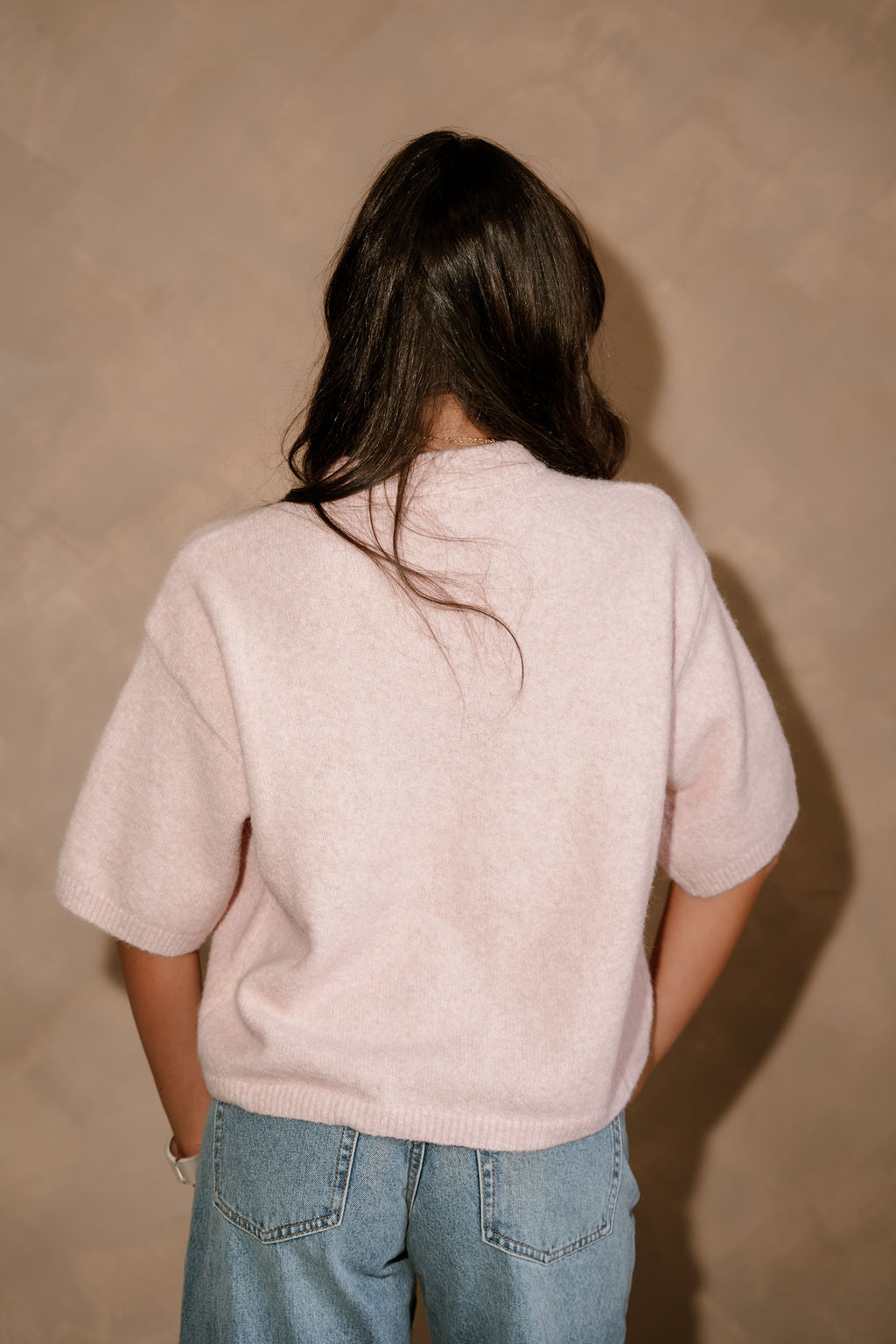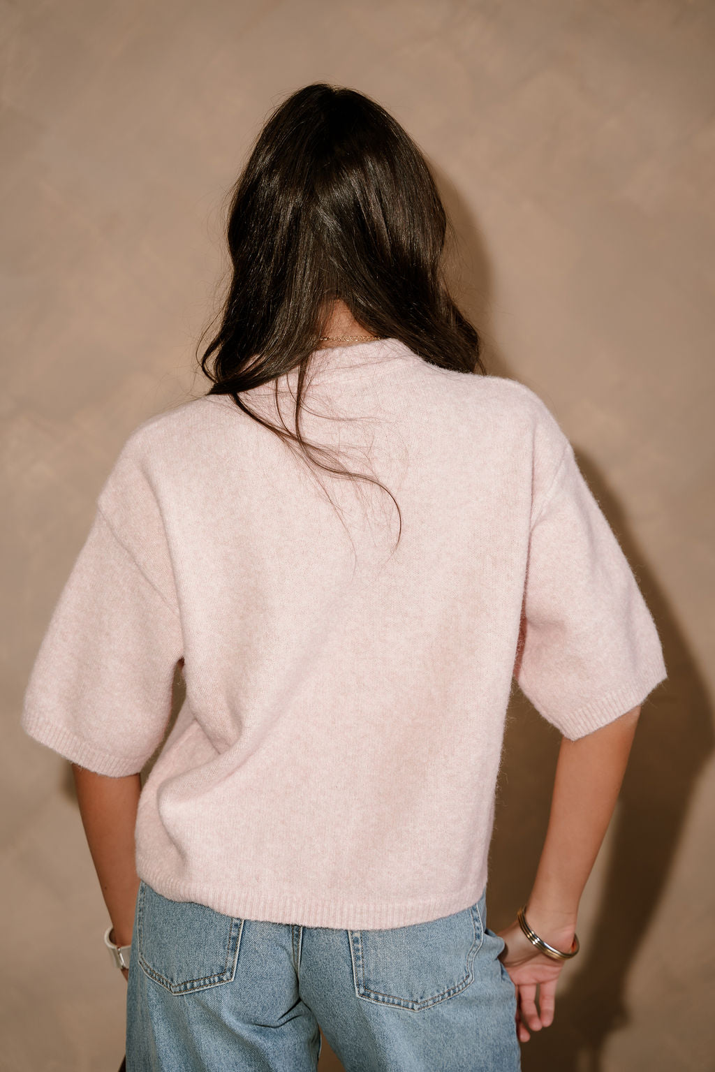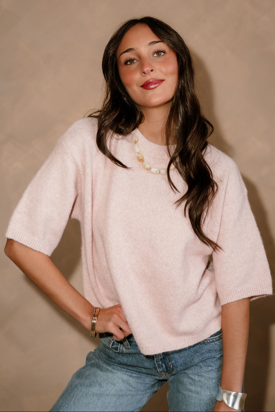 The Alaina Light Pink Short Sleeve Sweater is the perfect blend of soft color and everyday comfort. Crafted from a mauve pink knit fabric, this sweater offers a lightweight, cozy feel that’s ideal for year-round styling. It features a classic round neckline and short sleeves for a clean, versatile silhouette, while the ribbed hem adds subtle texture and a flattering finish. Easy to dress up or down, the Alaina sweater pairs effortlessly with denim, skirts, or tailored pants for a polished yet relaxed look.