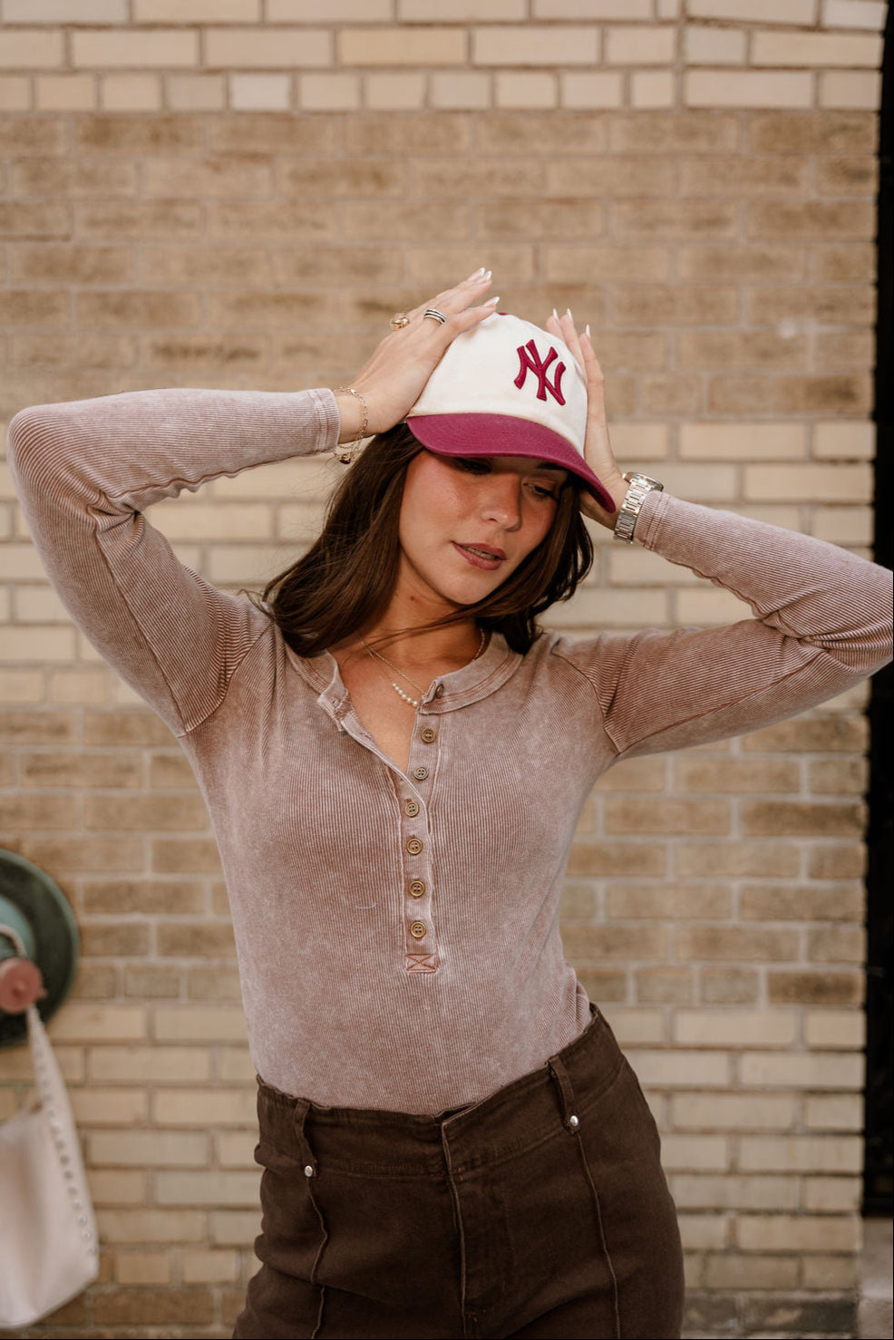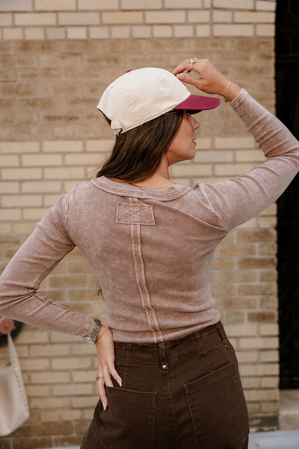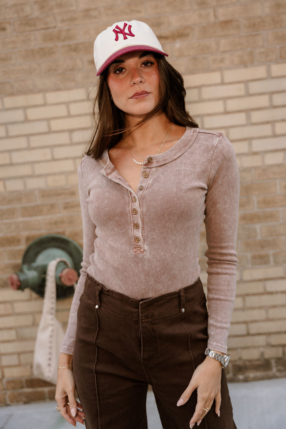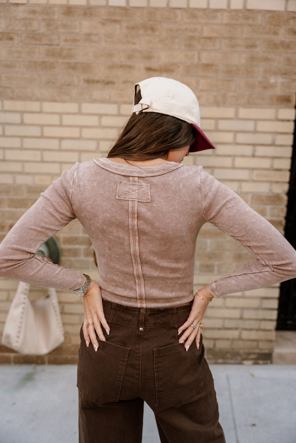 The Aleena Washed Mocha Ribbed Top is a cozy and chic wardrobe essential. Crafted from soft washed mocha ribbed fabric, it features a classic round neckline and a quarter button-up front for subtle, versatile styling. Long sleeves provide warmth and comfort, making it perfect for layering or wearing on its own. Effortlessly stylish, the Aleena top pairs beautifully with jeans, skirts, or tailored pants for a polished yet relaxed look.