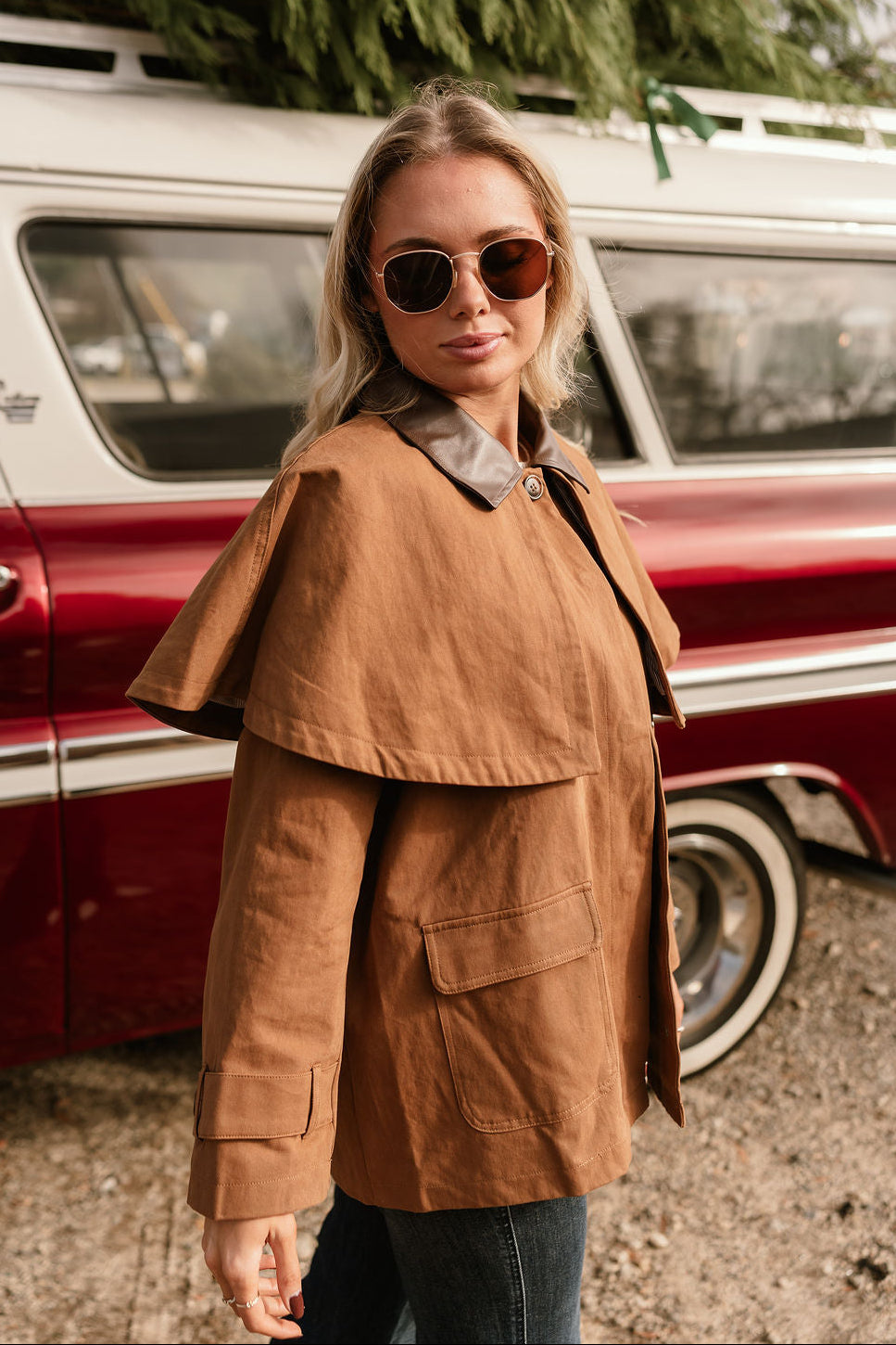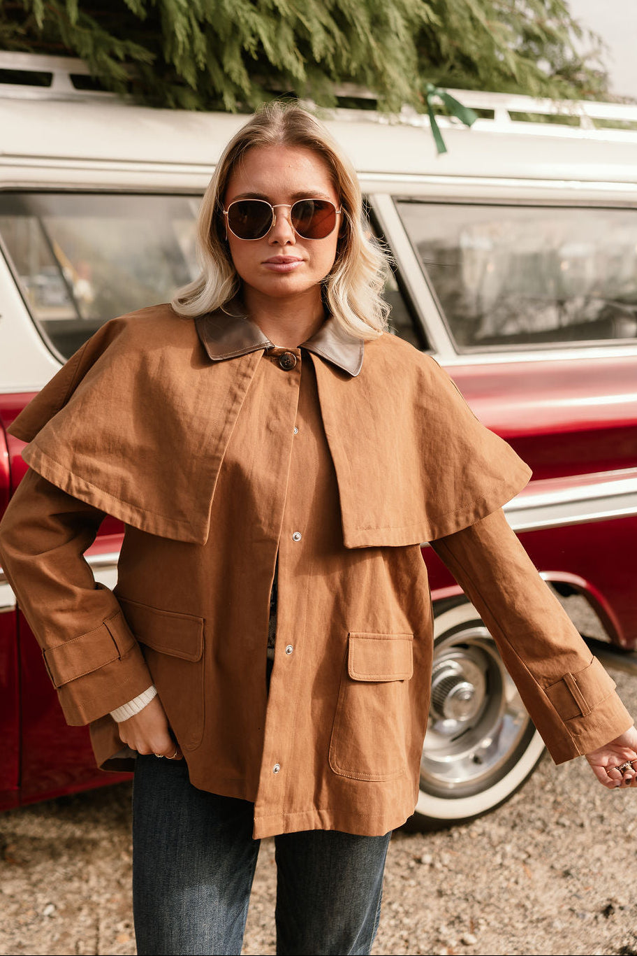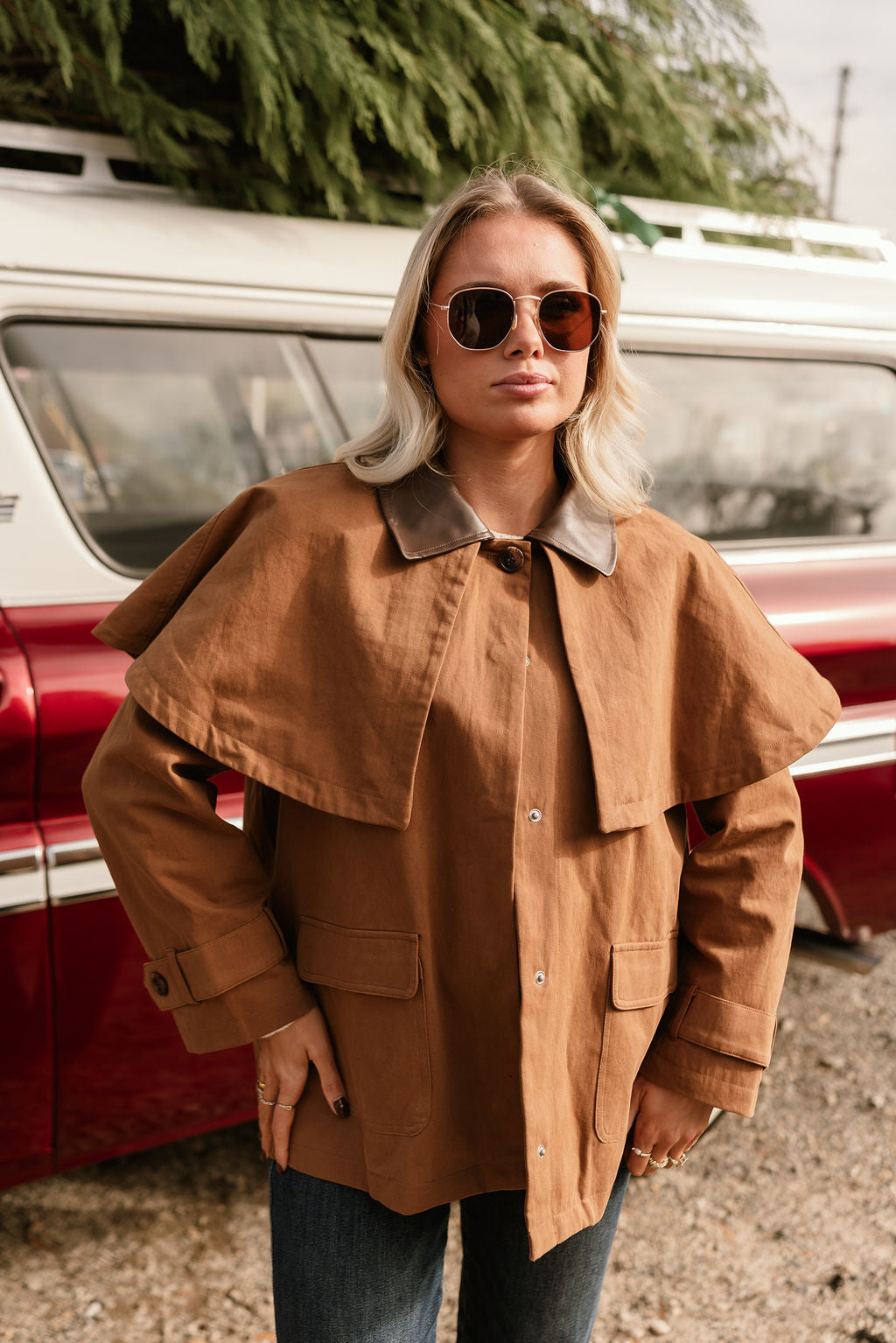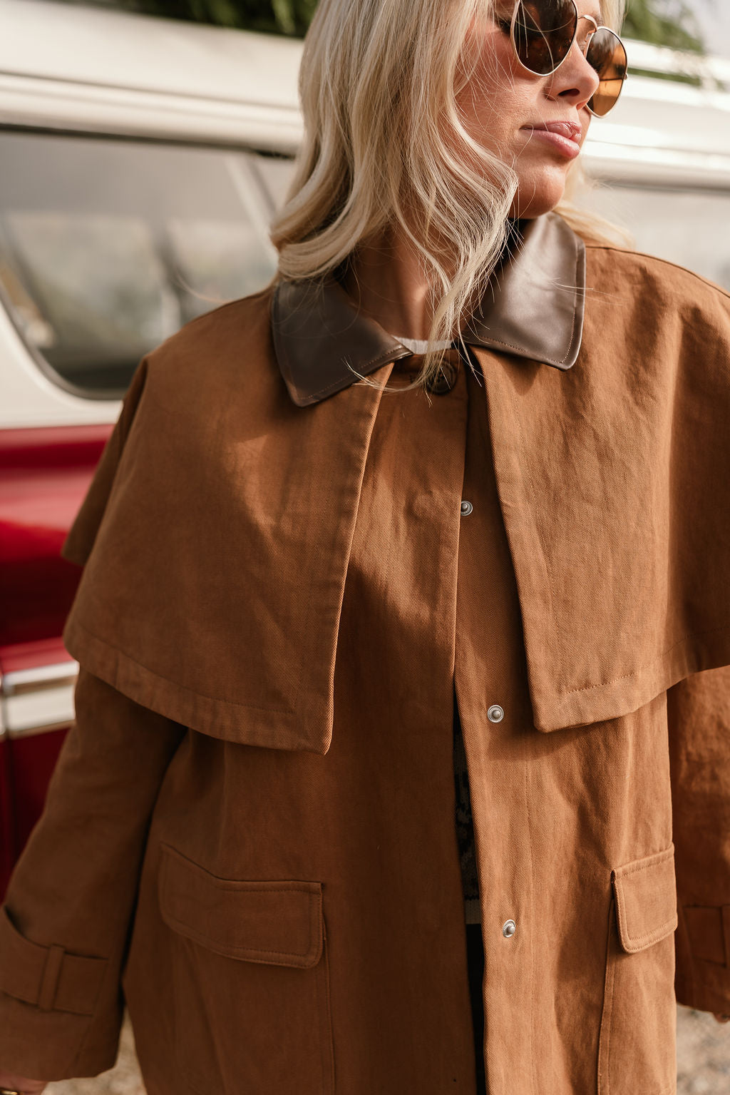 Elevate your layering game with the Alice Brown Poncho Jacket, a stylish fusion of classic design and modern detailing. Crafted from soft light brown camel fabric, this jacket offers cozy warmth and a relaxed, flattering silhouette perfect for transitional seasons. The standout dark brown faux leather collar adds a touch of sophistication, while overlay shoulder detailing provides a contemporary, fashion-forward twist.