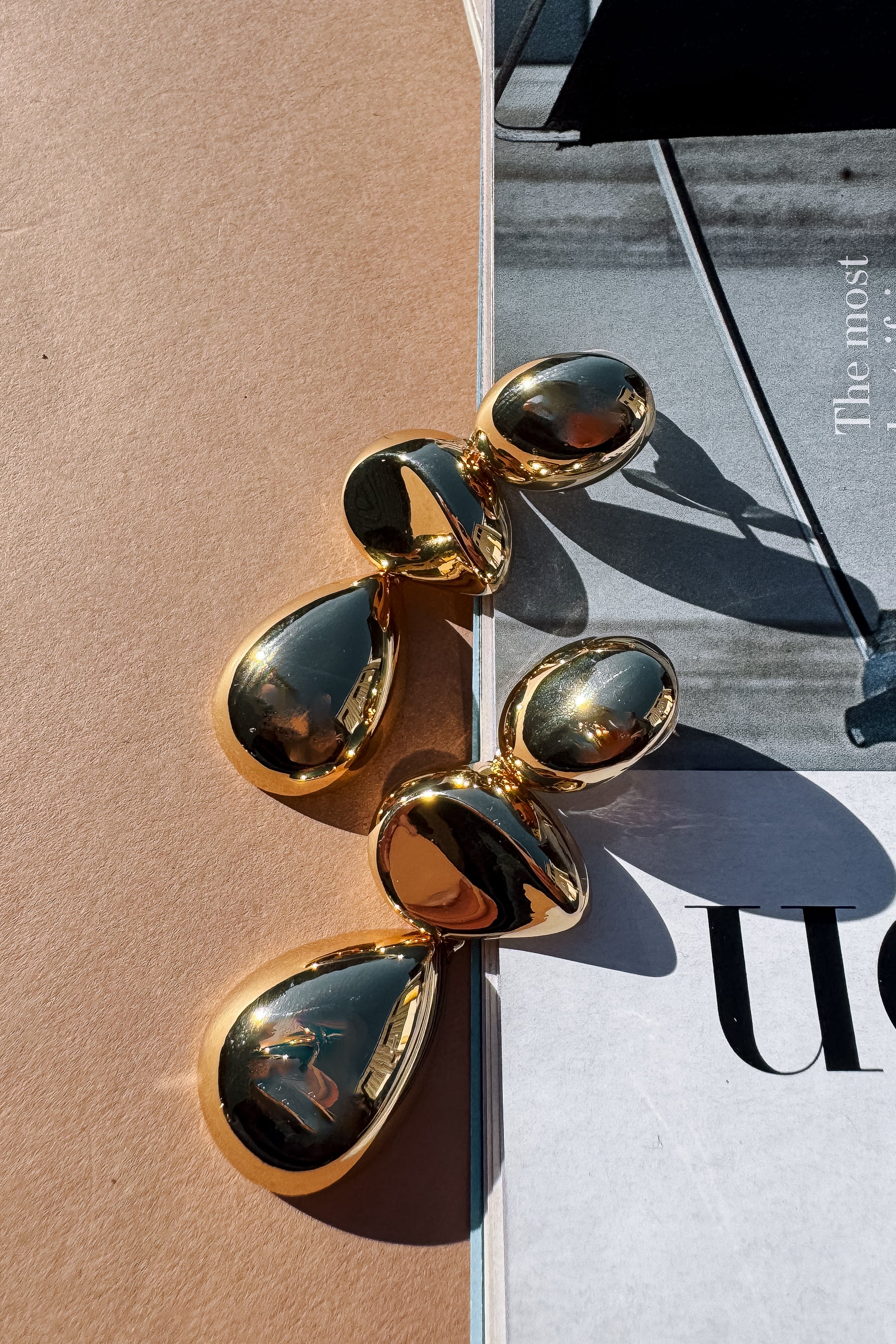 Elevate your accessory game with the Alice Gold Teardrop Dangle Earrings. Featuring brushed gold, dimensional teardrop-shaped medallions linked together, these earrings offer movement, shine, and modern elegance.
