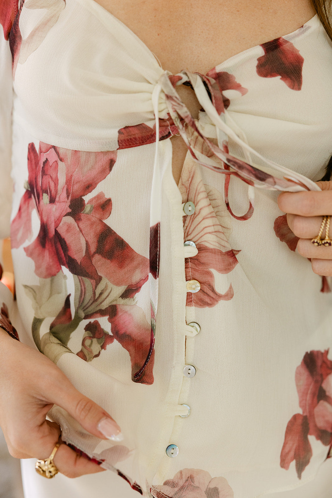 Elegant and eye catching, the Alicia Ivory & Deep Red Floral Top is a romantic statement piece to elevate your everyday style. Crafted from lightweight ivory sheer fabric, this top features a rich deep red multi floral print that adds depth, contrast, and endless charm.