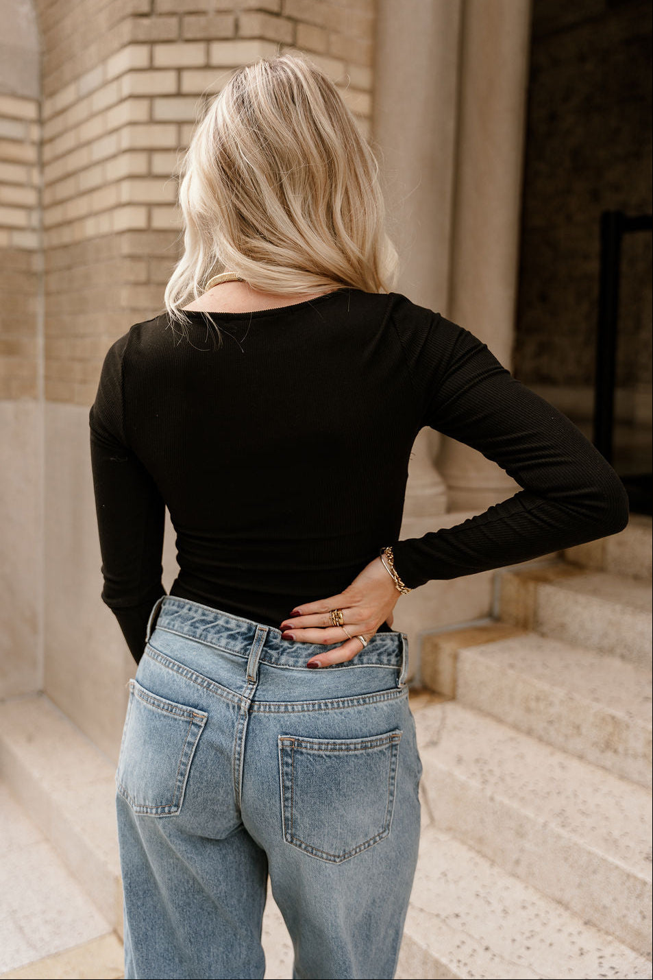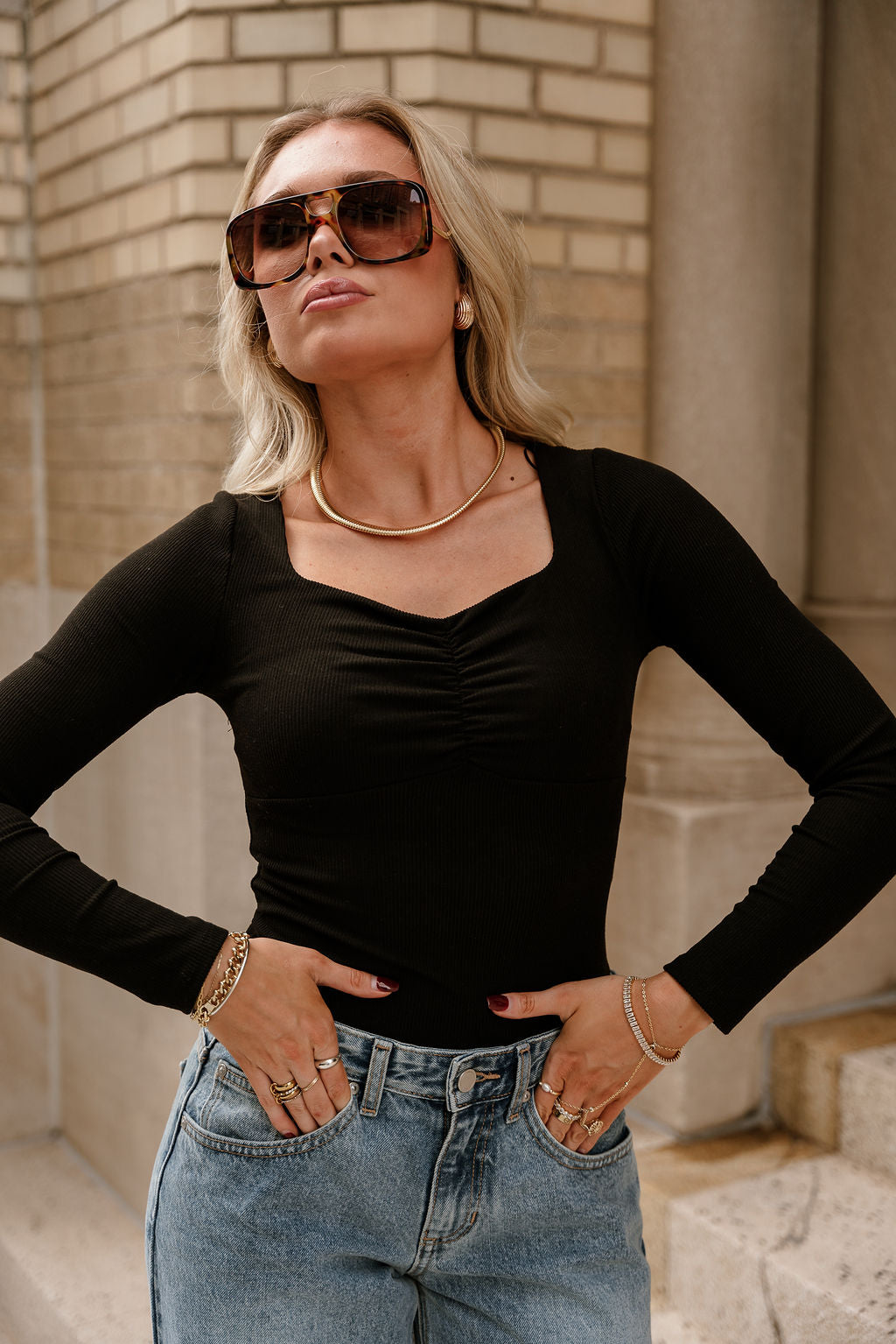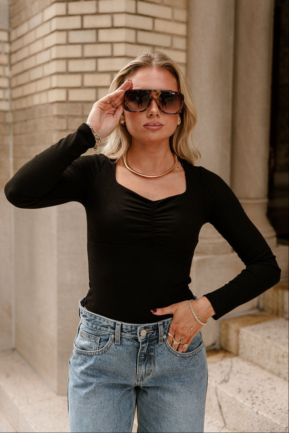A classic scoop neckline highlights the collarbone for a feminine finish, while the long sleeves provide versatile coverage for year-round wear. Whether paired with high-waisted denim, layered under a blazer, or styled with a skirt for a night out, the Alora delivers a polished, modern look with minimal effort.