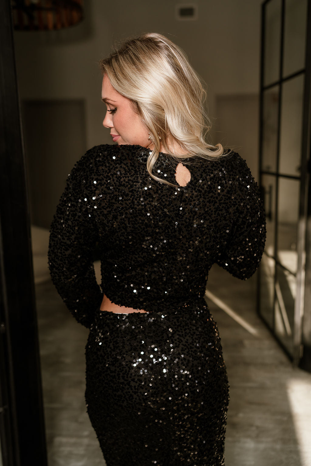 The cropped waist adds a trendy, fashion-forward touch, making it perfect for pairing with high-waisted trousers, skirts, or denim. A classic round neckline keeps the silhouette clean and balanced, while the long sleeves offer an elegant contrast to the bold sequin shine. At the back, a subtle keyhole detail adds an extra note of sophistication and allows for easy, comfortable wear.