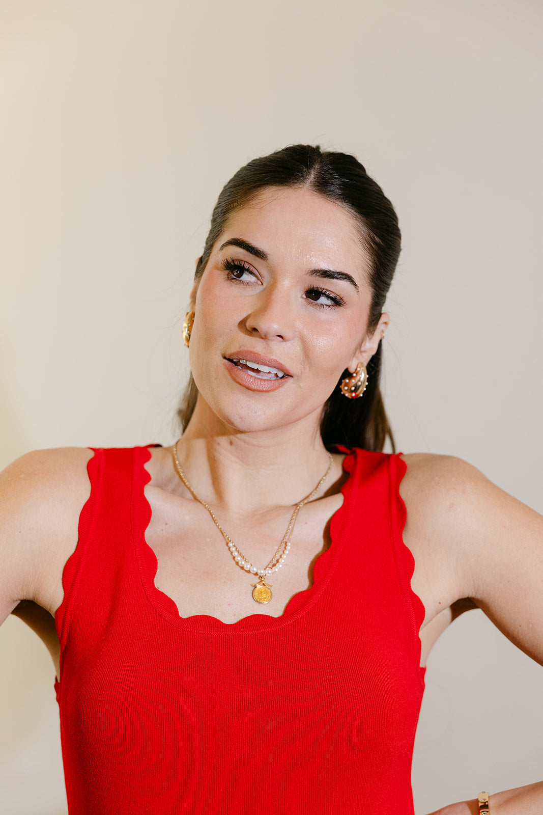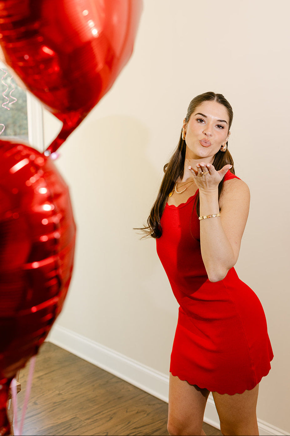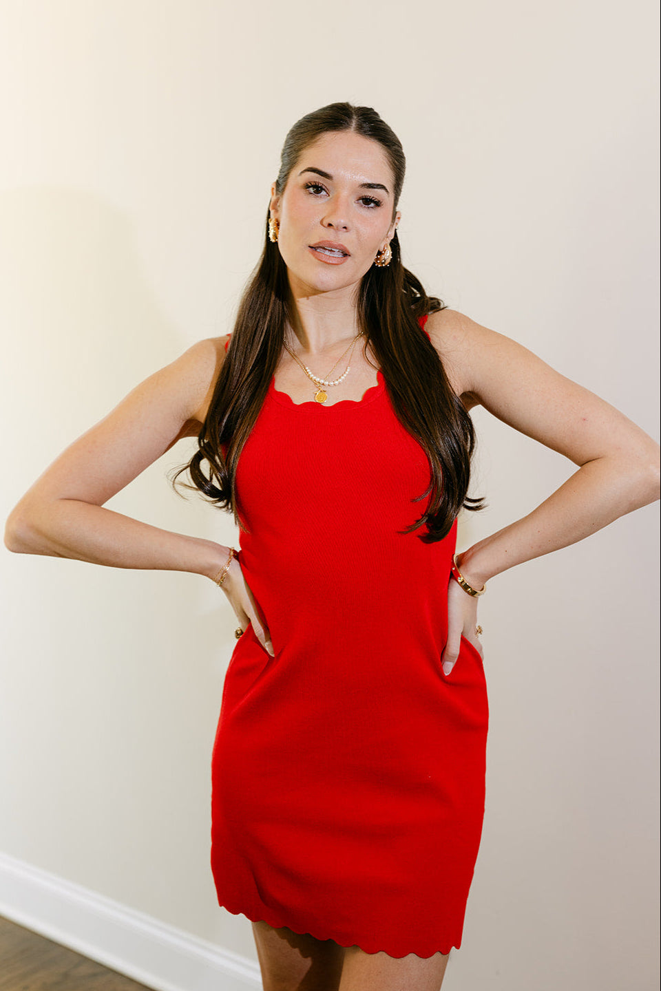 The Amara Red Scalloped Mini Dress is a fun, flattering piece designed to make a statement with ease. Crafted from red ribbed knit fabric, this dress offers a comfortable, figure-skimming fit while still feeling soft and wearable. The scallop trim adds a charming, feminine detail that elevates the simple silhouette.