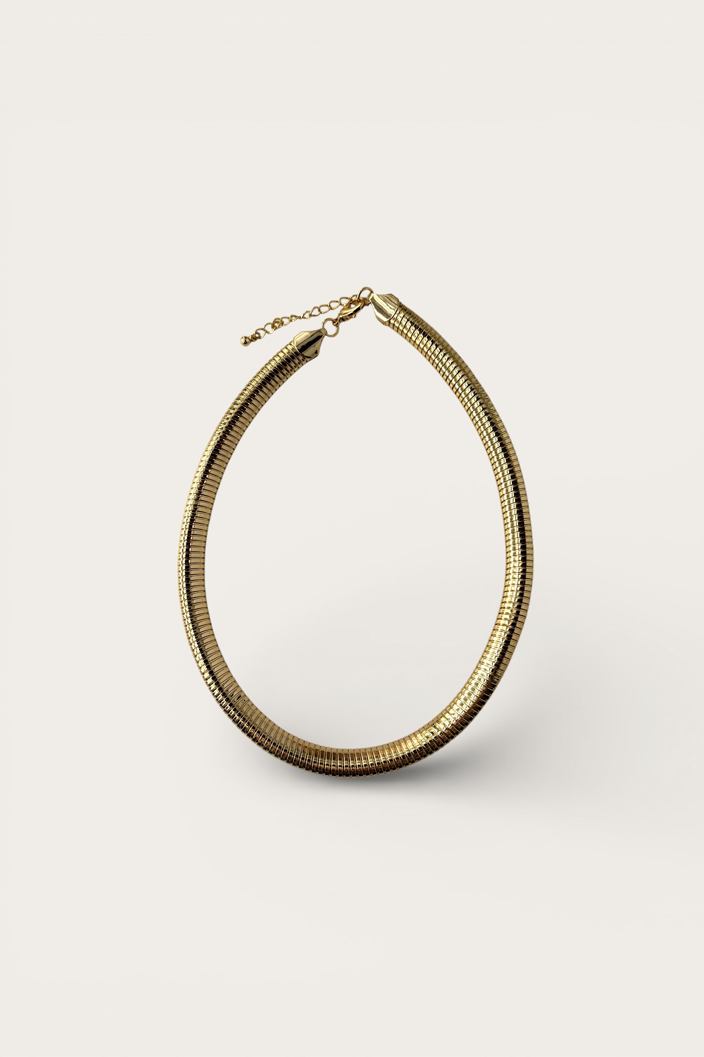Finished with an adjustable clasp closure, the Amora necklace allows for a customizable fit and easy layering with your favorite chains. Wear it on its own for a clean, sophisticated statement or pair it with other necklaces for a chic, stacked look. The flat ribbed design sits smoothly against the neckline, making it perfect for both everyday wear and special occasions.