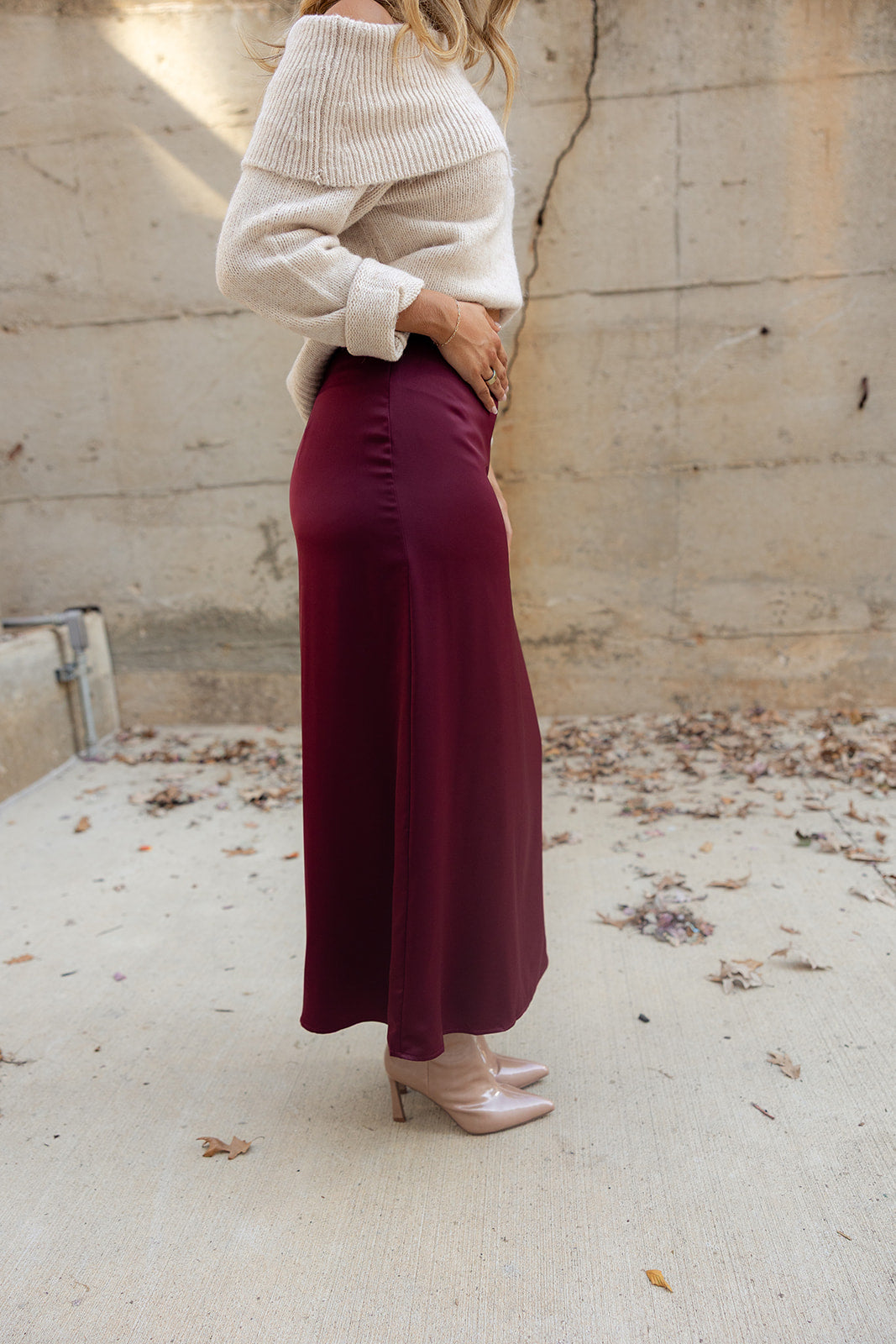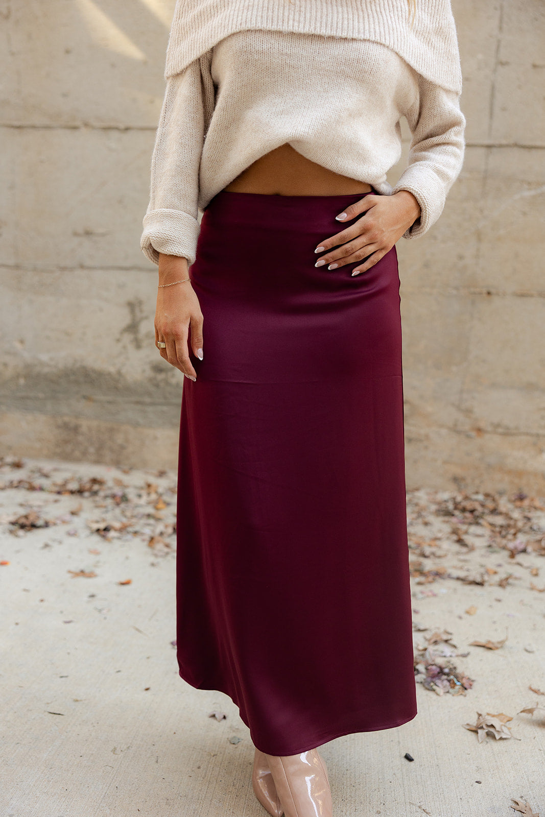 Elevate your wardrobe with the Ana Burgundy Satin Midi Skirt. Crafted from luxurious burgundy satin with a matching lining, this midi-length skirt drapes beautifully for a flattering, elegant silhouette. Finished with a back zipper closure, it’s perfect for dressing up for special occasions or adding a touch of refined sophistication to everyday looks.
