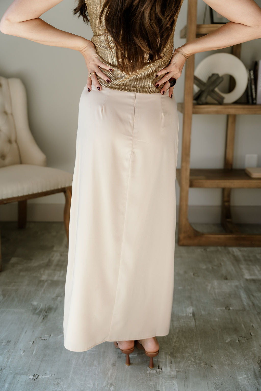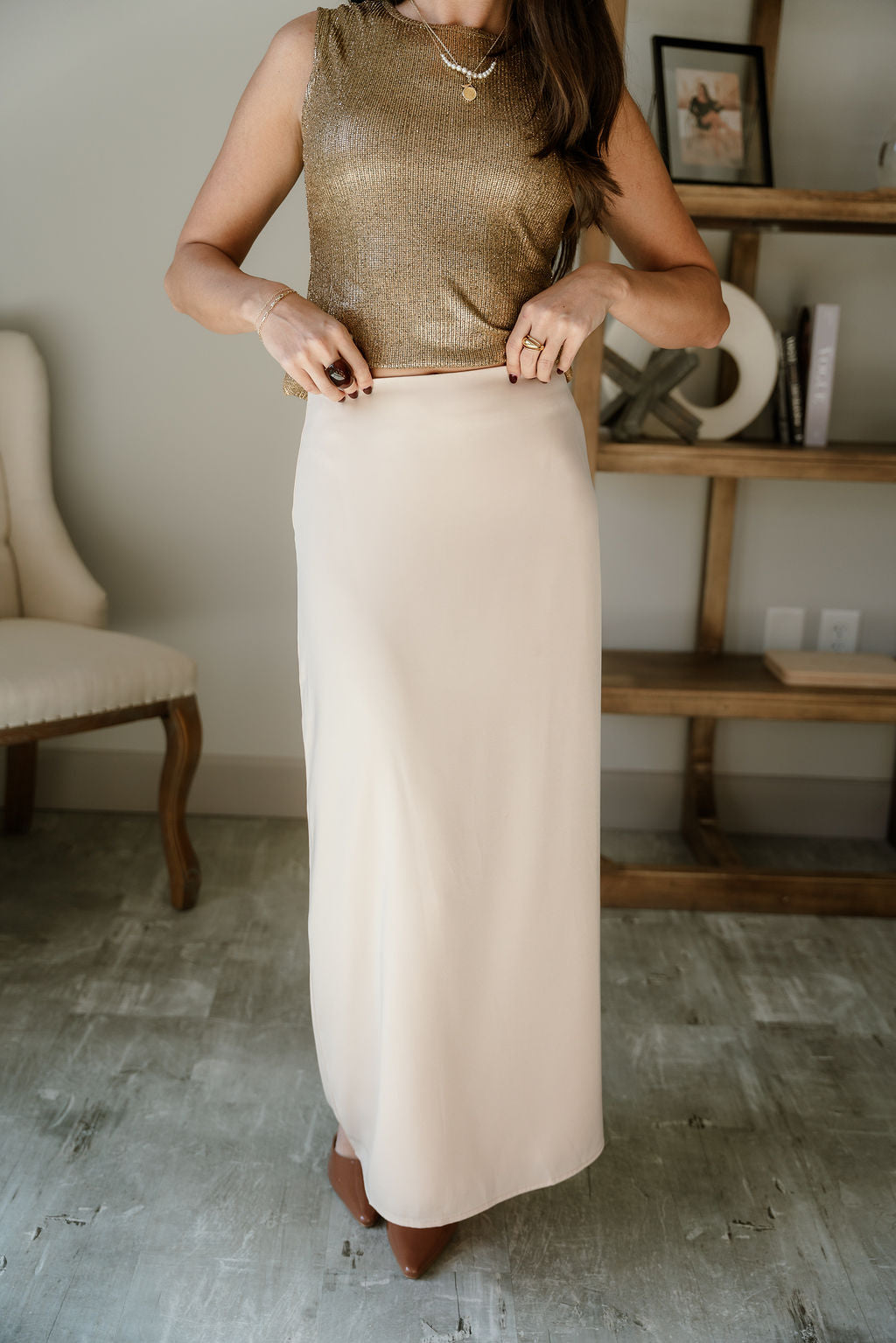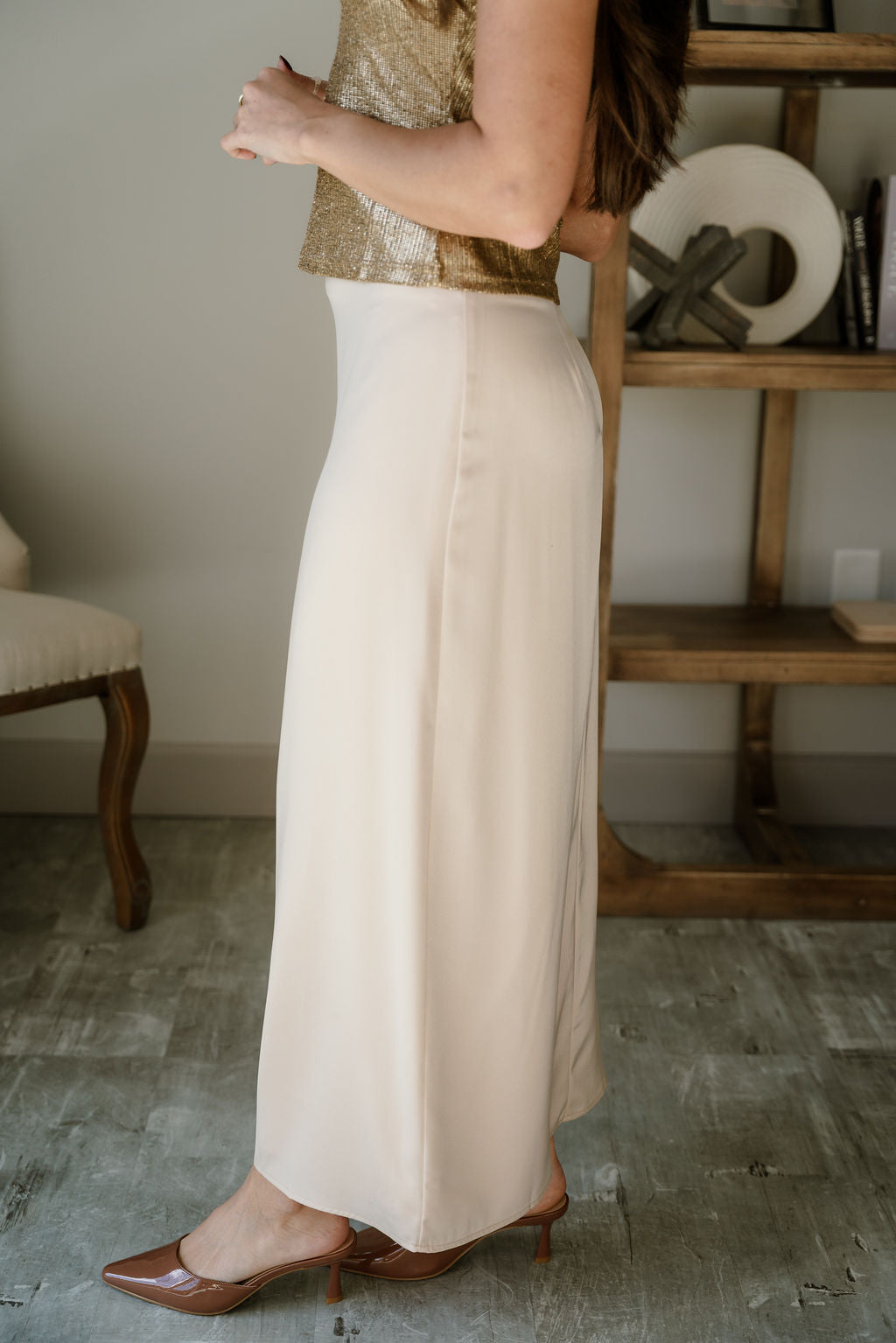 Effortlessly elegant and endlessly versatile, the Ana Cream Satin Midi Skirt brings polished sophistication to any outfit. Designed in a smooth cream satin that glides with every step. This midi length skirt creates a fluid, flattering body that feels both endless and modern.