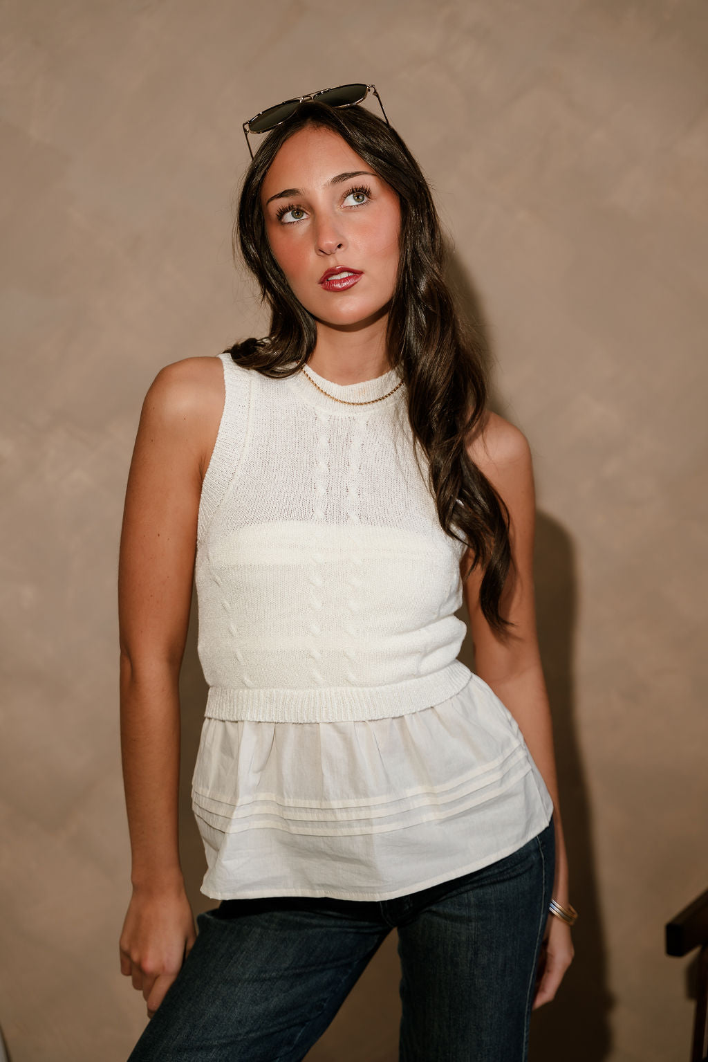 Sleeveless and easy to style, this tank pairs perfectly with jeans, skirts, or tailored pants. Whether worn on its own or layered under jackets and cardigans, the Anya Tank creates an effortlessly polished look that works for both casual and dressed-up occasions.