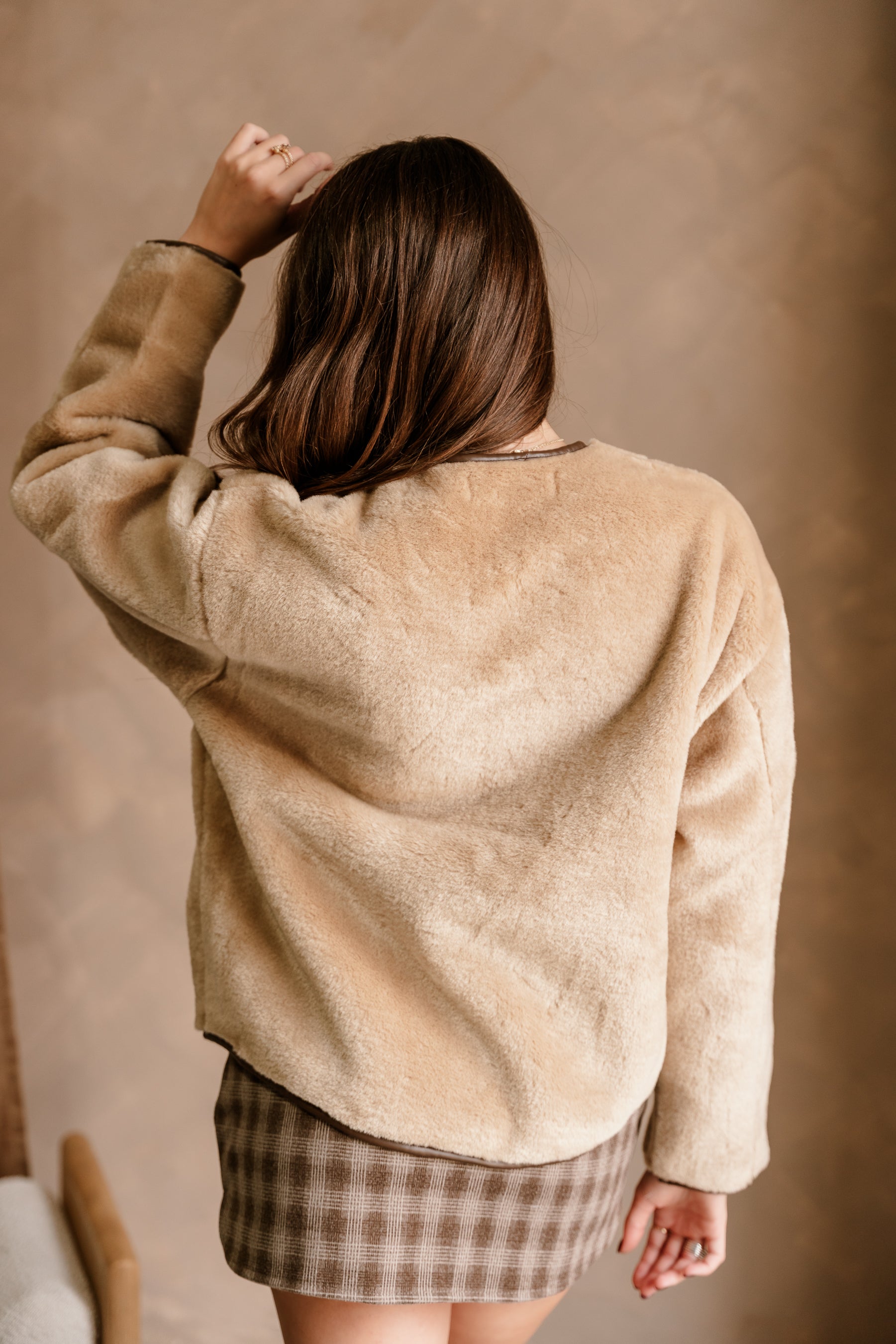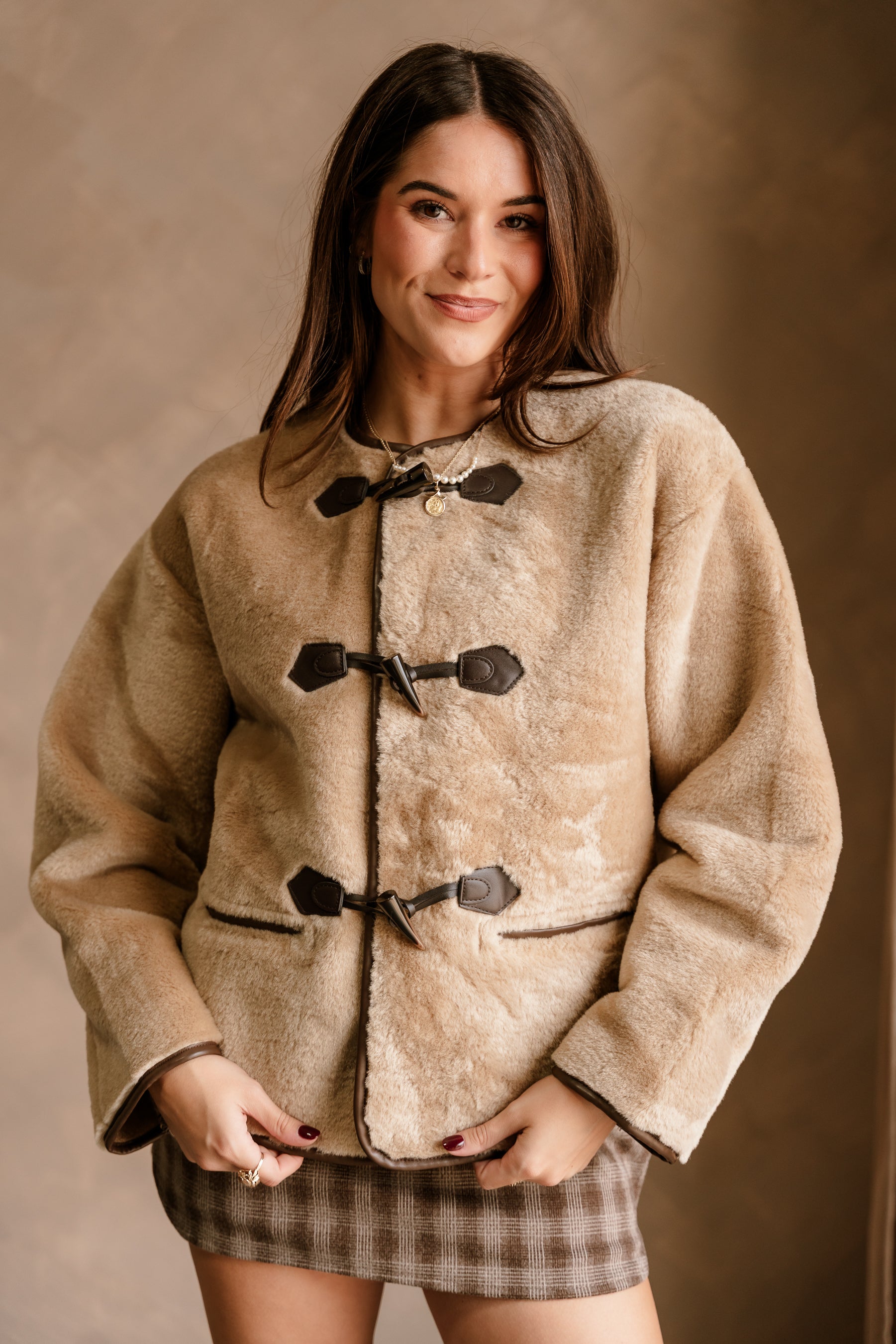 The Ariyah Brown & Tan Faux Fur Jacket is a luxurious, statement-making outer layer. Crafted from plush tan faux fur and accented with rich brown leather trim details, it features a round neckline, long sleeves, and convenient front pockets. Finished with a brown acrylic claw hook closure, this jacket blends bold design with cozy warmth—perfect for elevating any cold-weather outfit.