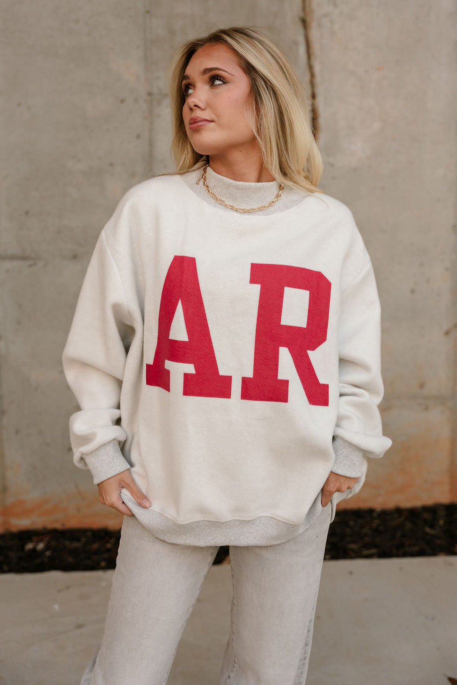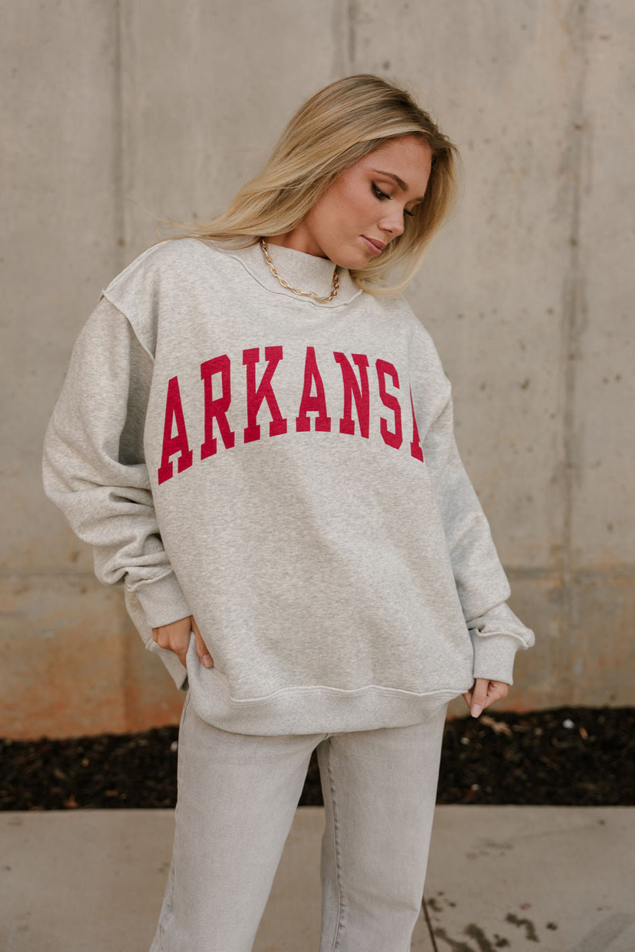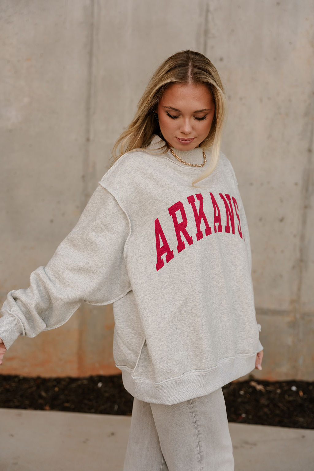 Show off your state pride in style with the Arkansas Reversible Mock Neck Sweatshirt — a cozy and versatile essential with a sporty twist. Made from soft heather grey fabric, this sweatshirt features a bold "ARKANSAS" graphic in red on one side and a classic "AR" graphic in red and navy blue on the reverse, giving you two standout looks in one. The mock neck adds a touch of warmth and structure, while the long sleeves offer all-day comfort. Whether you're cheering on your team or layering up for everyday wear. This reversible Arkansas Mock Neck Sweatshirt brings both spirit and style to your wardrobe.