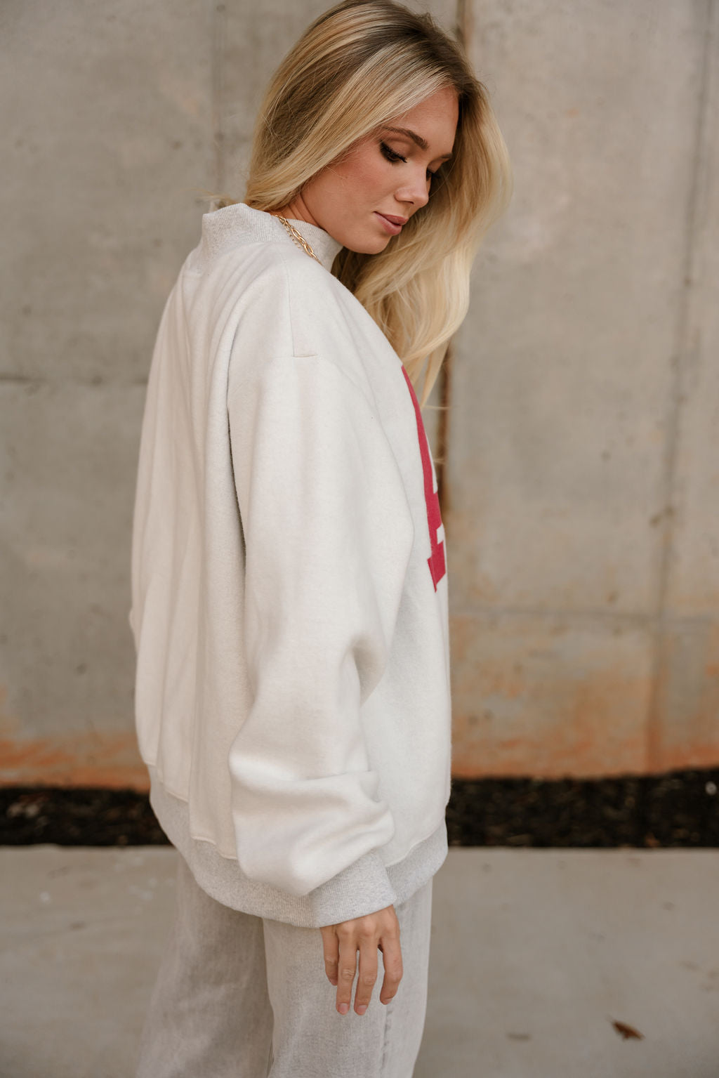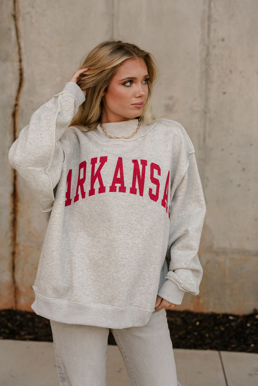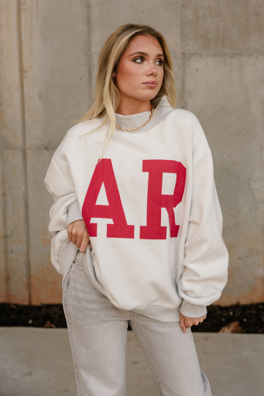 Show off your state pride in style with the Arkansas Reversible Mock Neck Sweatshirt — a cozy and versatile essential with a sporty twist. Made from soft heather grey fabric, this sweatshirt features a bold "ARKANSAS" graphic in red on one side and a classic "AR" graphic in red and navy blue on the reverse, giving you two standout looks in one. The mock neck adds a touch of warmth and structure, while the long sleeves offer all-day comfort. Whether you're cheering on your team or layering up for everyday wear. This reversible Arkansas Mock Neck Sweatshirt brings both spirit and style to your wardrobe.