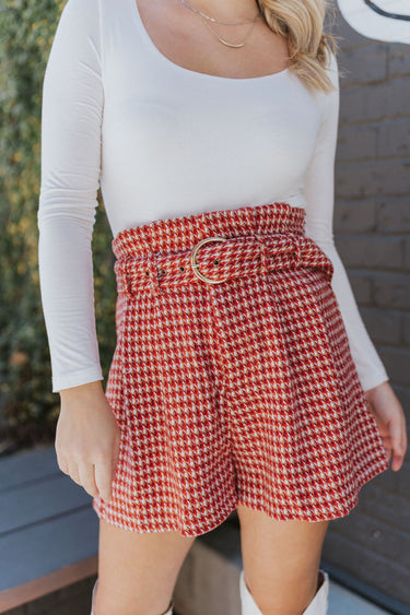 Rust-colored Tweed Shorts bring style and polish to your wardrobe. First, the rust-colored houndstooth tweed adds a classic yet modern look. Moreover, the high-rise waist creates a flattering silhouette. Additionally, the matching belt with gold buckle draws attention to the waist. Therefore, the front zipper and hook closure provide secure and comfortable wear. Overall, these shorts work for casual outings or semi-formal events.