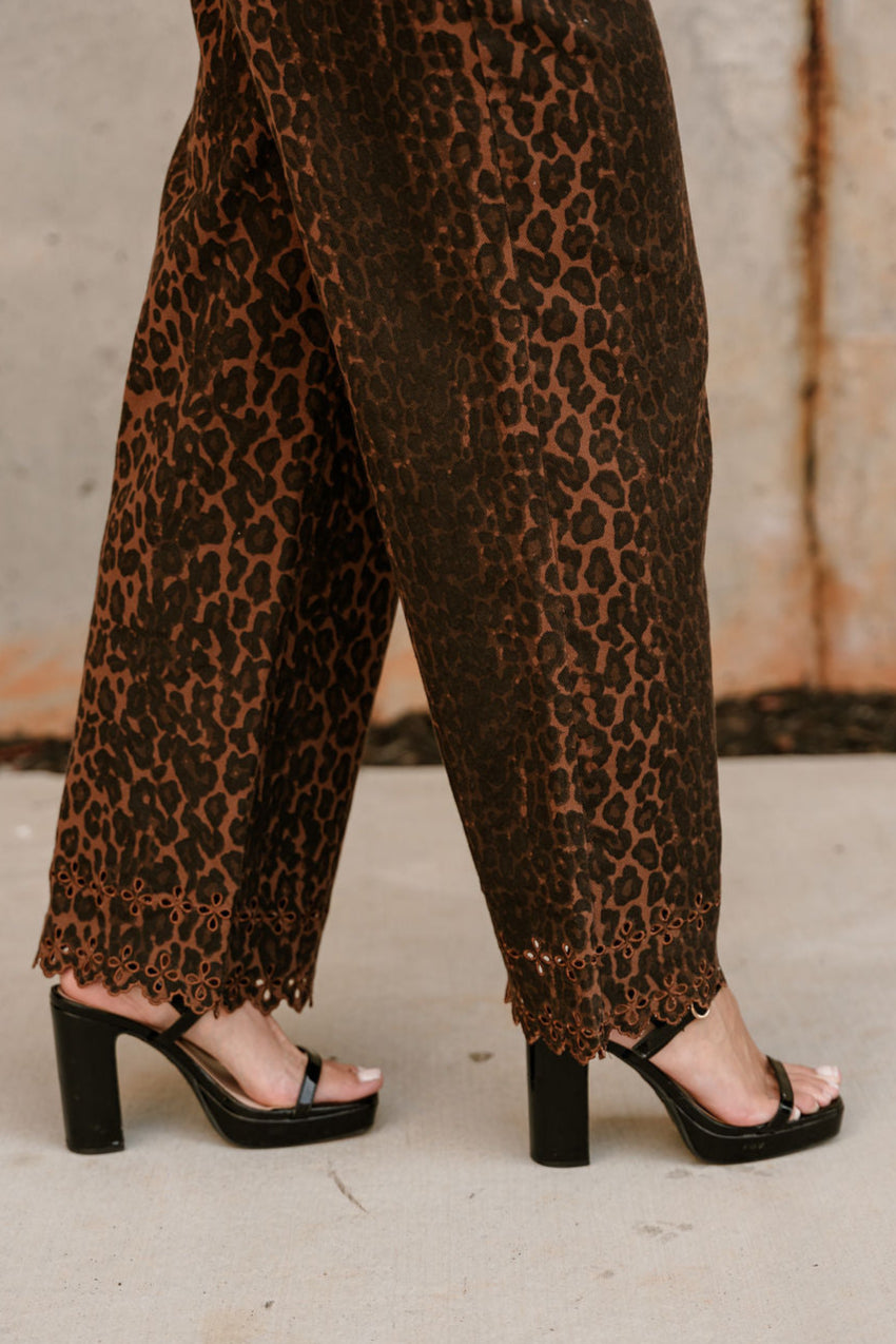 Step into effortless style with the Asheville Cheetah Eyelet Wide Leg Jeans. Crafted from lightweight cheetah-print denim, these wide-leg jeans feature playful eyelet trim detailing and a flattering, relaxed silhouette. Functional front and back pockets, belt loops, and a front zipper with button closure make them as practical as they are stylish. Perfect for pairing with tees, blouses, or cropped tops, these cheetah print wide-leg jeans add a bold, trendy touch to any wardrobe.