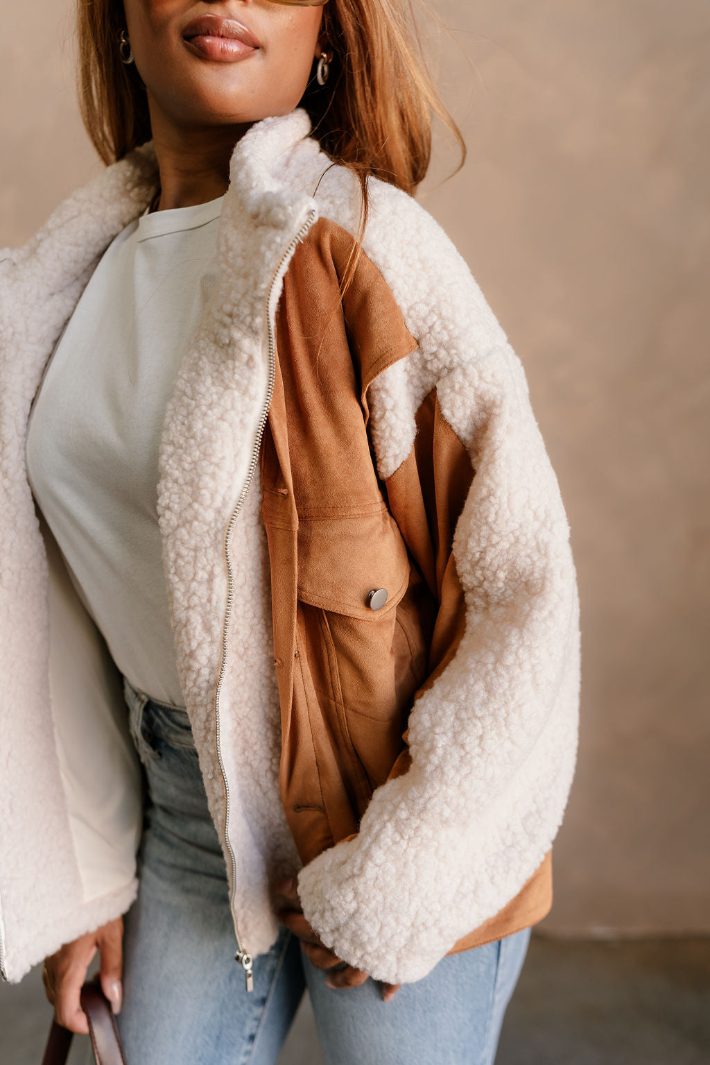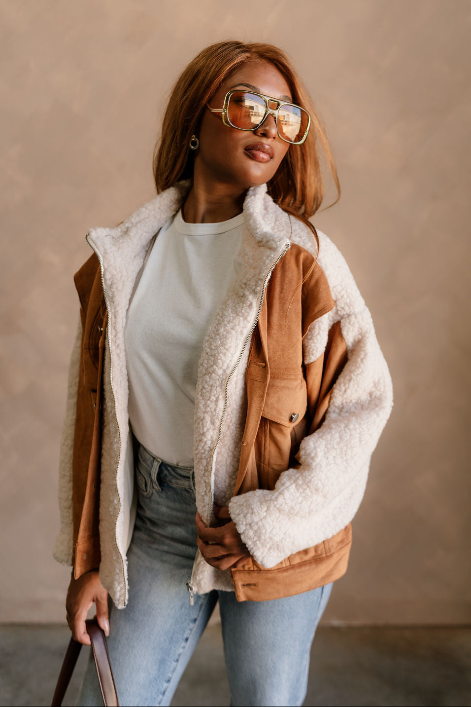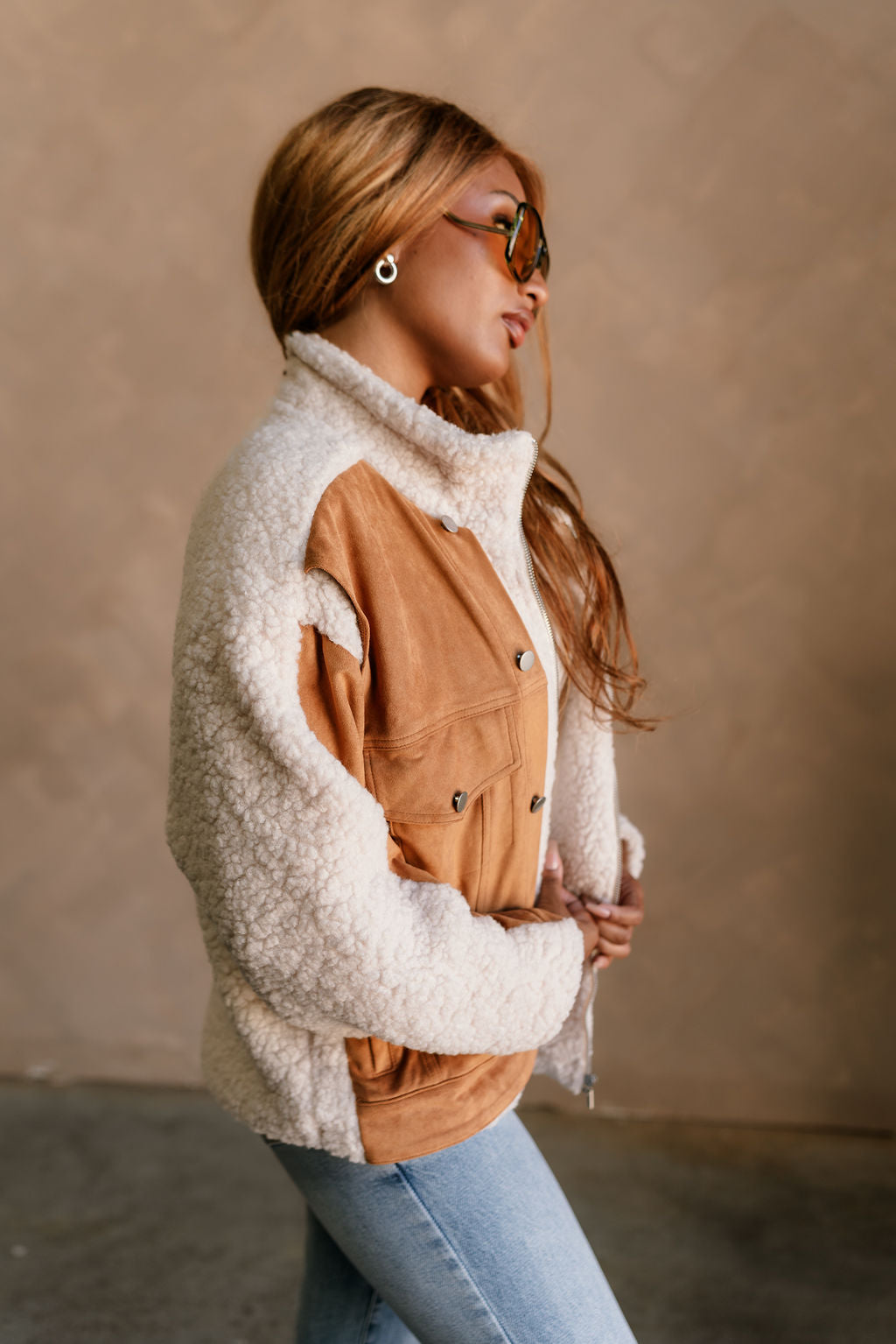 The Ashland Camel Suede & Sherpa Jacket delivers the perfect mix of cozy warmth and elevated style. Designed with a blend of cream sherpa and camel suede, this jacket offers a soft, plush feel with eye-catching contrast. The high neckline features an adjustable drawstring for added warmth, while the front zipper and silver buttons create a functional and stylish closure.