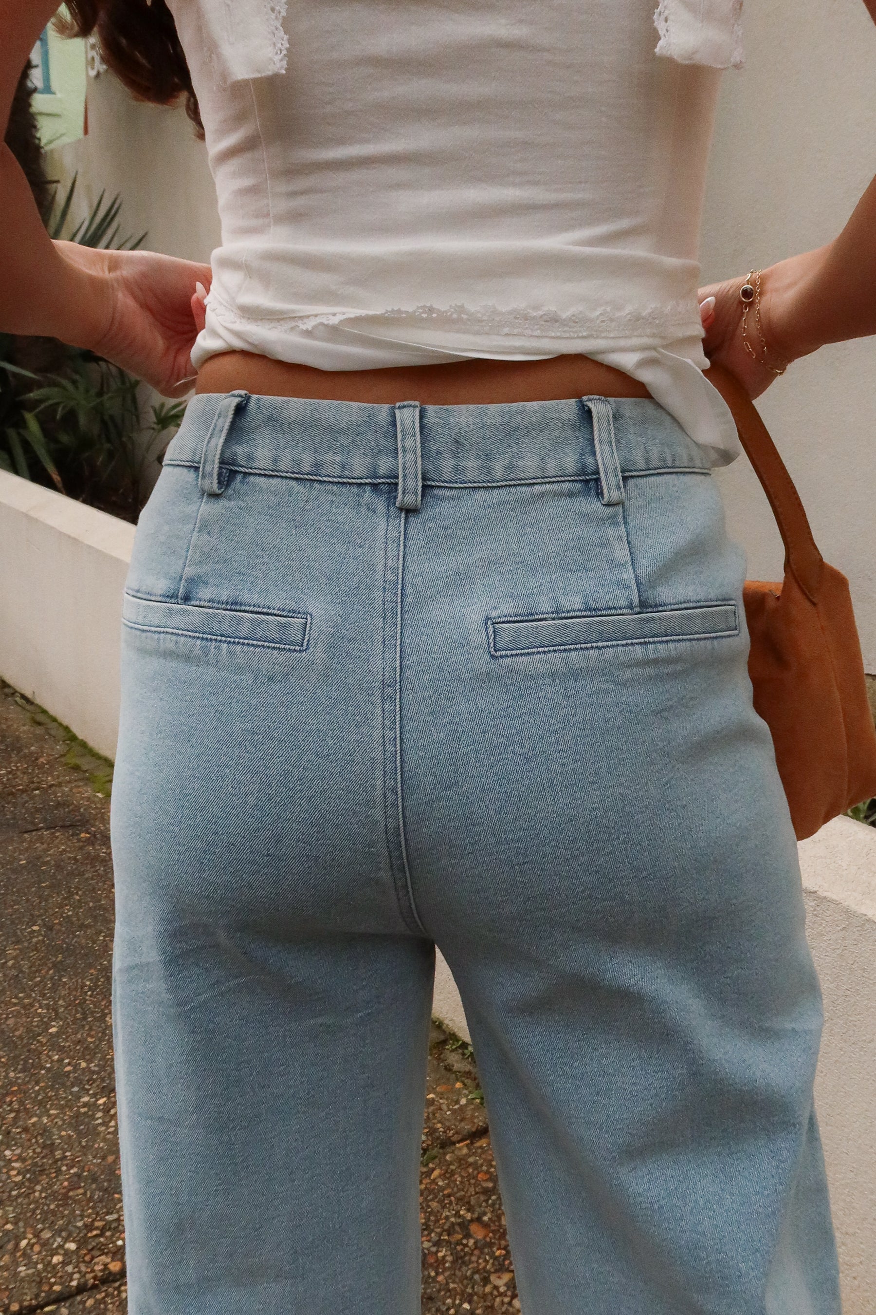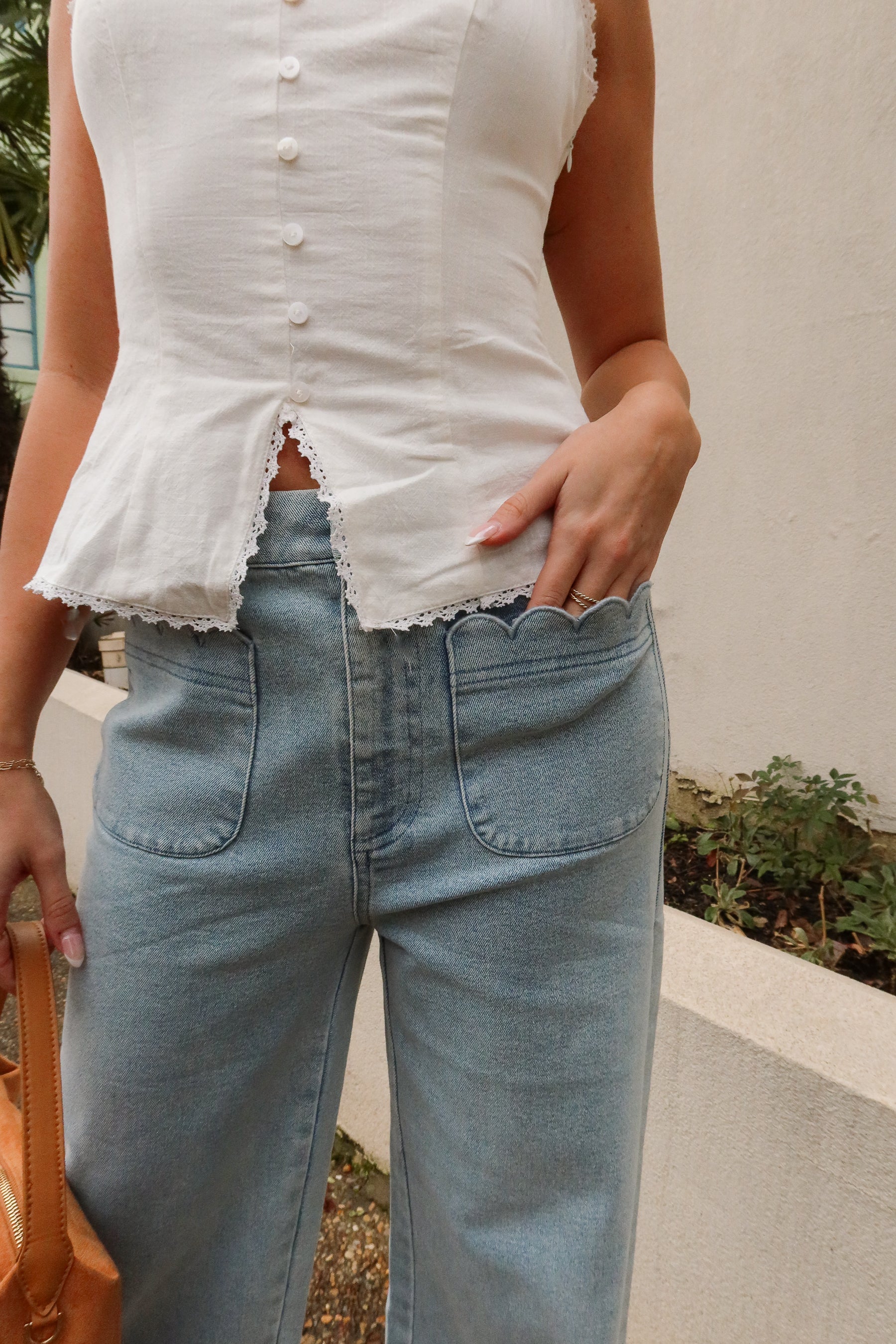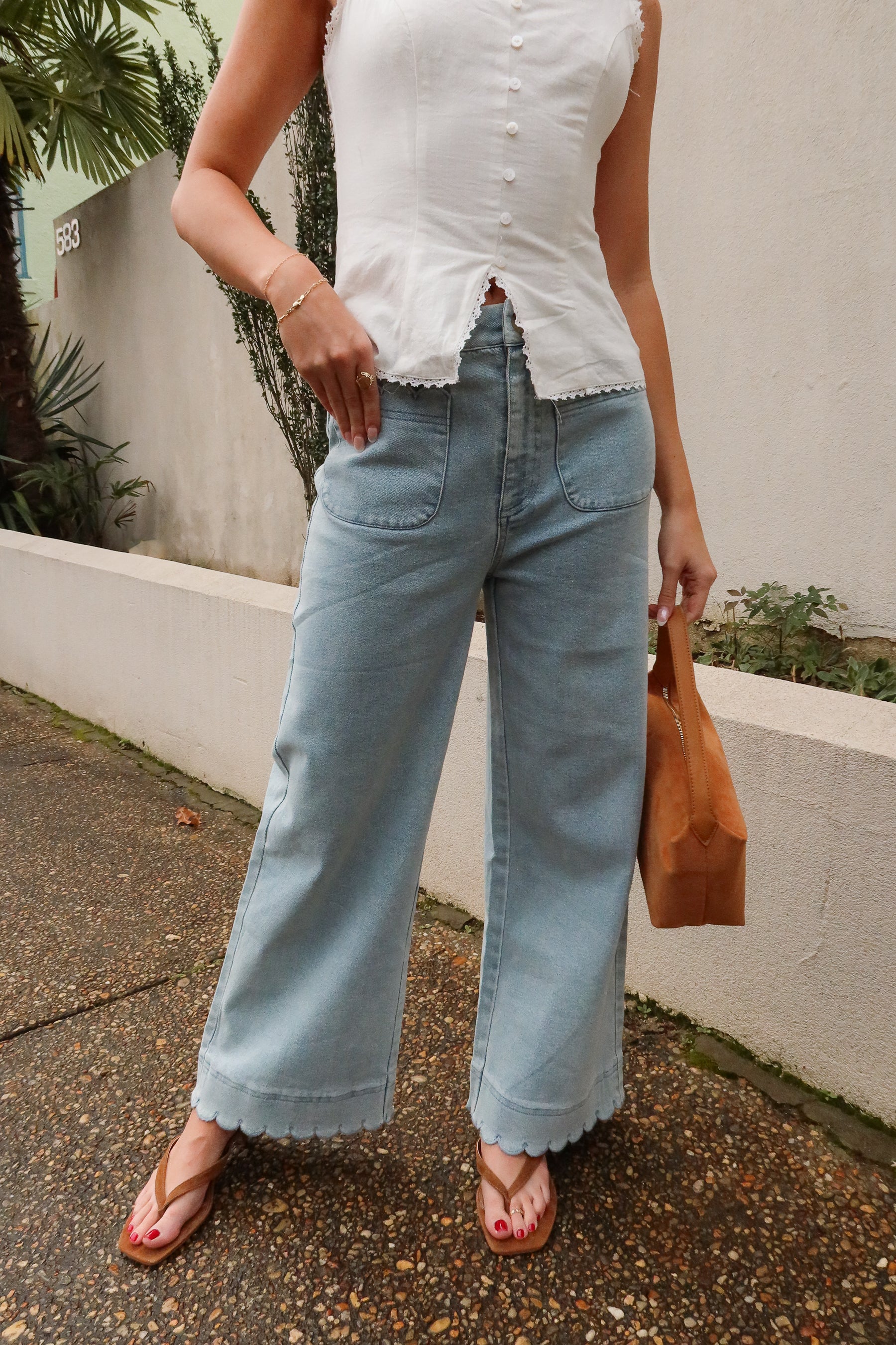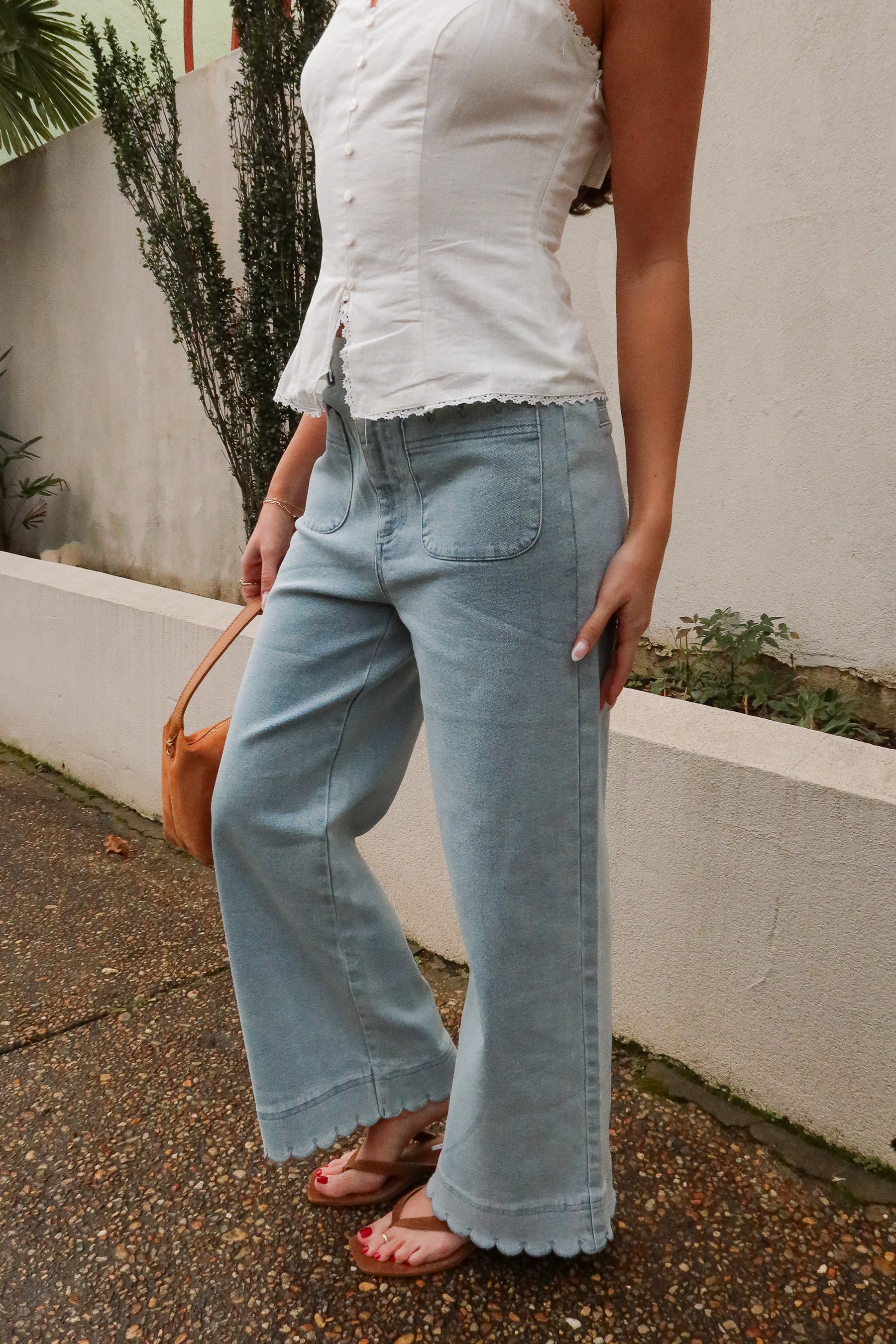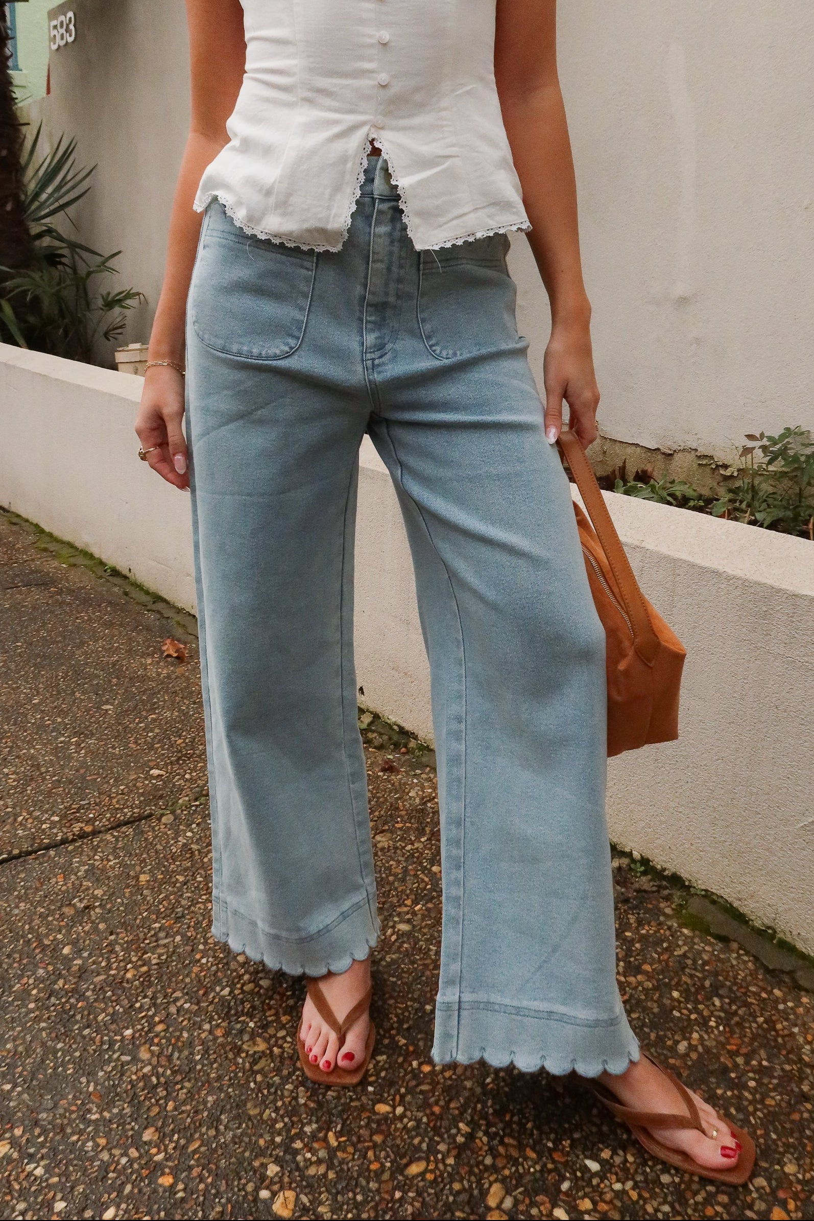 Playful details meet everyday denim in the Ashleigh Blue Denim Scalloped Pants. Designed in light wash denim fabric, these statement pants feature a flattering wide leg silhouette that creates an elongated, easy fit. The standout scallop hem adds a feminine finish, while matching scallop front pockets bring a coordinated touch that sets this pair apart from your classic jeans.