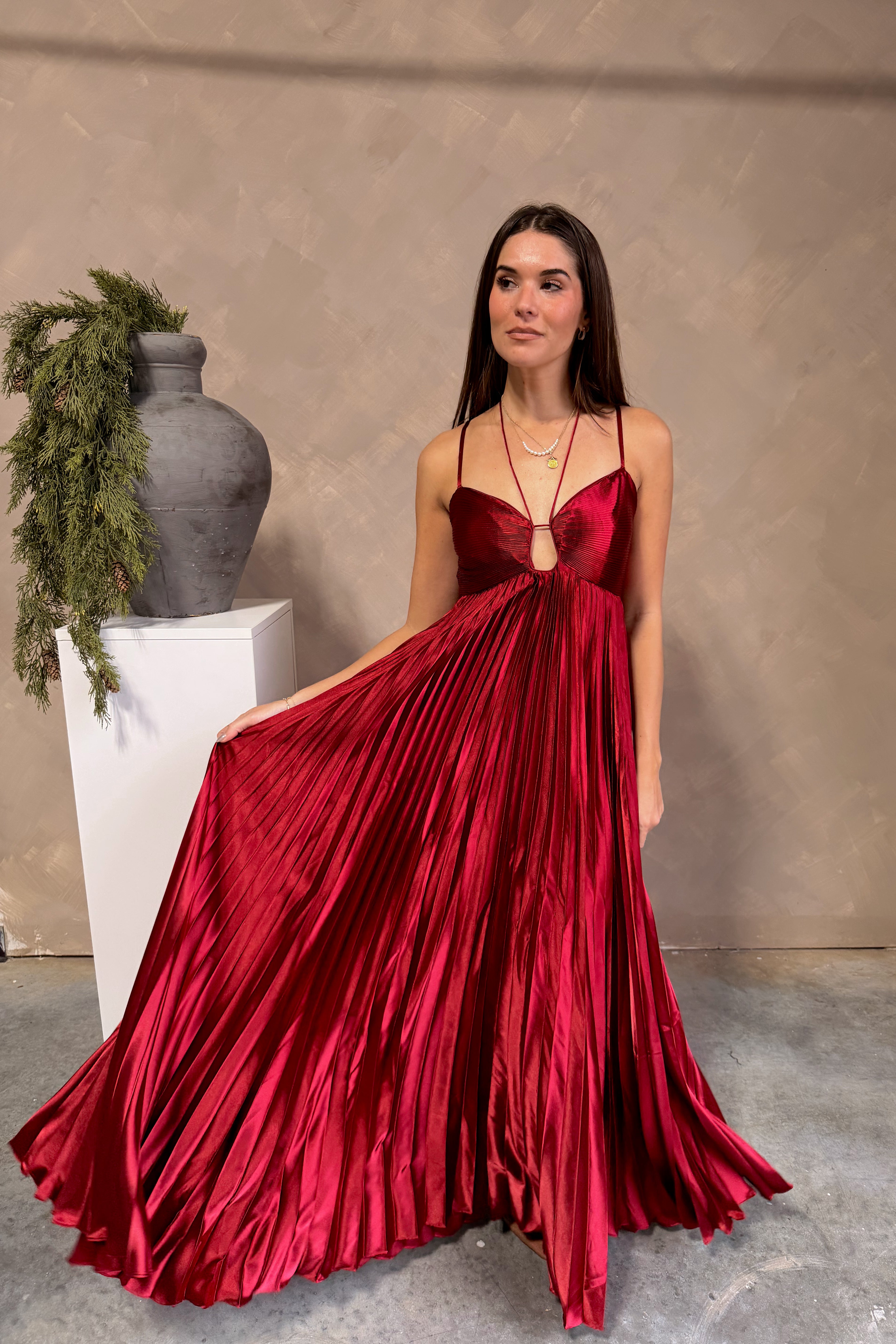 The Aurora Burgundy Pleated Satin Maxi Dress brings effortless movement and rich color to your next special occasion. Crafted with burgundy satin pleated fabric, this dress catches the light beautifully while offering an ultra-flowy silhouette. The maxi length and upper pleated details create a refined, eye-catching shape, while the adjustable straps and sleeveless design ensure a comfortable, customizable fit.