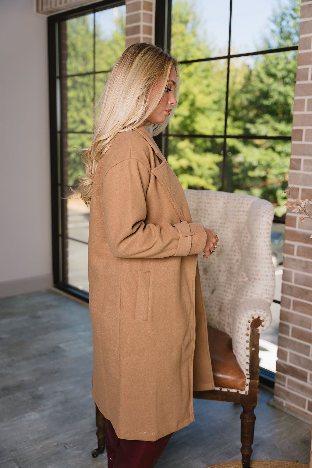 Designed for both style and function, the Ava Camel Button-Up Midi Coat features long sleeves with buttoned wrists and side pockets for everyday convenience. Pair it with denim and boots for a casual day out, or layer it over a dress for an elevated look that works from morning meetings to evening dinners.