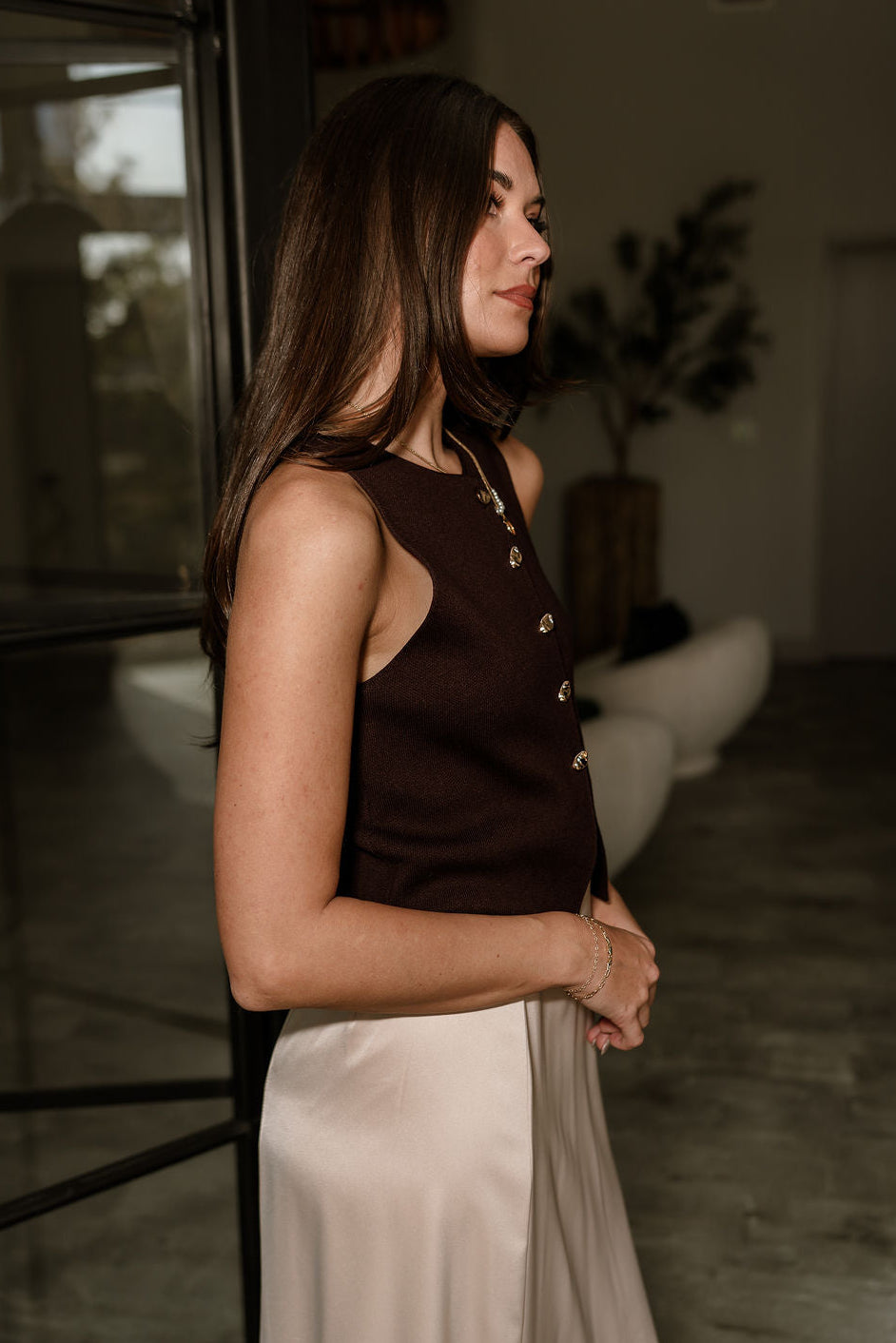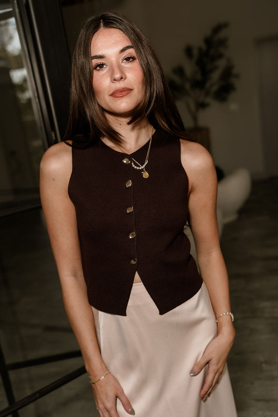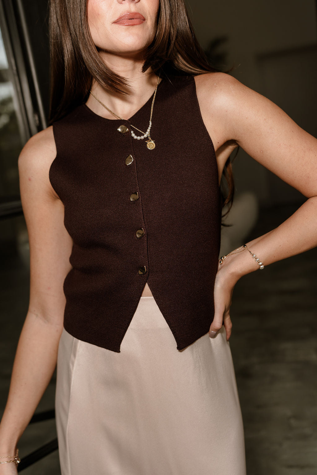 Add a touch of timeless charm to your wardrobe with the Ayla Dark Brown & Gold Vest, a polished layering piece designed to elevate any outfit. Crafted from soft dark brown knit fabric, this vest offers a cozy yet lightweight feel, making it perfect for year-round styling. The rich, warm hue brings depth and versatility, pairing effortlessly with blouses, tees, and long-sleeve tops alike.