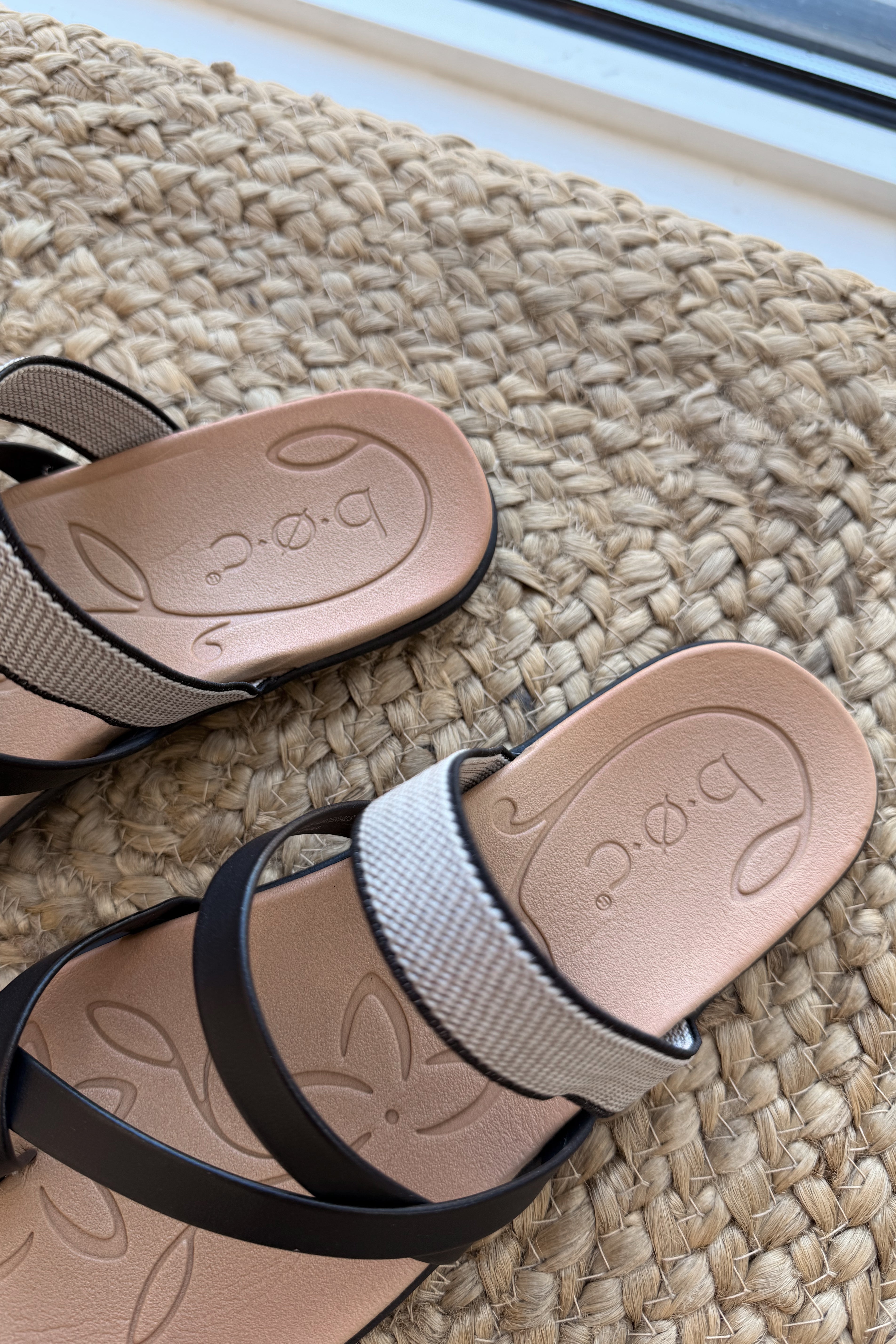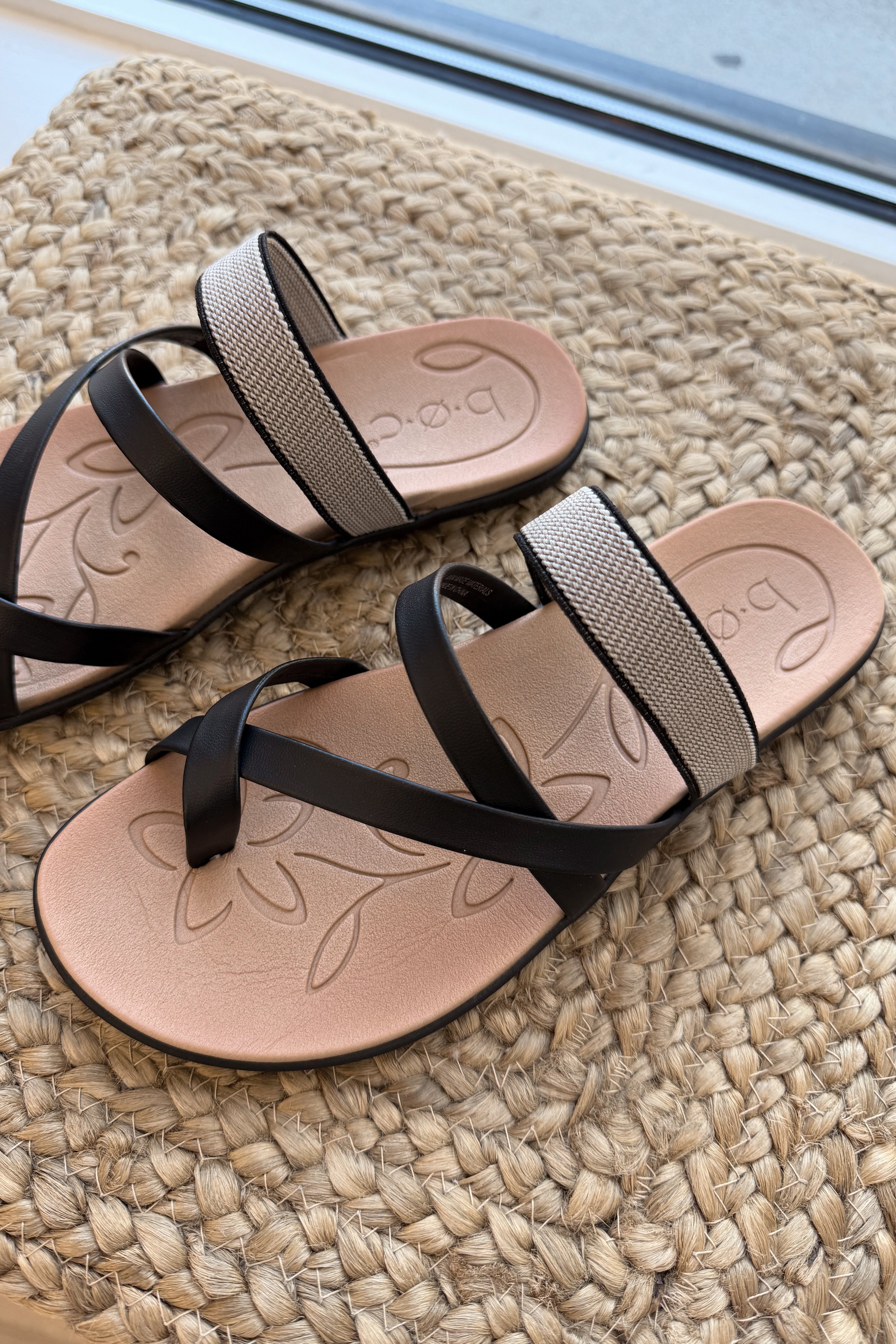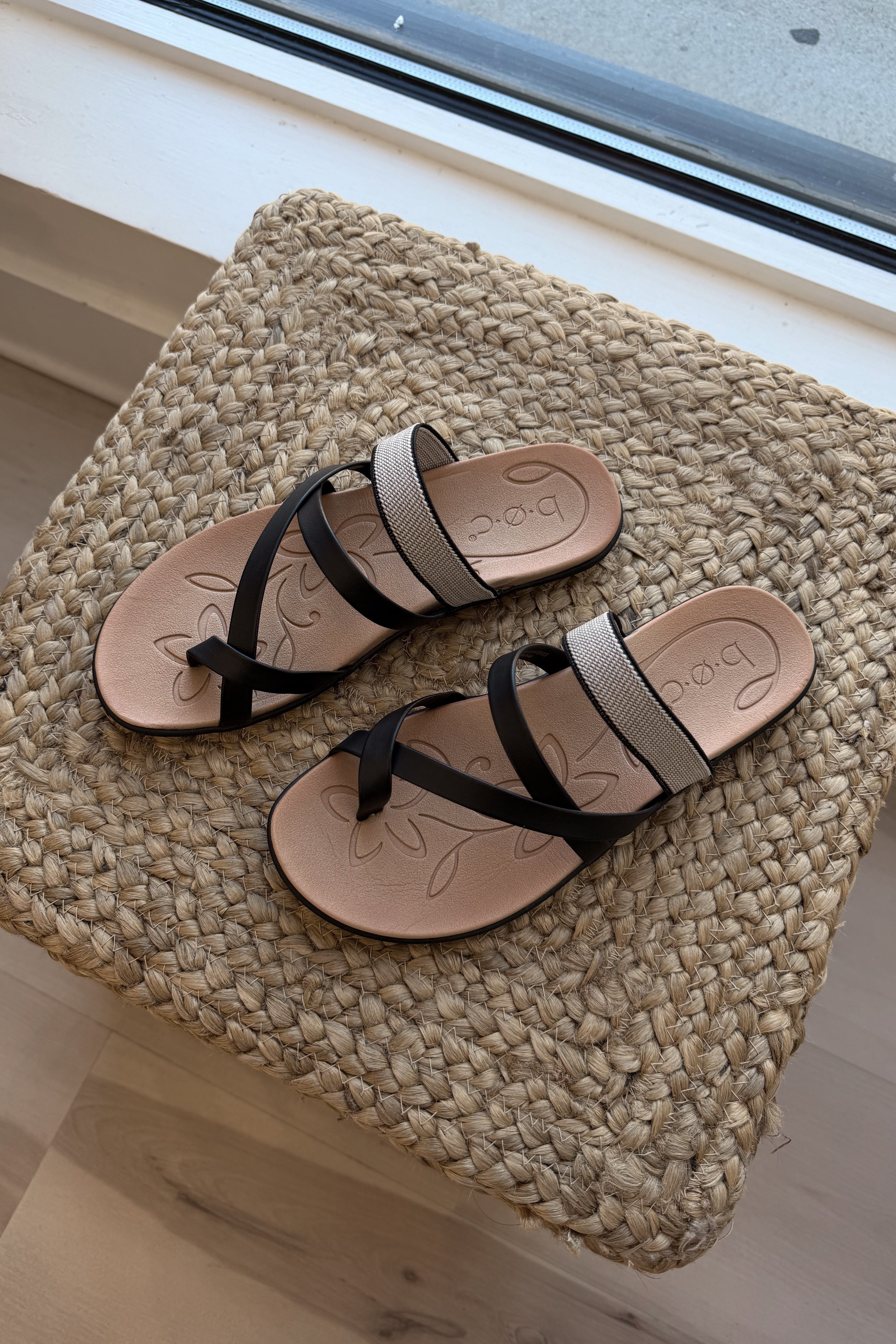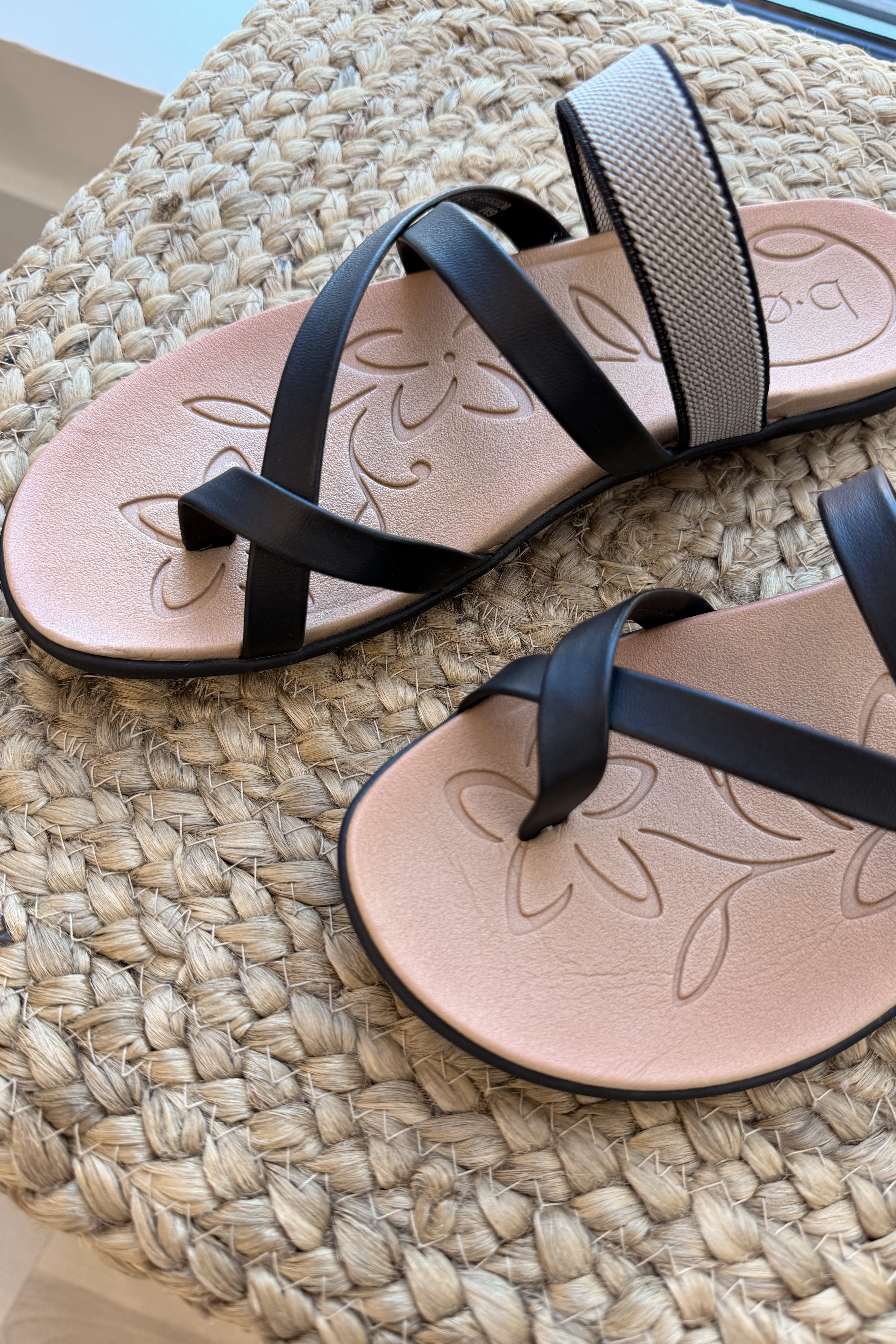 Effortlessly versatile with a touch of texture, the B.O.C. Halena Black & Natural Strappy Sandal is the perfect blend of casual and chic. Designed with a sleek black faux leather upper, this sandal offers a timeless look that pairs easily with any outfit.