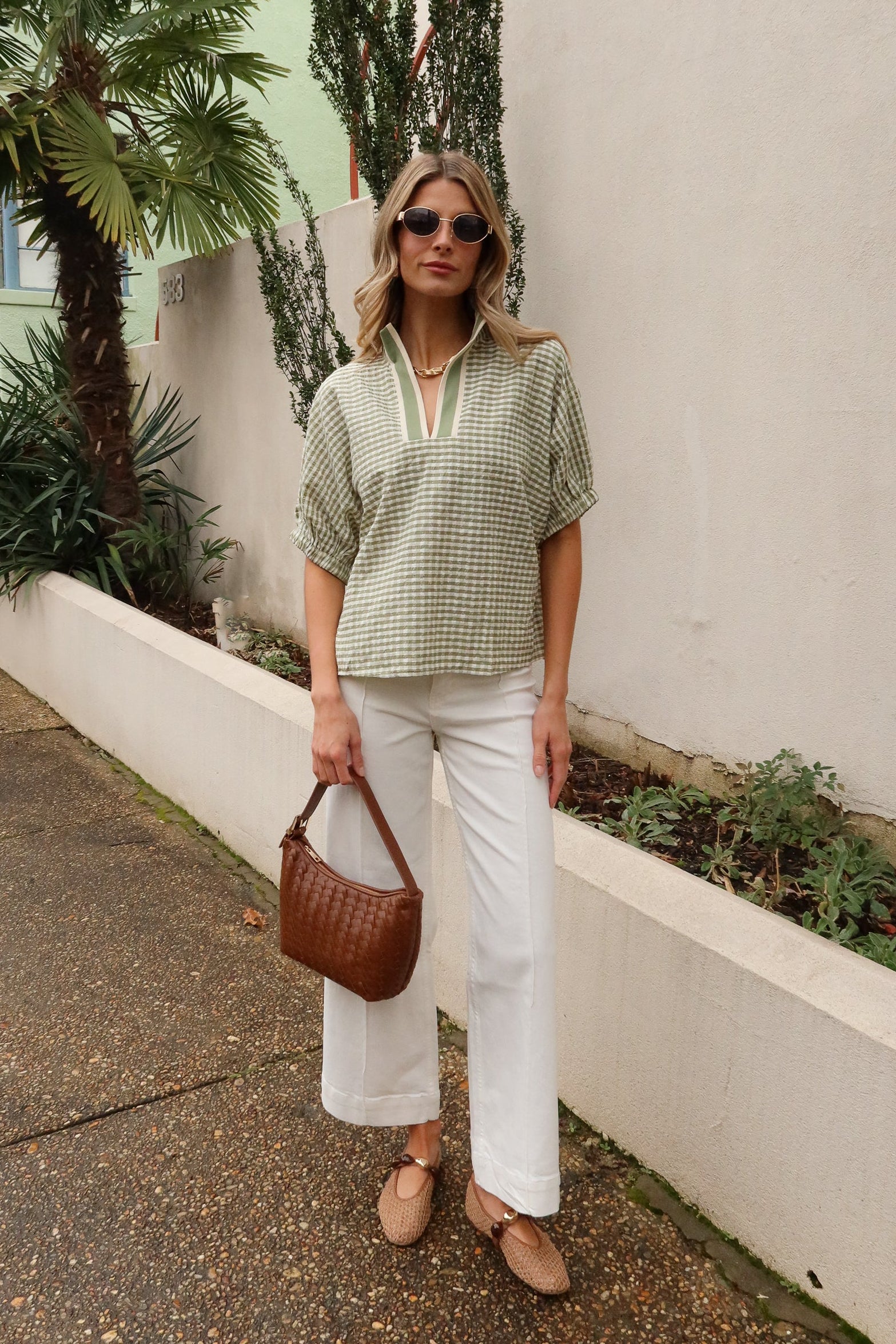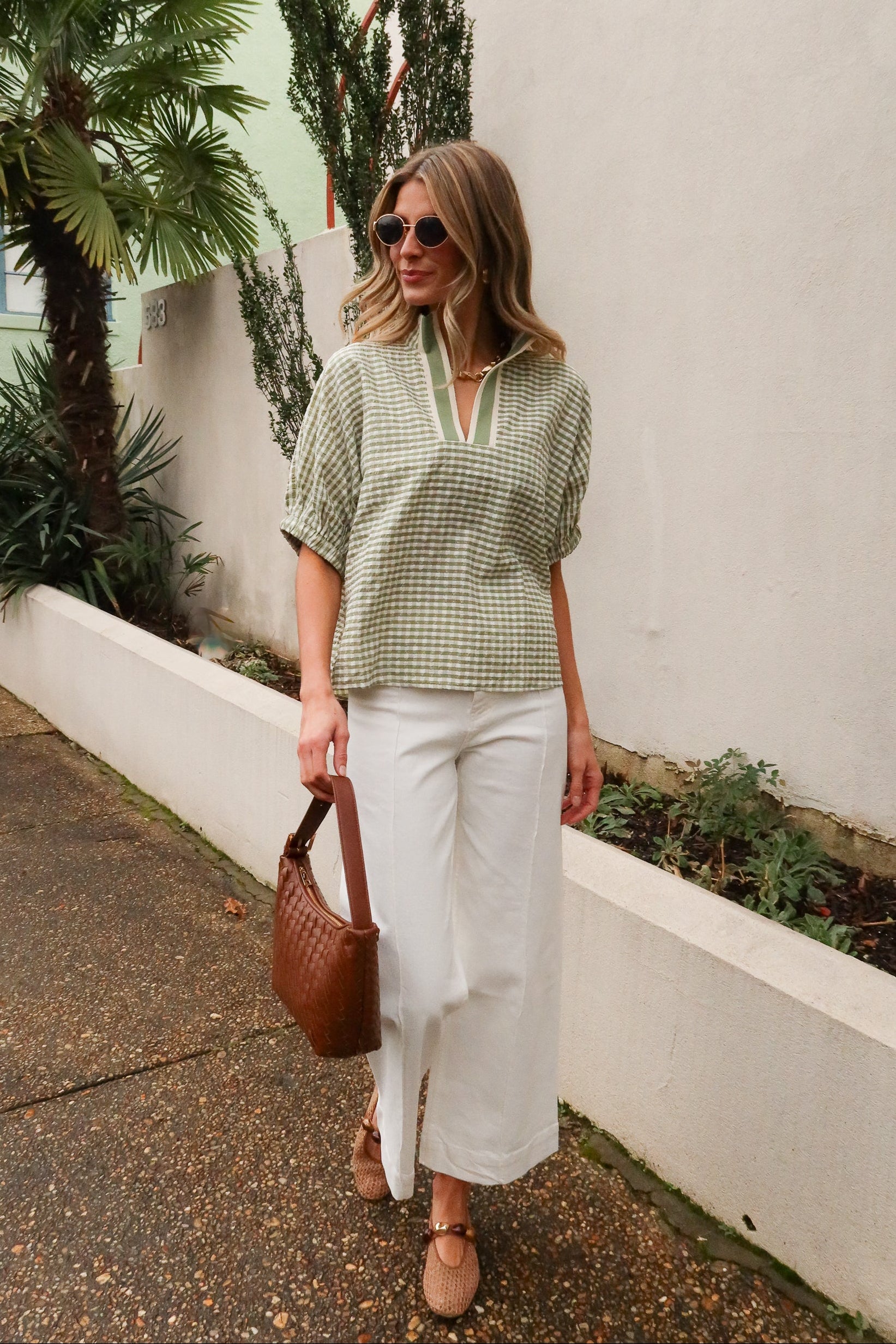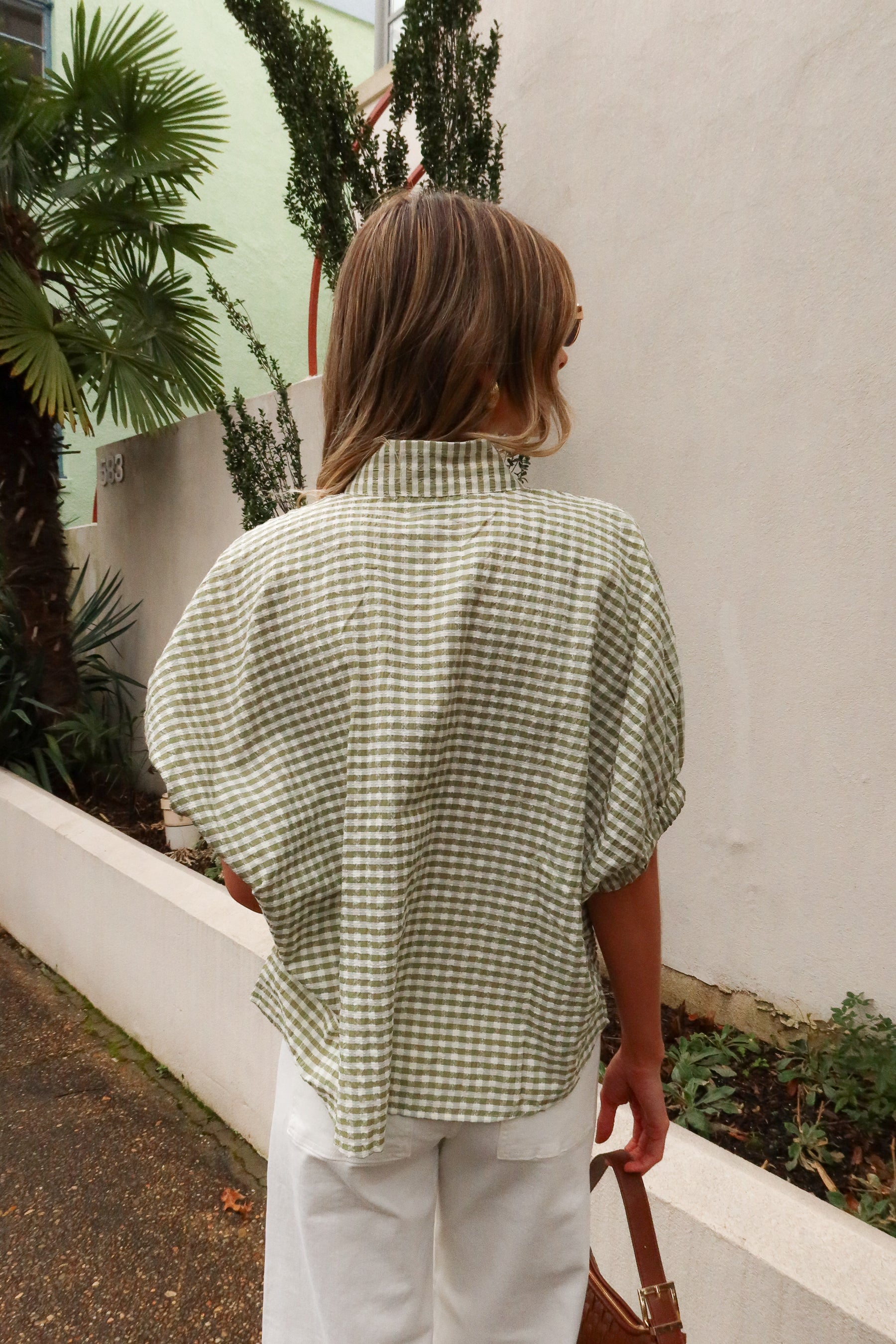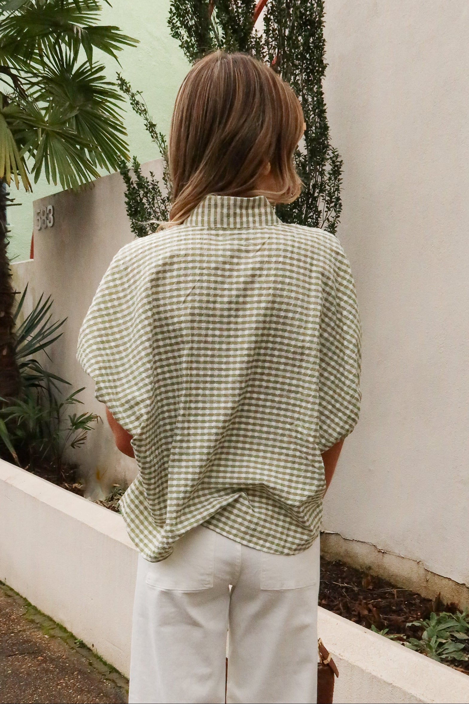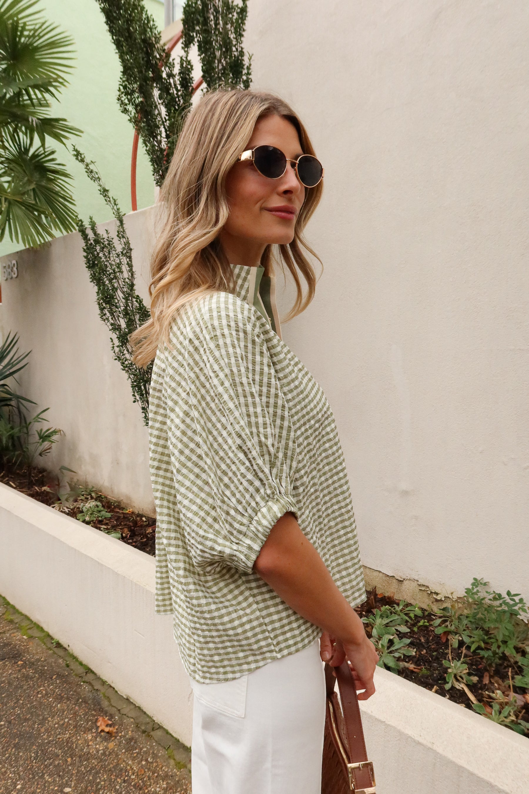 With short sleeves and breathable fabric, the Becca top is perfect for warm days or easy layering under jackets and cardigans. Style it with denim, white pants, shorts, or skirts. You'll have a cute, effortless outfit that works from brunch to casual evenings. Comfortable and polished, the Becca Green Gingham Top is a go-to piece for laid-back styling with personality.