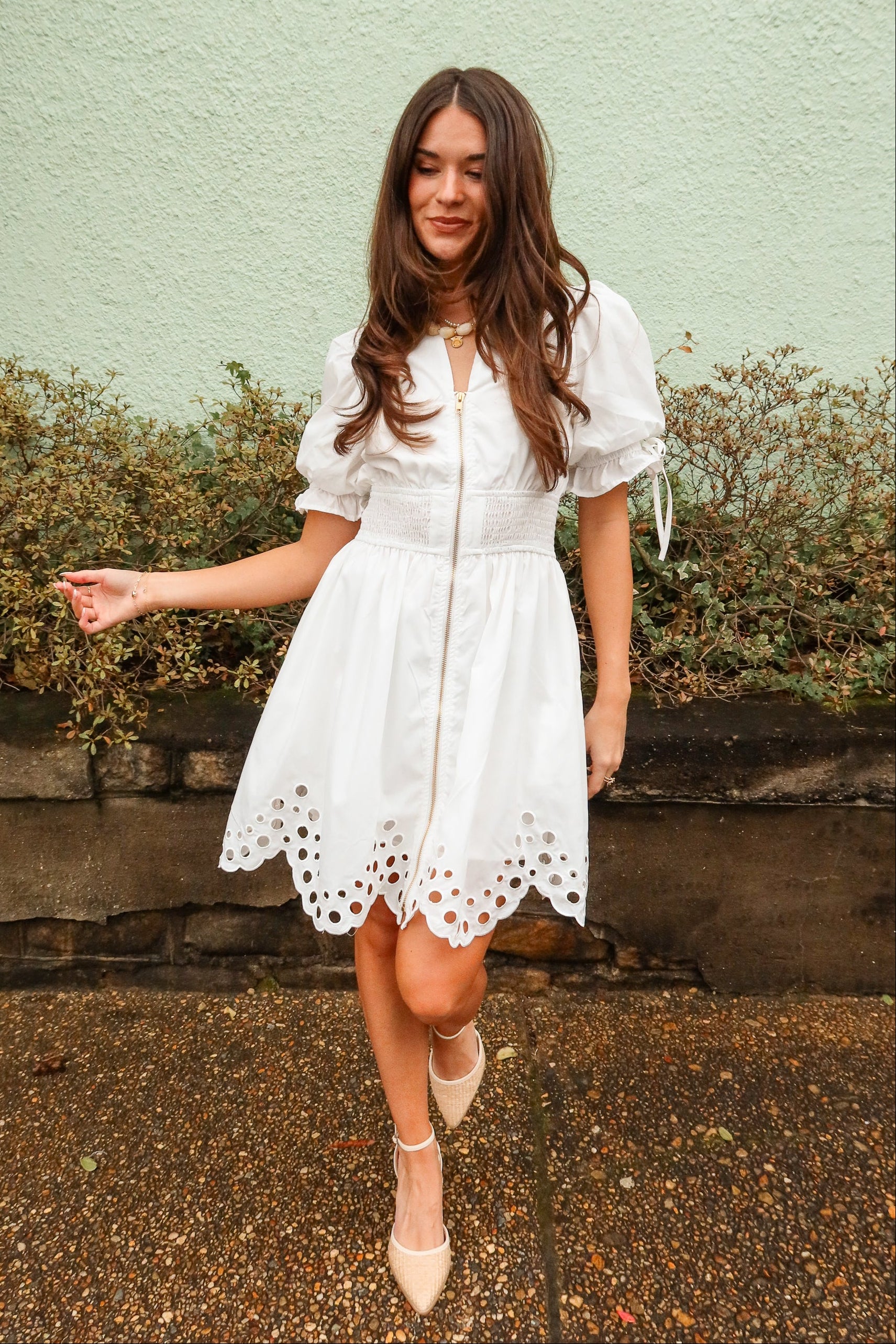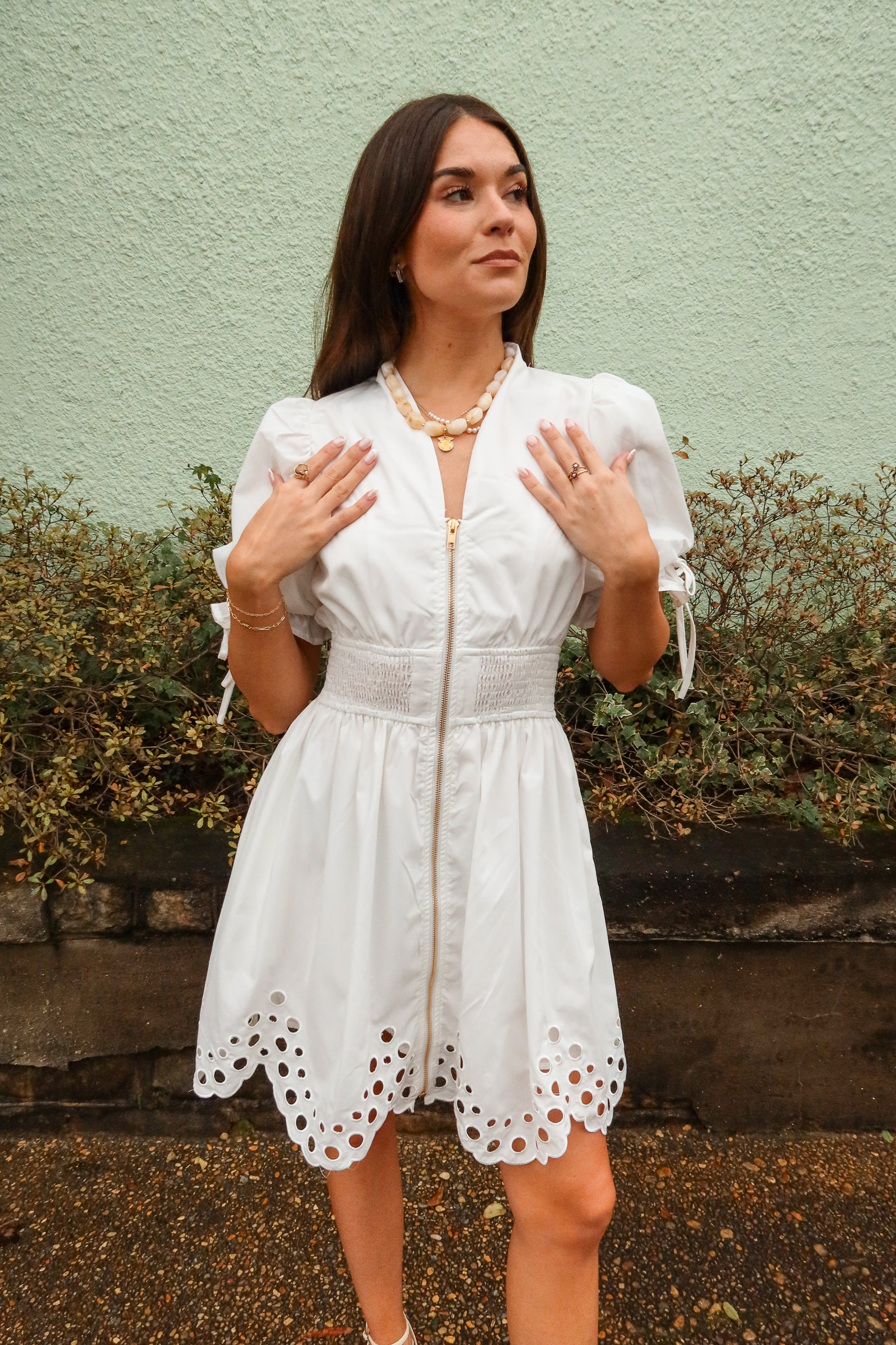Belinda White Zip-Up Eyelet Mini Dress