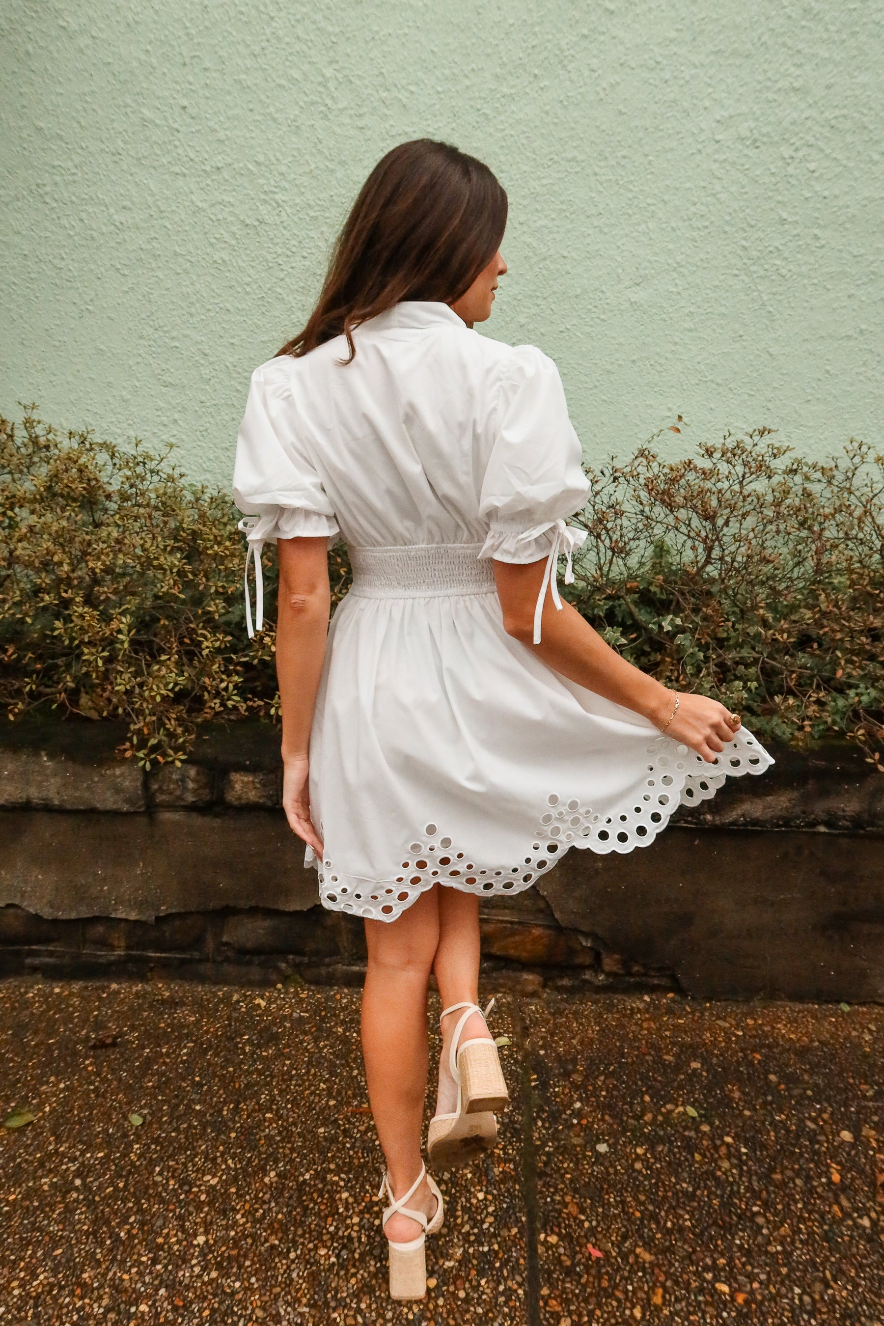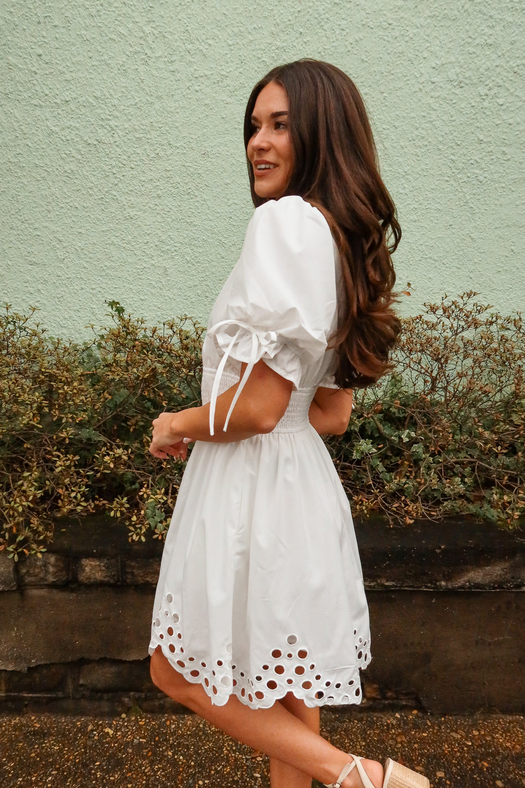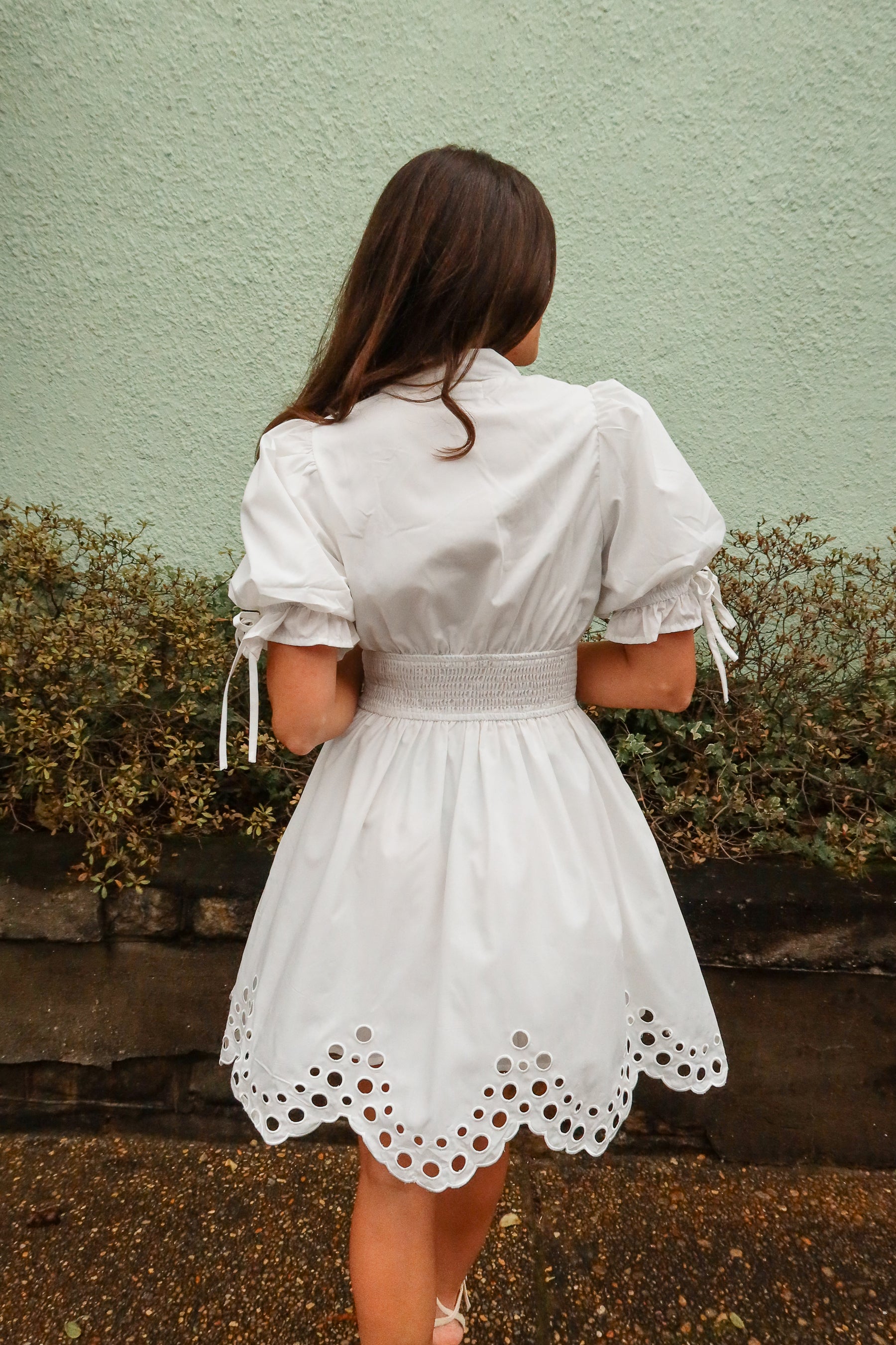 Designed with short puff sleeves and a V-neckline, the Belinda dress balances sweet details with contemporary styling. Its mini length makes it perfect for pairing with sandals or wedges for daytime events, brunches, or casual gatherings. Lightweight and versatile, this eyelet dress is a go-to option for effortless, feminine outfits.