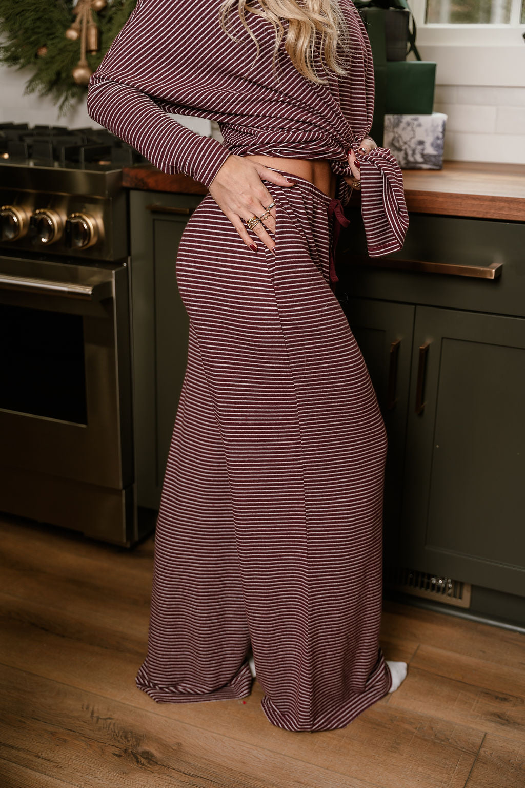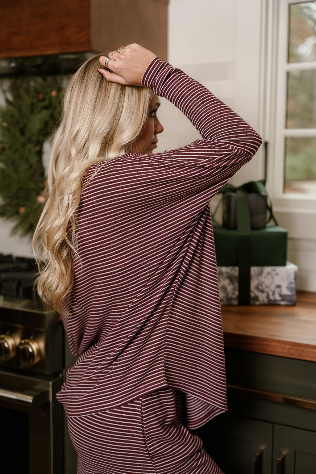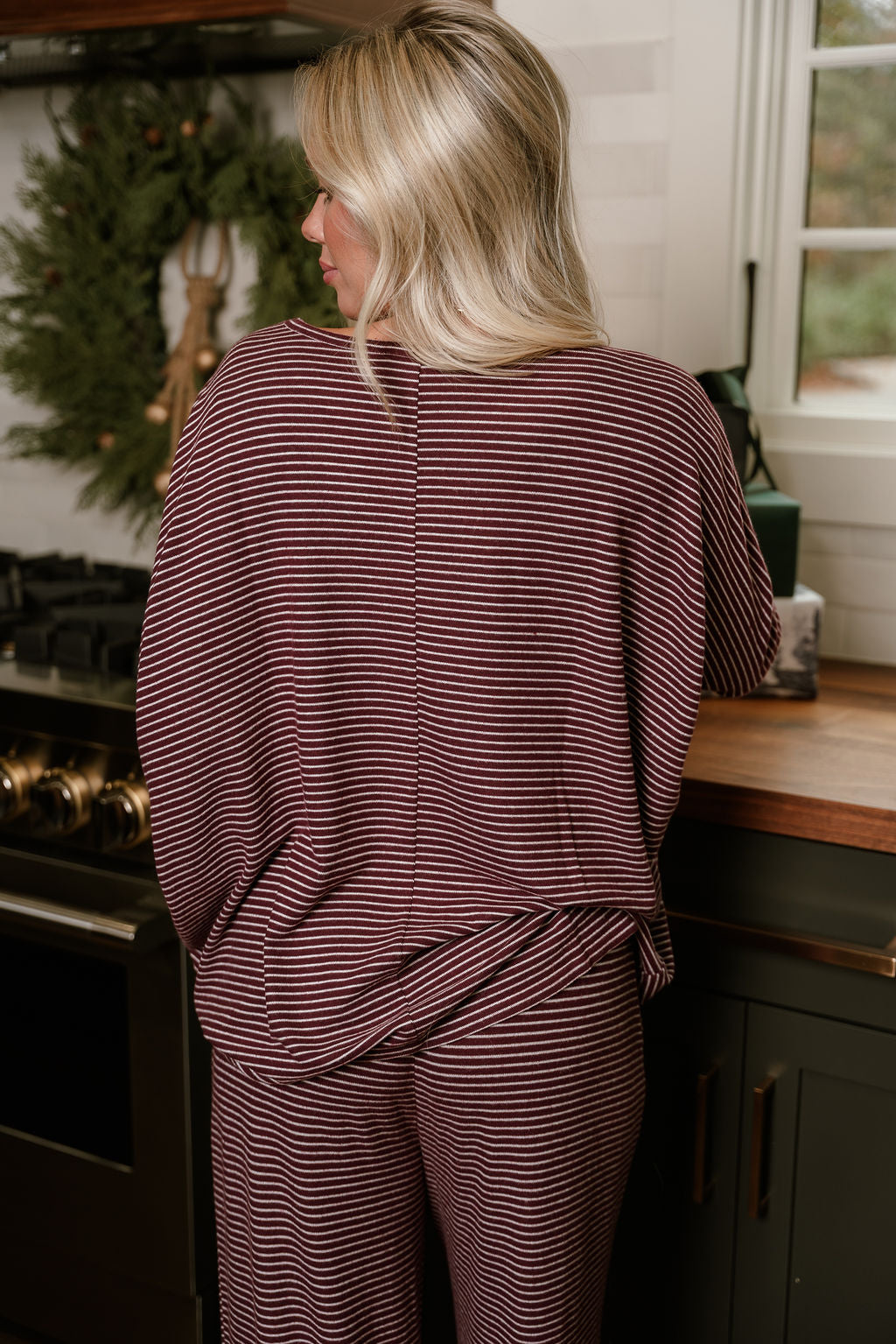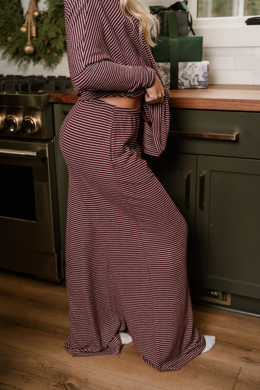 The Blair Burgundy Striped Loungewear Set is the perfect blend of comfort and style for cozy days at home or relaxed weekends away. Made from soft, lightweight burgundy cotton fabric, this matching set features a cream stripe print that adds a classic touch. The long-sleeve top has a round neckline and an easy, relaxed fit, while the wide-leg pants include a drawstring waist and side pockets for all-day comfort and convenience.