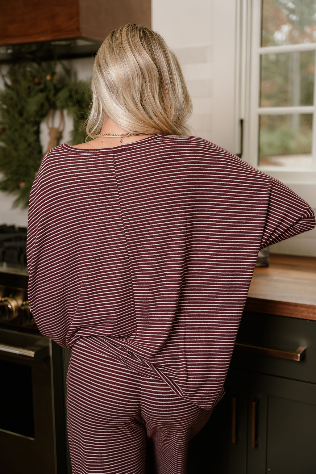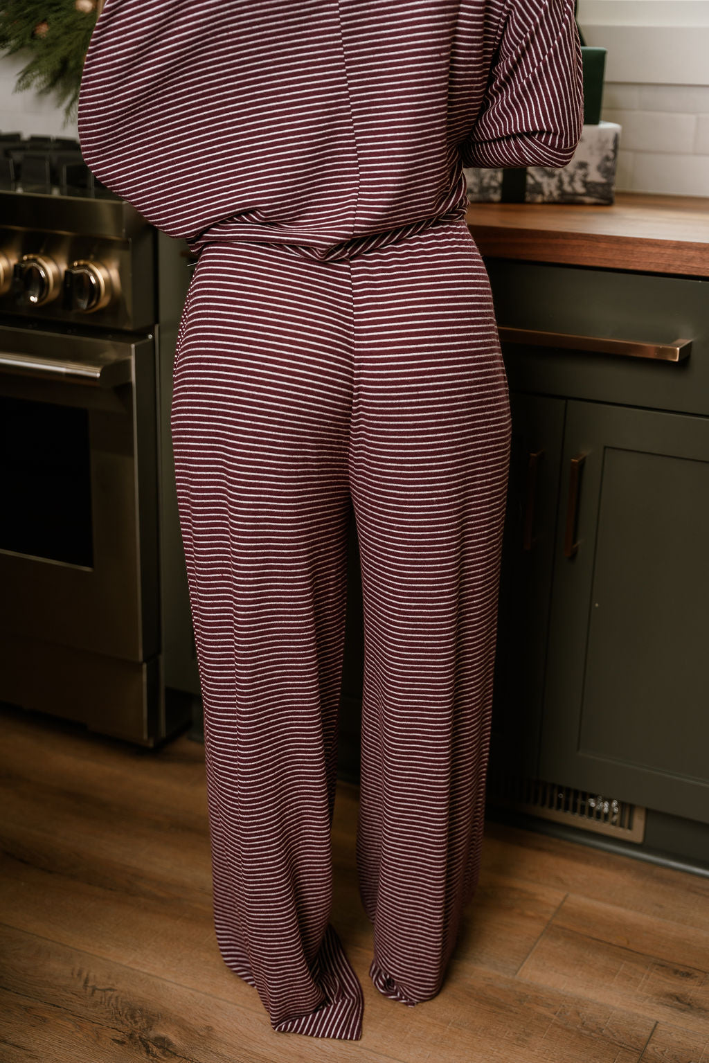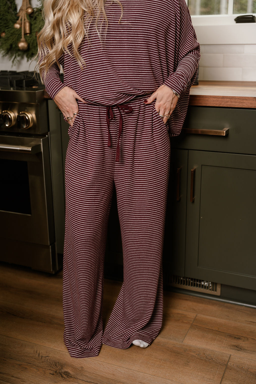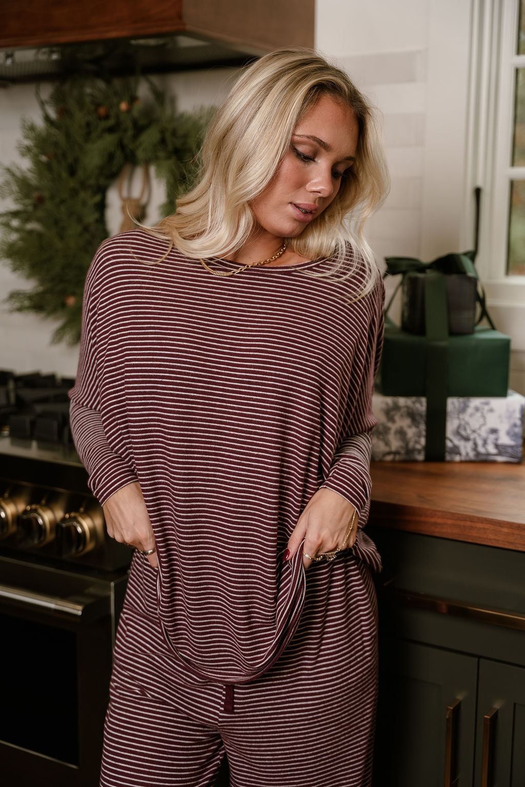 The Blair Burgundy Striped Loungewear Set is the perfect blend of comfort and style for cozy days at home or relaxed weekends away. Made from soft, lightweight burgundy cotton fabric, this matching set features a cream stripe print that adds a classic touch. The long-sleeve top has a round neckline and an easy, relaxed fit, while the wide-leg pants include a drawstring waist and side pockets for all-day comfort and convenience.