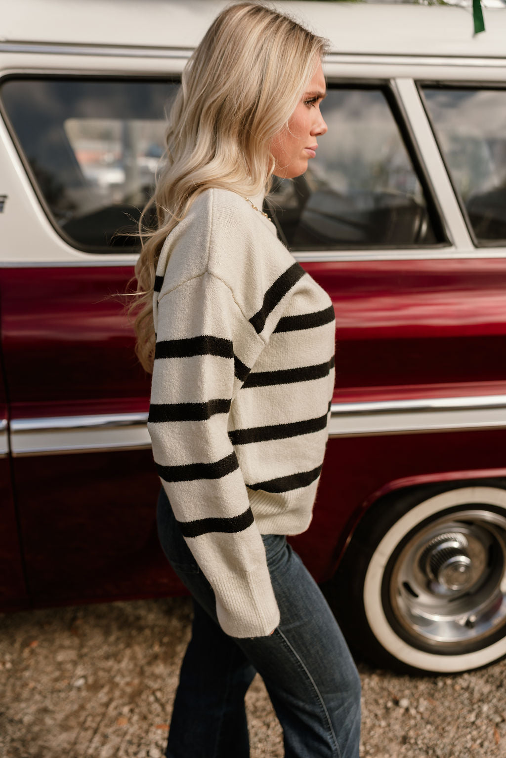 Classic, cozy, and effortlessly stylish, the Blair Cream & Black Stripe Knit Sweater is a versatile wardrobe staple for cooler days. Crafted from soft cream and black knit fabric, this sweater features a timeless stripe pattern that adds visual interest while remaining easy to style with a variety of bottoms.