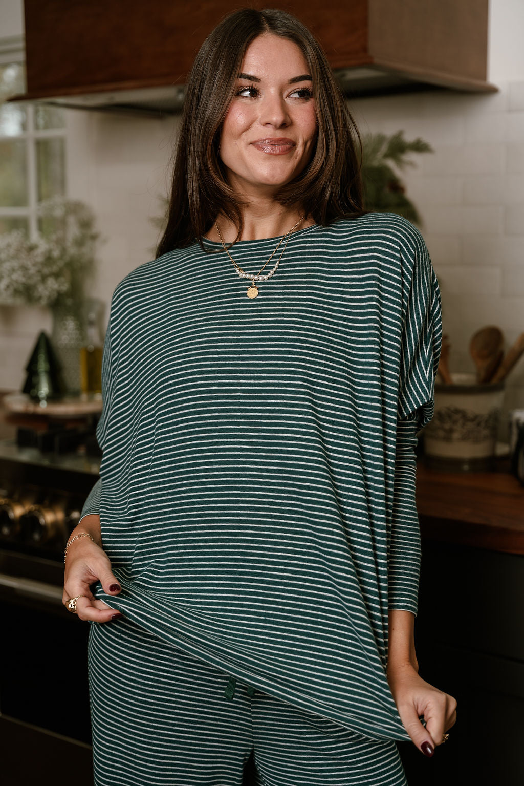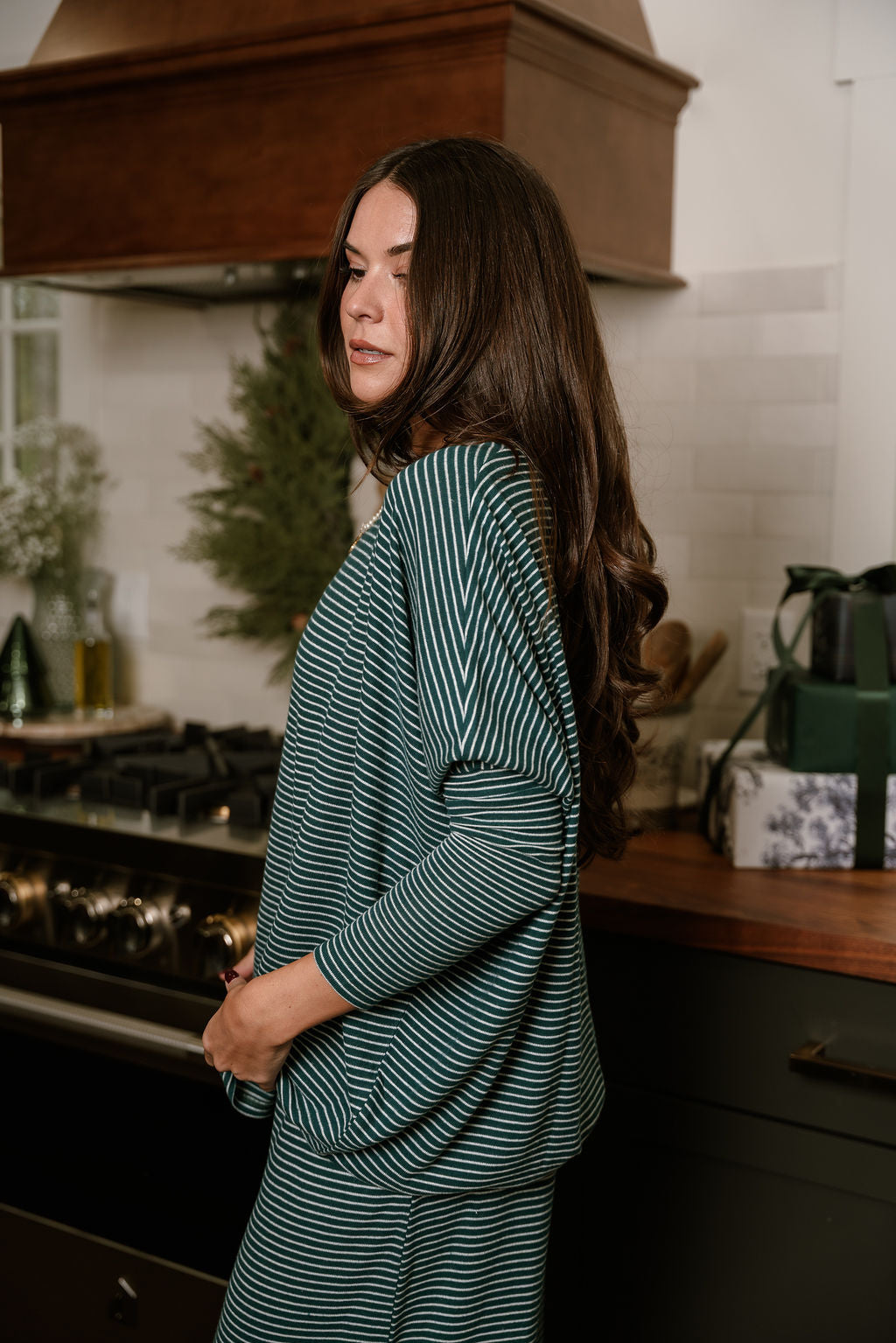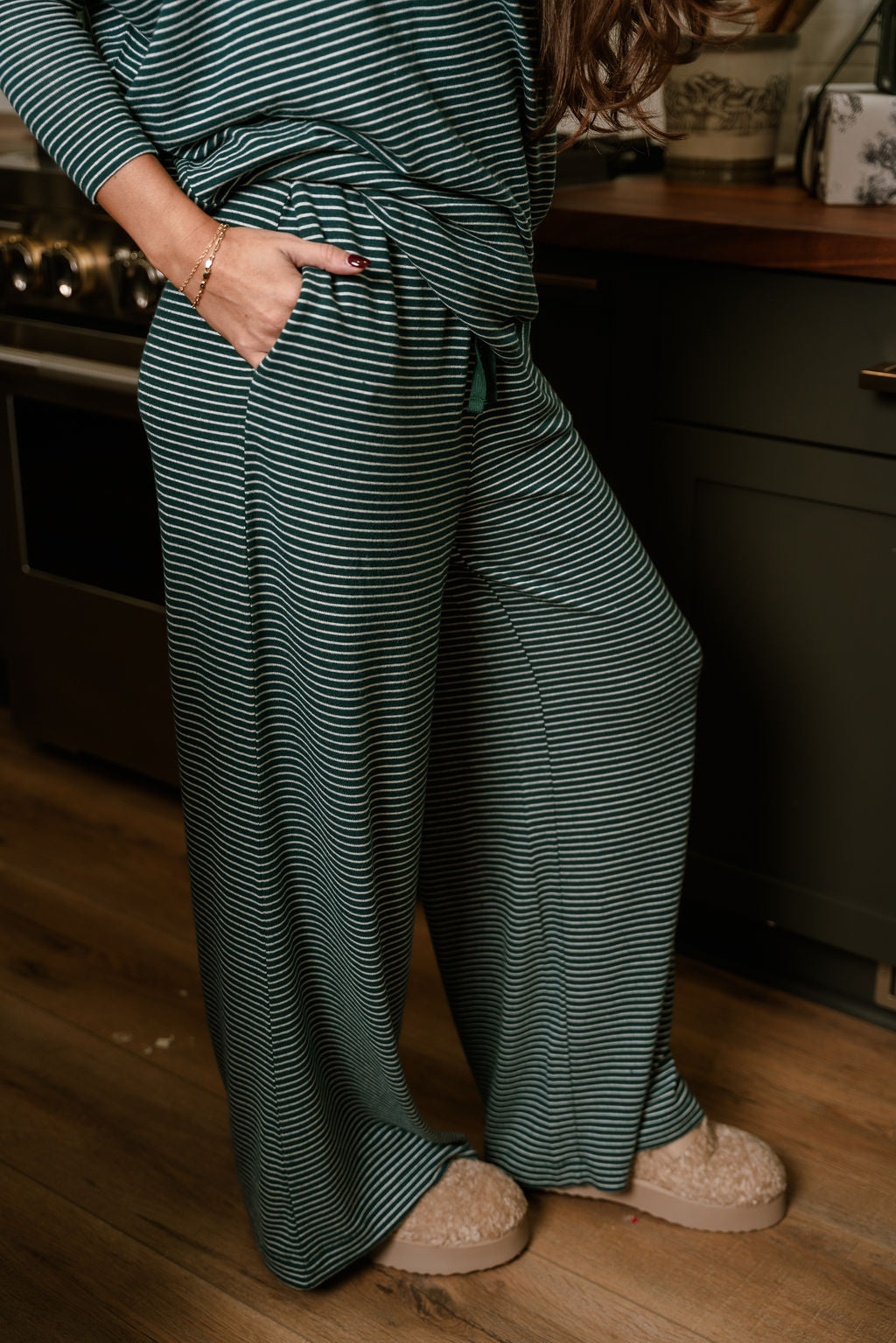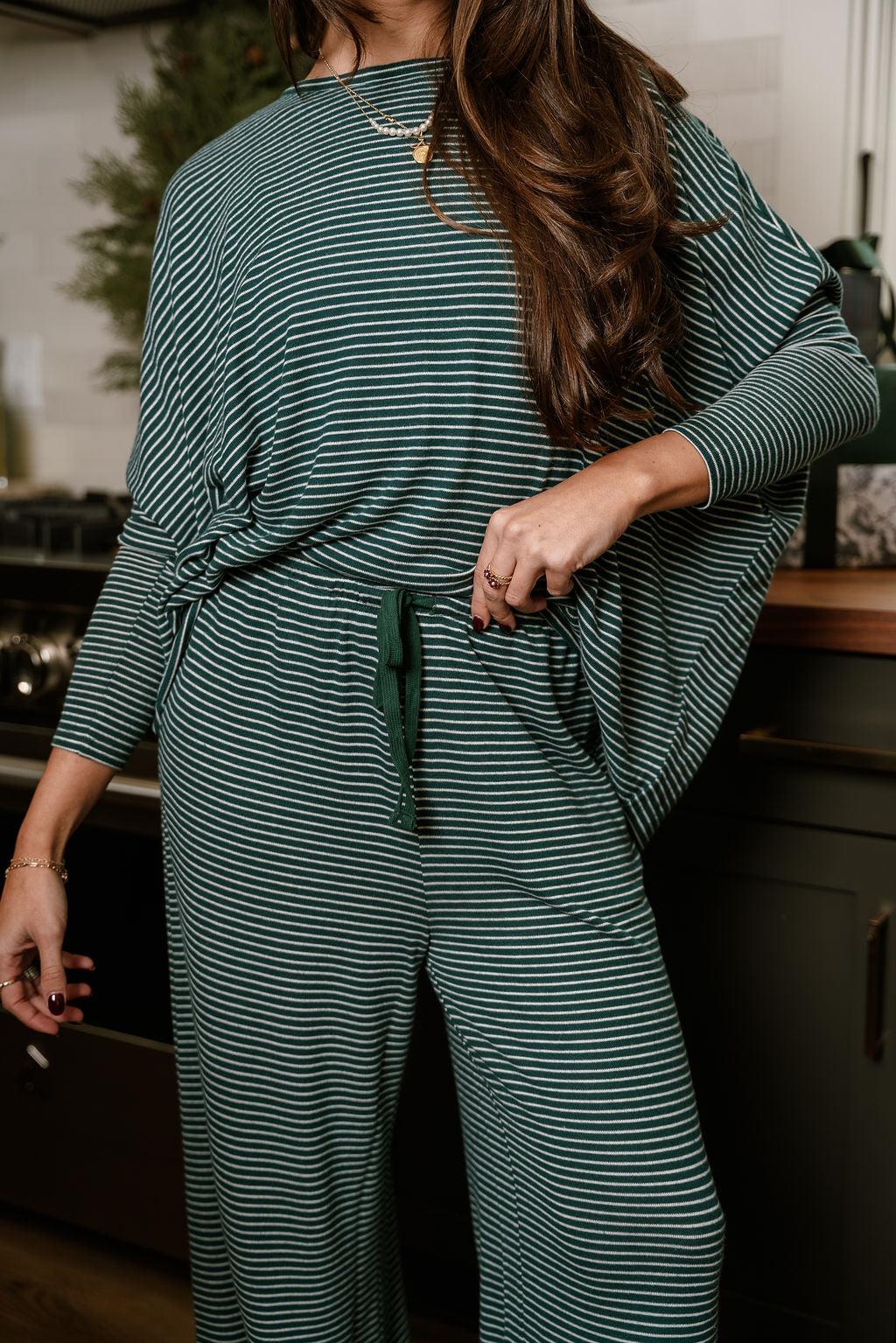 The Blair Hunter Green Striped Loungewear Set brings cozy comfort with a timeless, classic look. Crafted from soft, lightweight cotton fabric, this set features a rich hunter green base with cream stripes for a fresh, stylish twist on everyday loungewear. The long-sleeve top has a round neckline and a relaxed fit, while the wide-leg pants include a drawstring waist and side pockets for an easy, laid-back feel.
