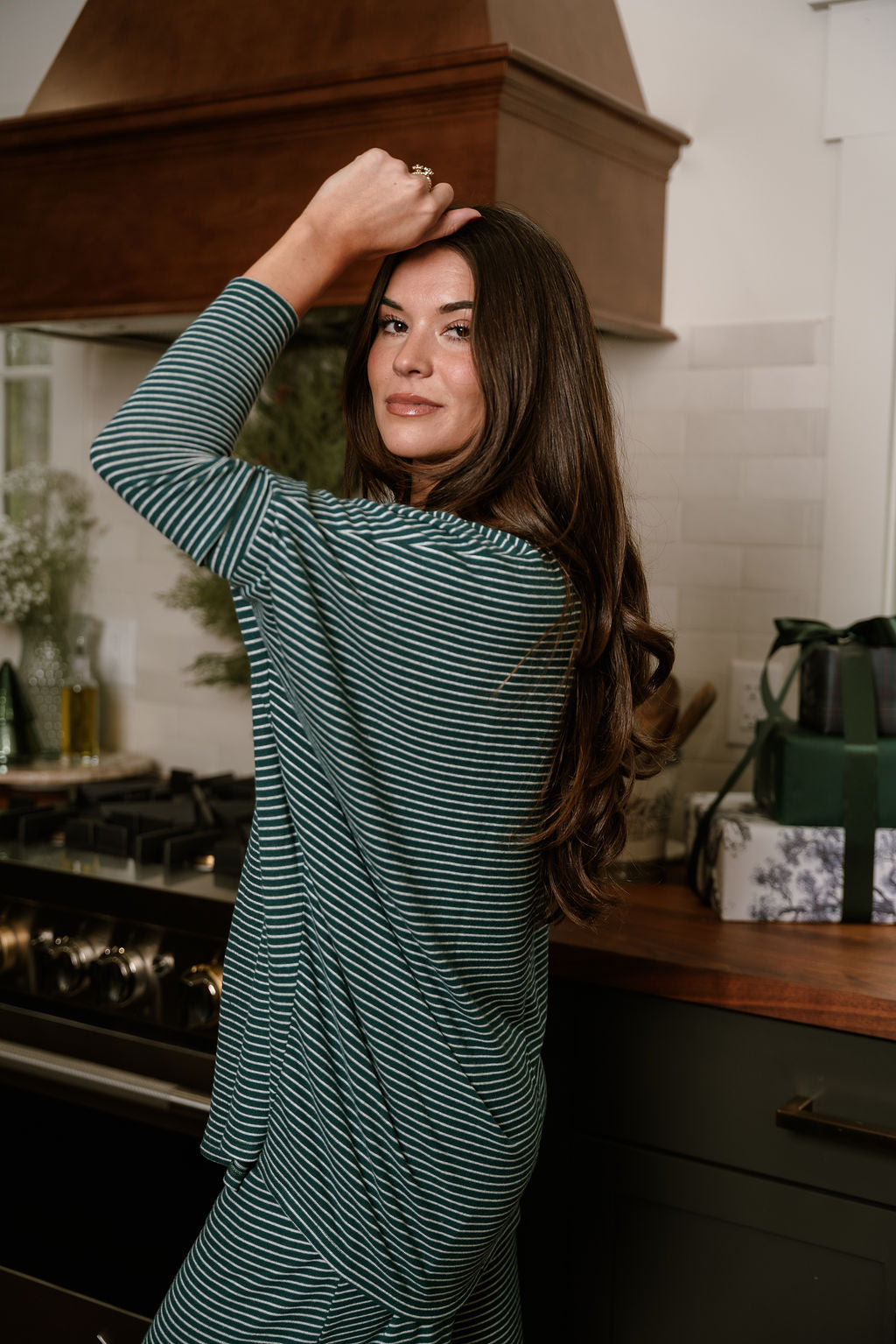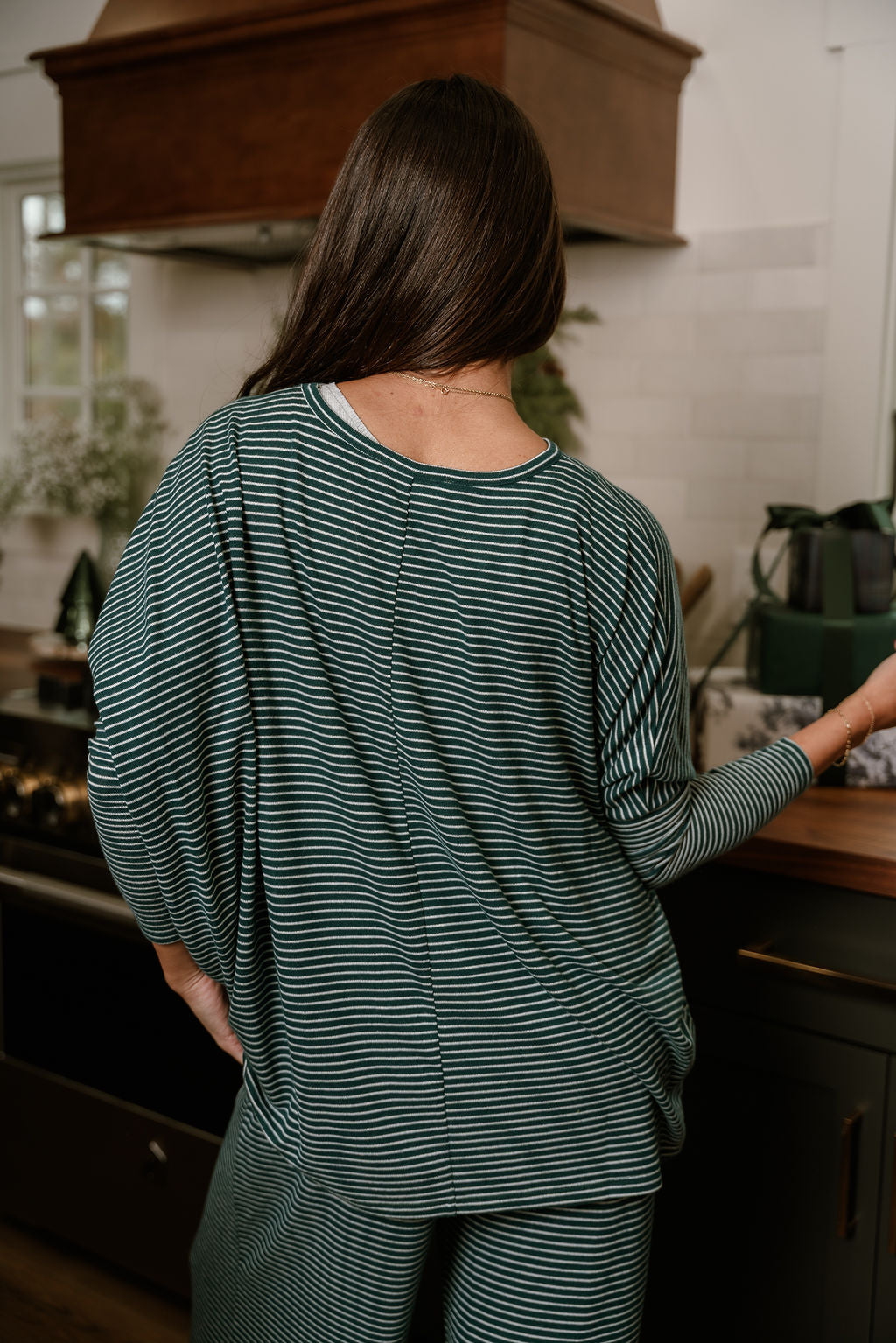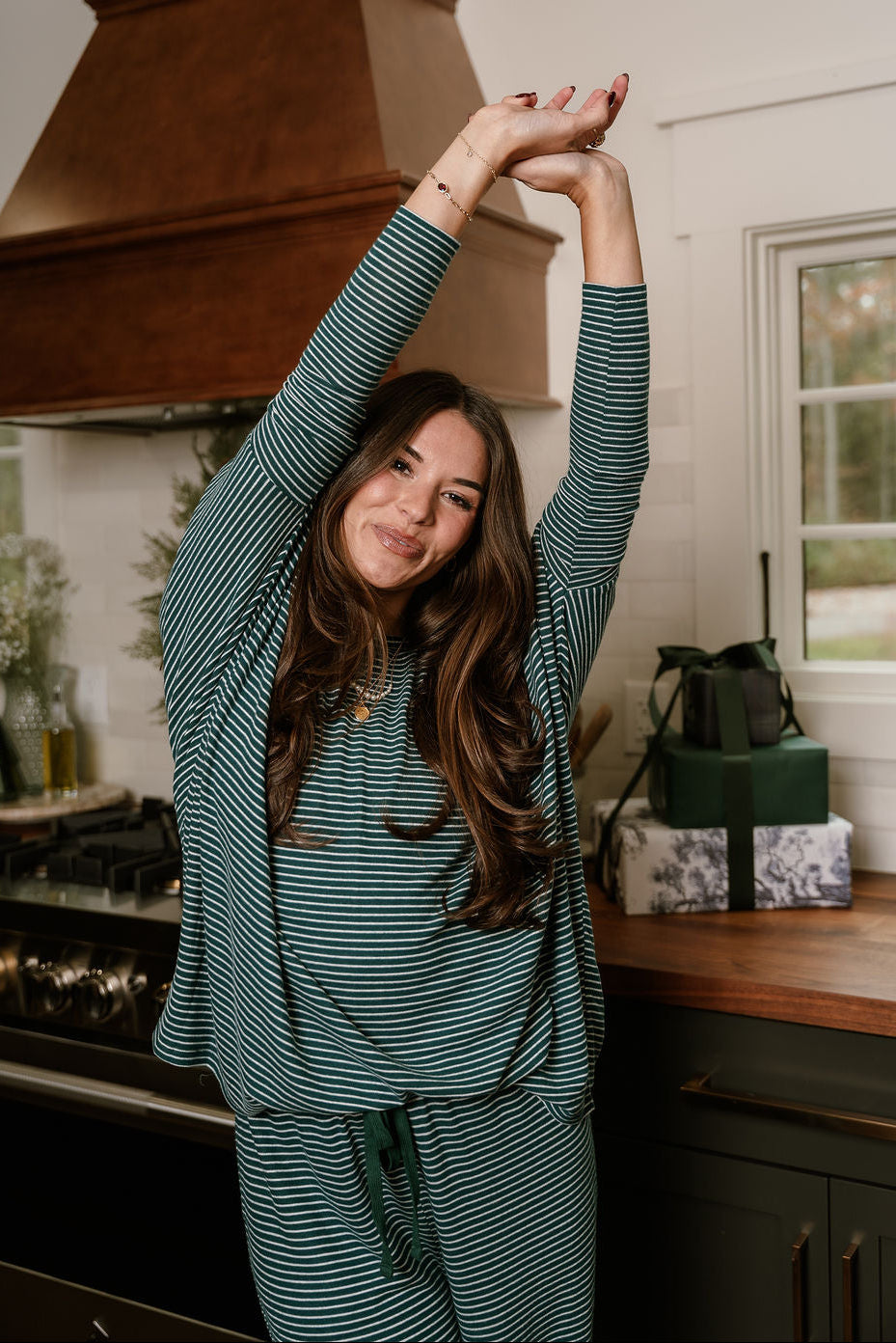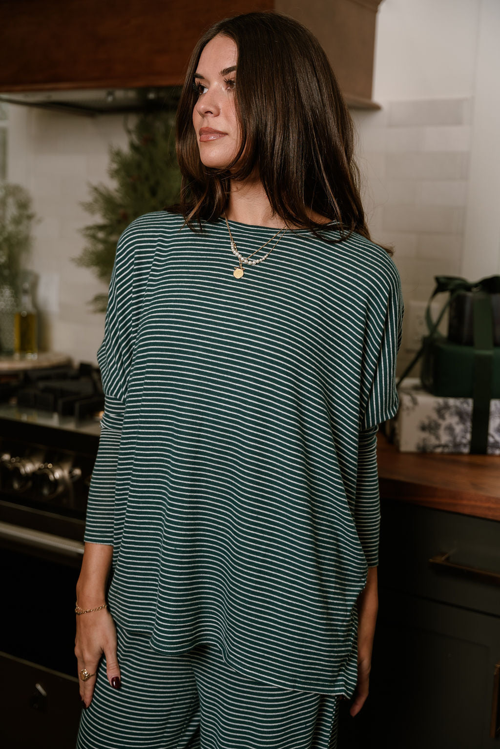 The Blair Hunter Green Striped Loungewear Set brings cozy comfort with a timeless, classic look. Crafted from soft, lightweight cotton fabric, this set features a rich hunter green base with cream stripes for a fresh, stylish twist on everyday loungewear. The long-sleeve top has a round neckline and a relaxed fit, while the wide-leg pants include a drawstring waist and side pockets for an easy, laid-back feel.