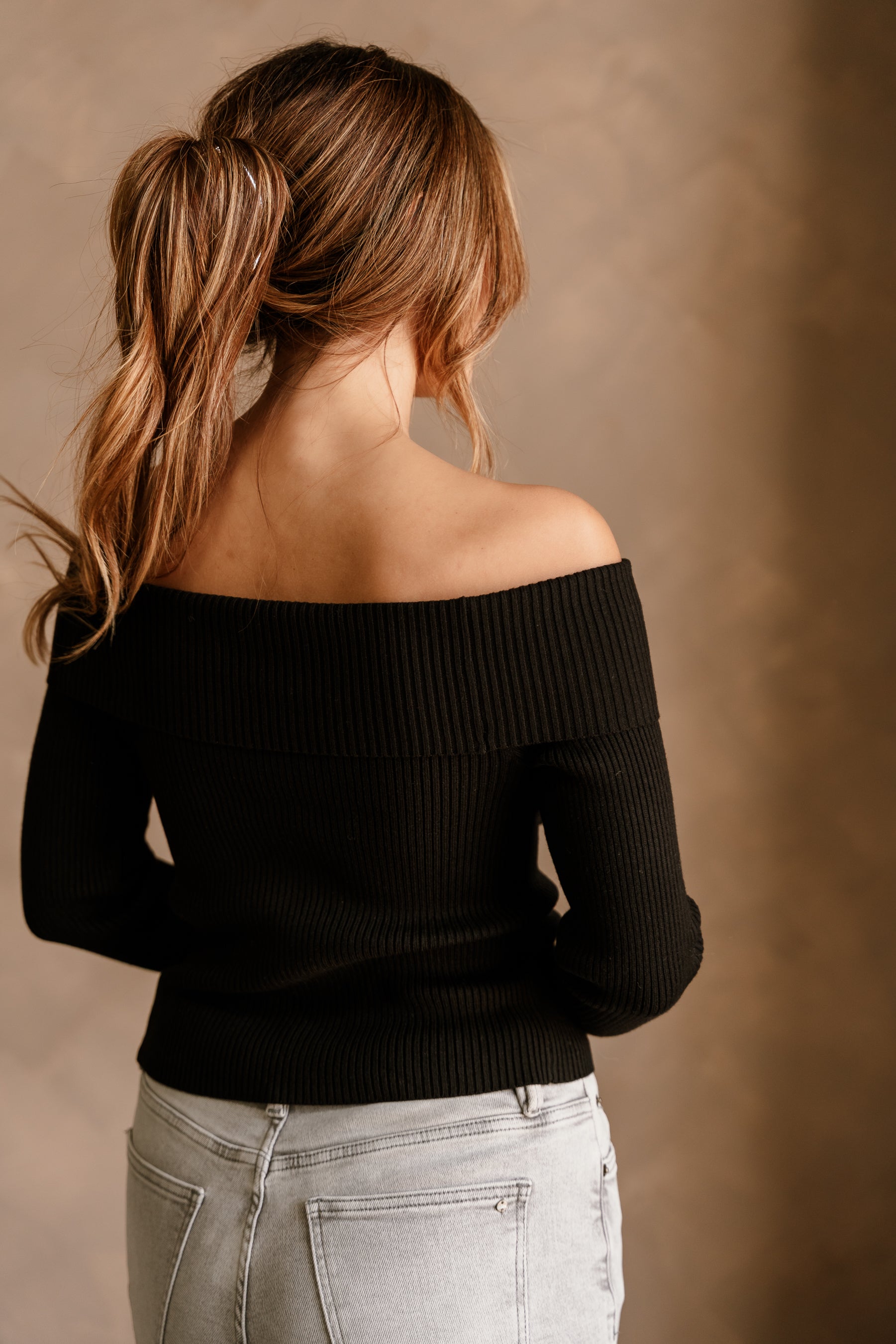 The Blakely Black Button-Up Off-The-Shoulder Top combines sleek style with effortless allure. Crafted from soft black ribbed fabric, this top features a flattering off-the-shoulder neckline and a front button-up design for a touch of sophistication. The long sleeves balance the silhouette, making it perfect for pairing with high-waisted jeans or skirts for a chic, modern look.