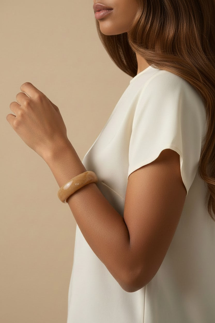 The Brenna Brown Marbled Bangle adds a bold yet polished touch to your everyday look. Crafted from brown marbled acrylic, this bangle combines earthy tones with a sleek, glossy finish that catches the light beautifully. Its smooth rounded shape and subtle patterning make it a versatile statement piece that complements both casual and dressy outfits.