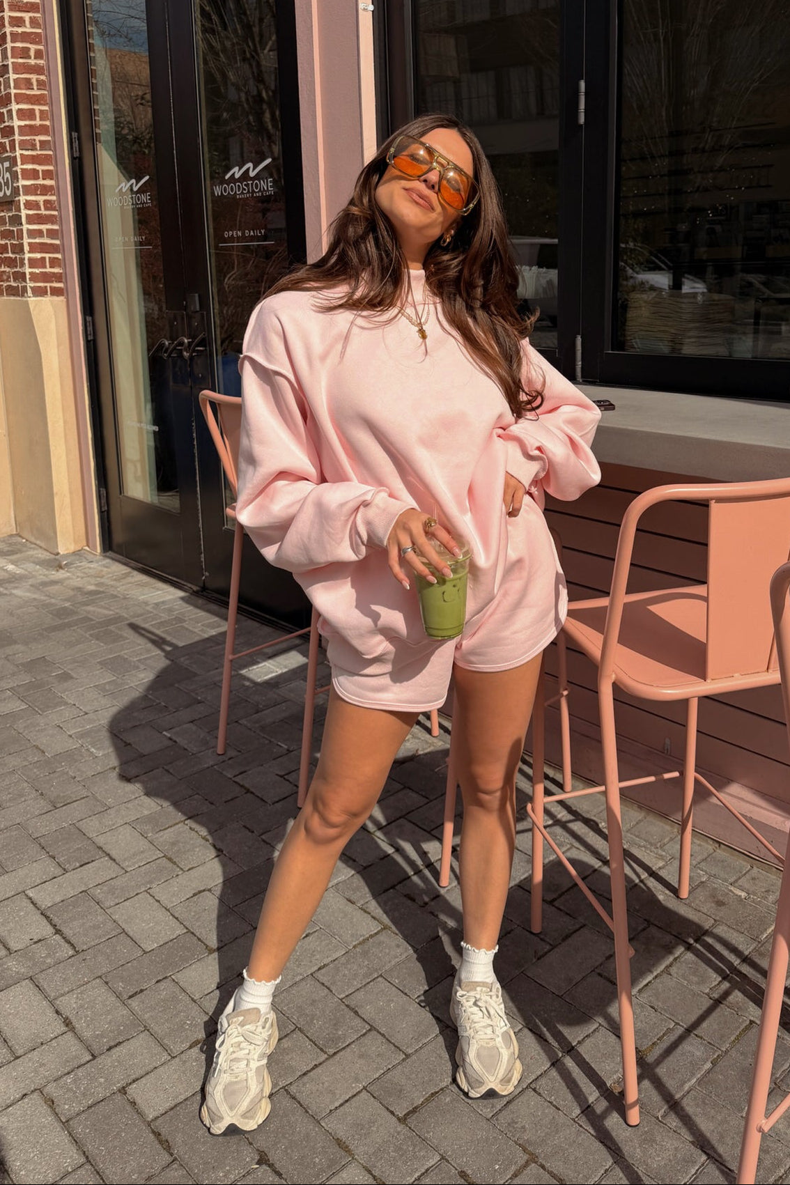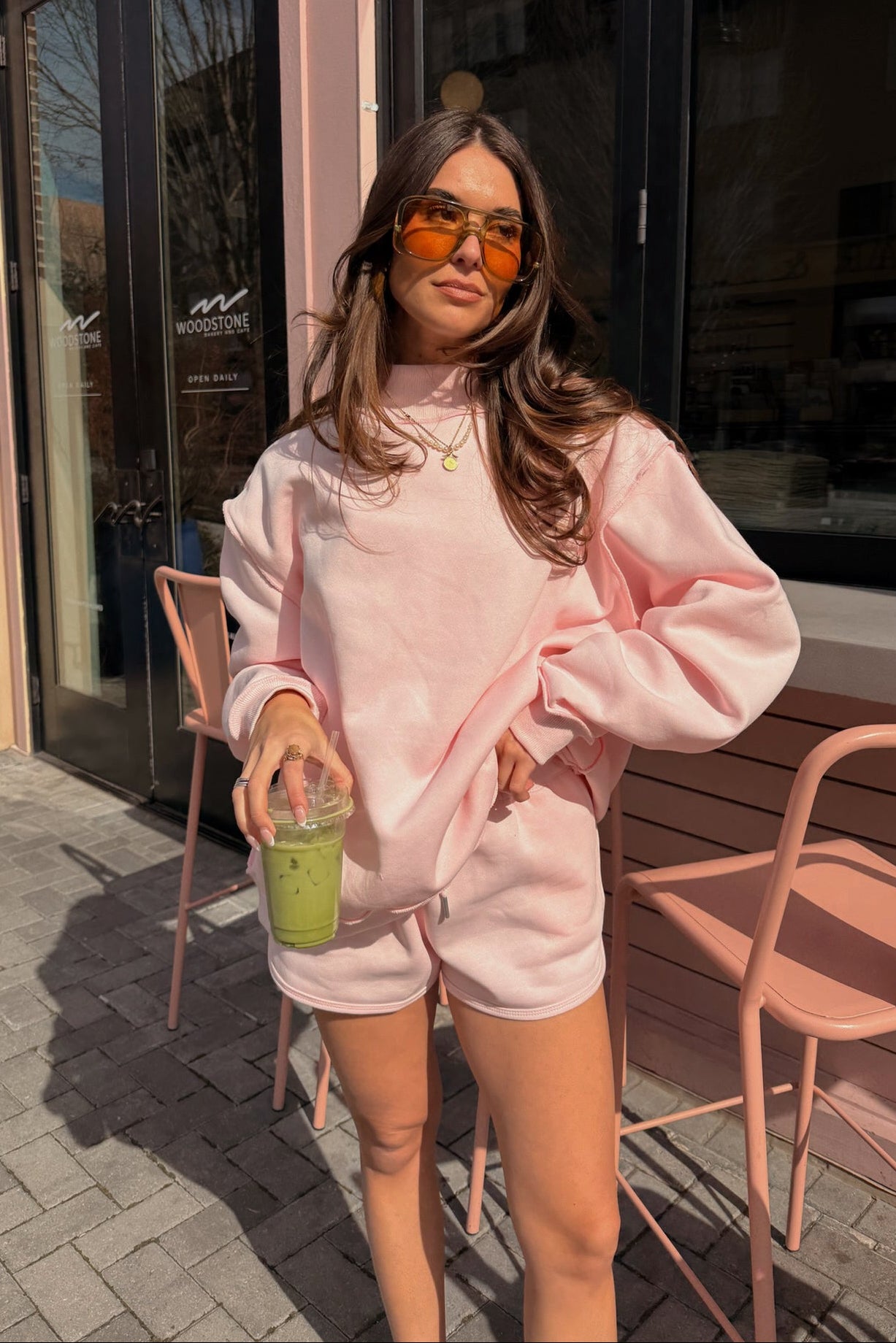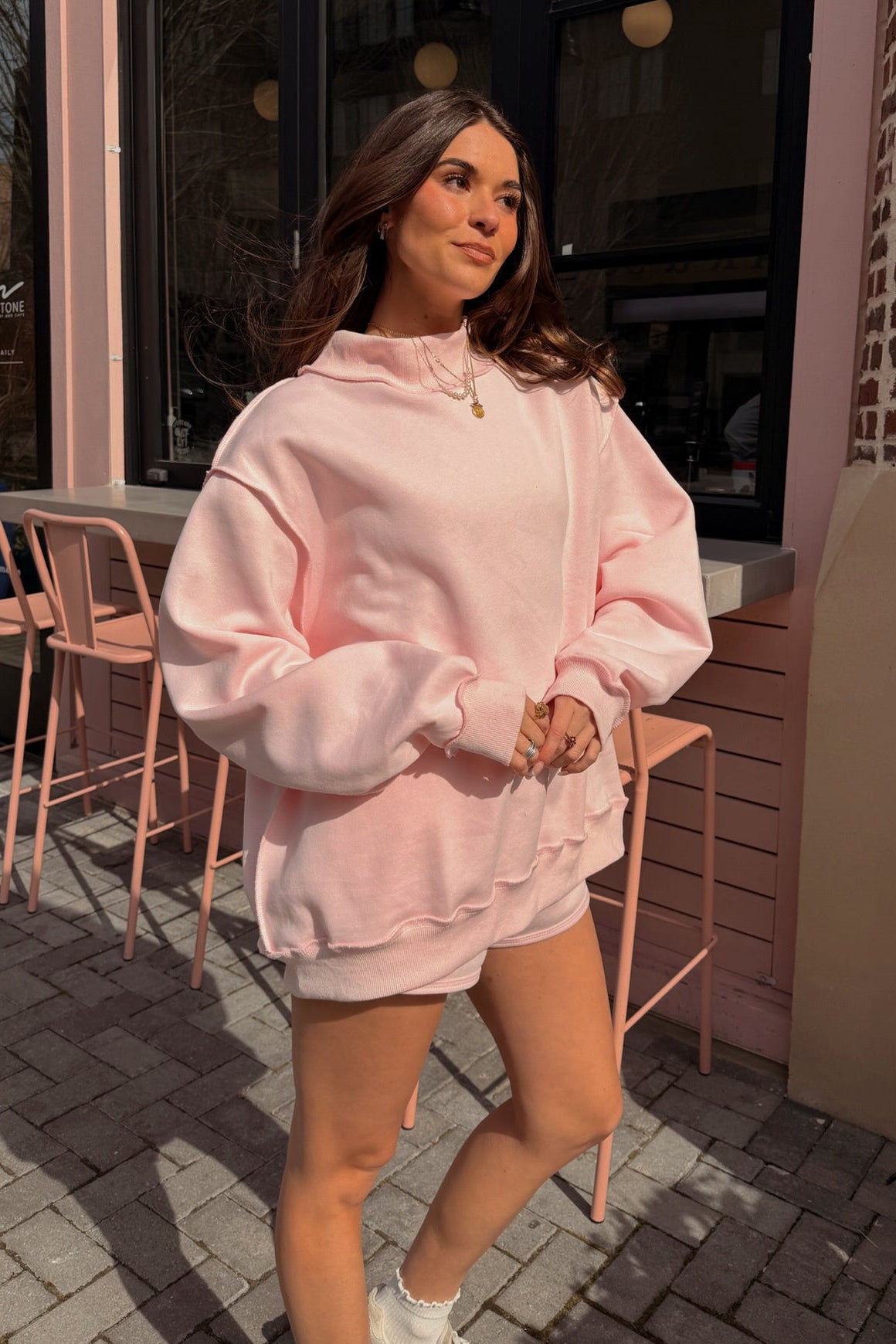 For a complete coordinated look, pair the Bridgette Light Pink Mock Neck Sweatshirt with the matching light pink shorts (sold separately) or mix and match with your favorite joggers or denim. Ideal for casual weekends, coffee runs, or cozy nights in, this sweatshirt combines effortless comfort with elevated style for a versatile, everyday essential.