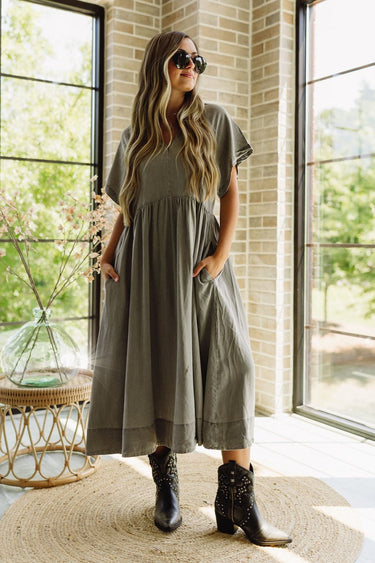 The Brooke Washed Grey Midi Dress is the epitome of effortless chic. Made from lightweight washed grey fabric, this dress offers a relaxed and comfortable fit perfect for any occasion. The midi length adds a touch of sophistication, while the V-neckline and short sleeves provide a flattering and breathable design. With convenient side pockets adding both style and functionality, the Brooke dress is a versatile addition to your wardrobe, ideal for dressing up or down with ease.