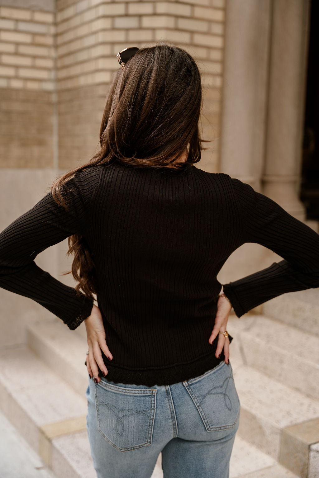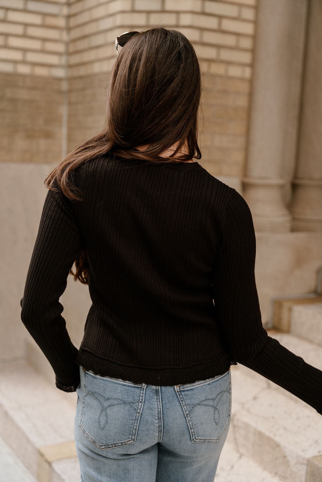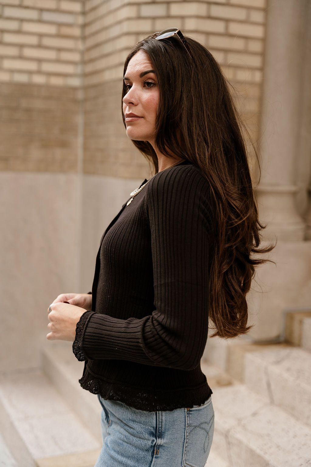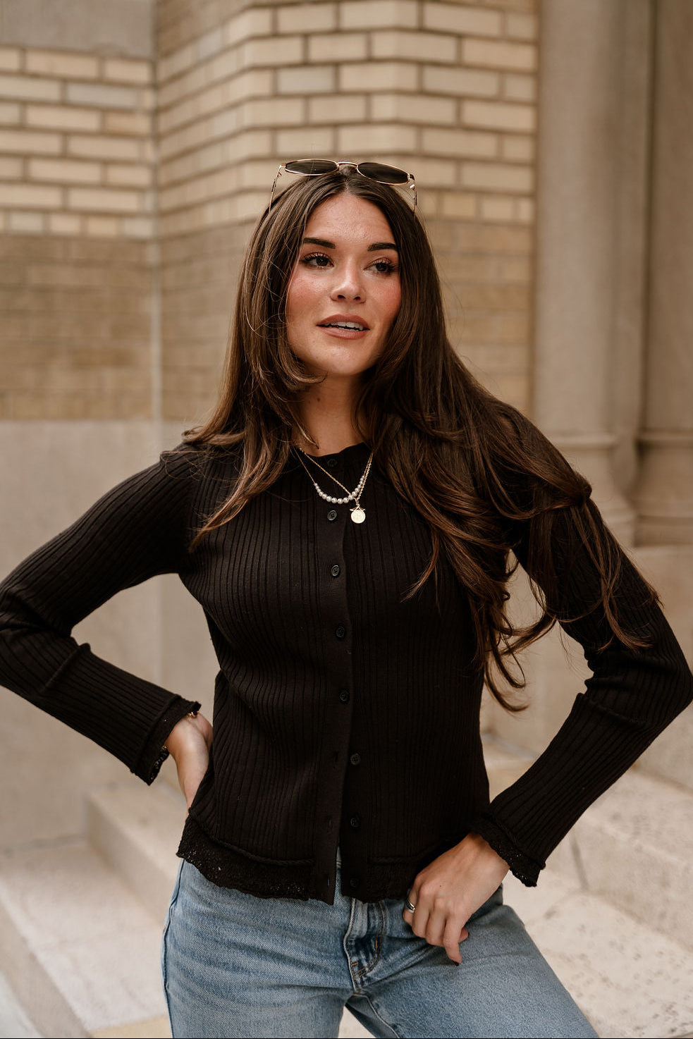 Elevate your everyday layers with the timeless elegance of the Brynlee Black Ribbed & Lace Cardigan. Crafted from soft black ribbed knit fabric, this versatile piece brings effortless sophistication to any outfit. Delicate eyelet knit trim details add a touch of feminine charm, offering subtle texture contrast that sets it apart from your classic cardigan.