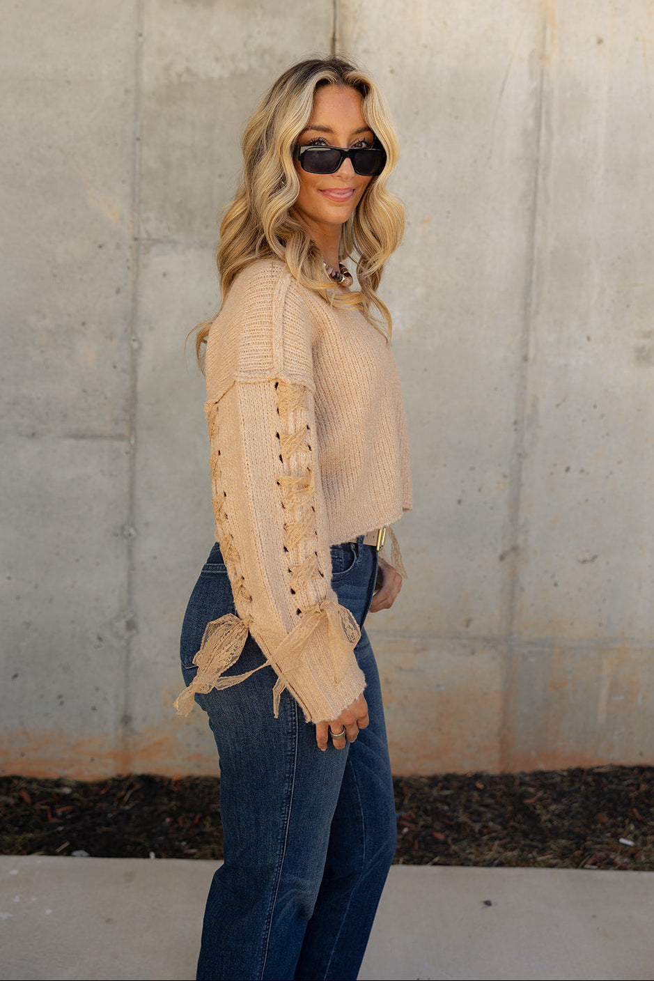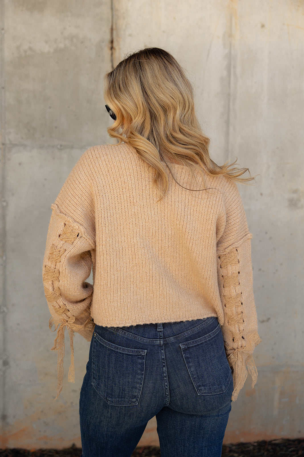 Soft textures meet romantic detail in the Brynna Taupe Lace Tie & Knit Sweater. Crafted from cozy taupe knit fabric, this stylish layer features a slight cropped waist with dropped shoulders and long sleeves for a relaxed, modern fit. Delicate lace tie accents elevate the look with a feminine touch, making this sweater the perfect balance of comfort and charm — ideal for dressing up your everyday style.