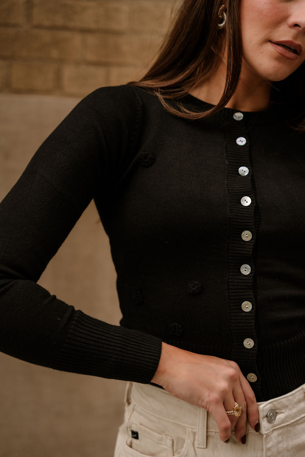 Bring a touch of romantic detail to your everyday wardrobe with the Calia Black Floral Embellished Cardigan. Crafted from soft black knit fabric, this timeless layer combines classic comfort with elevated charm. The ribbed hem and cuffs provide gentle structure, creating a flattering, easy-to-wear silhouette that works beautifully for both casual and dressed-up looks.