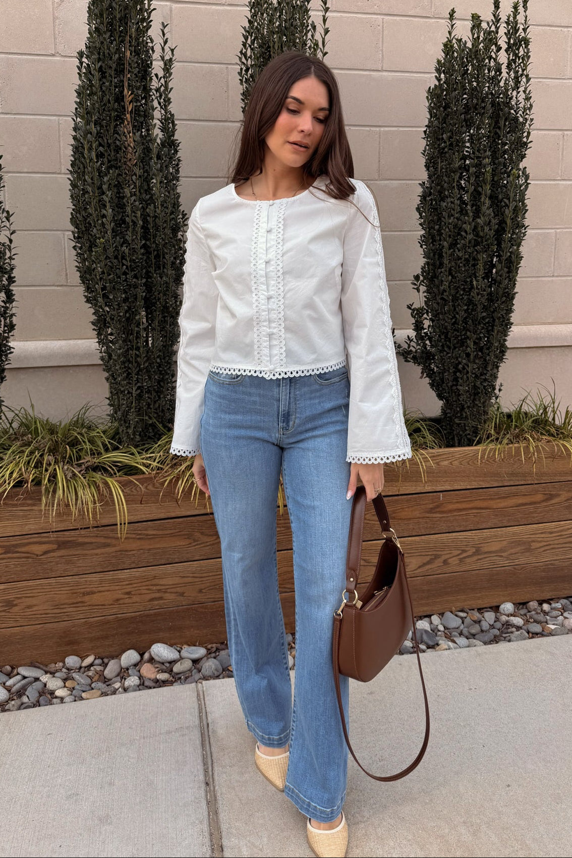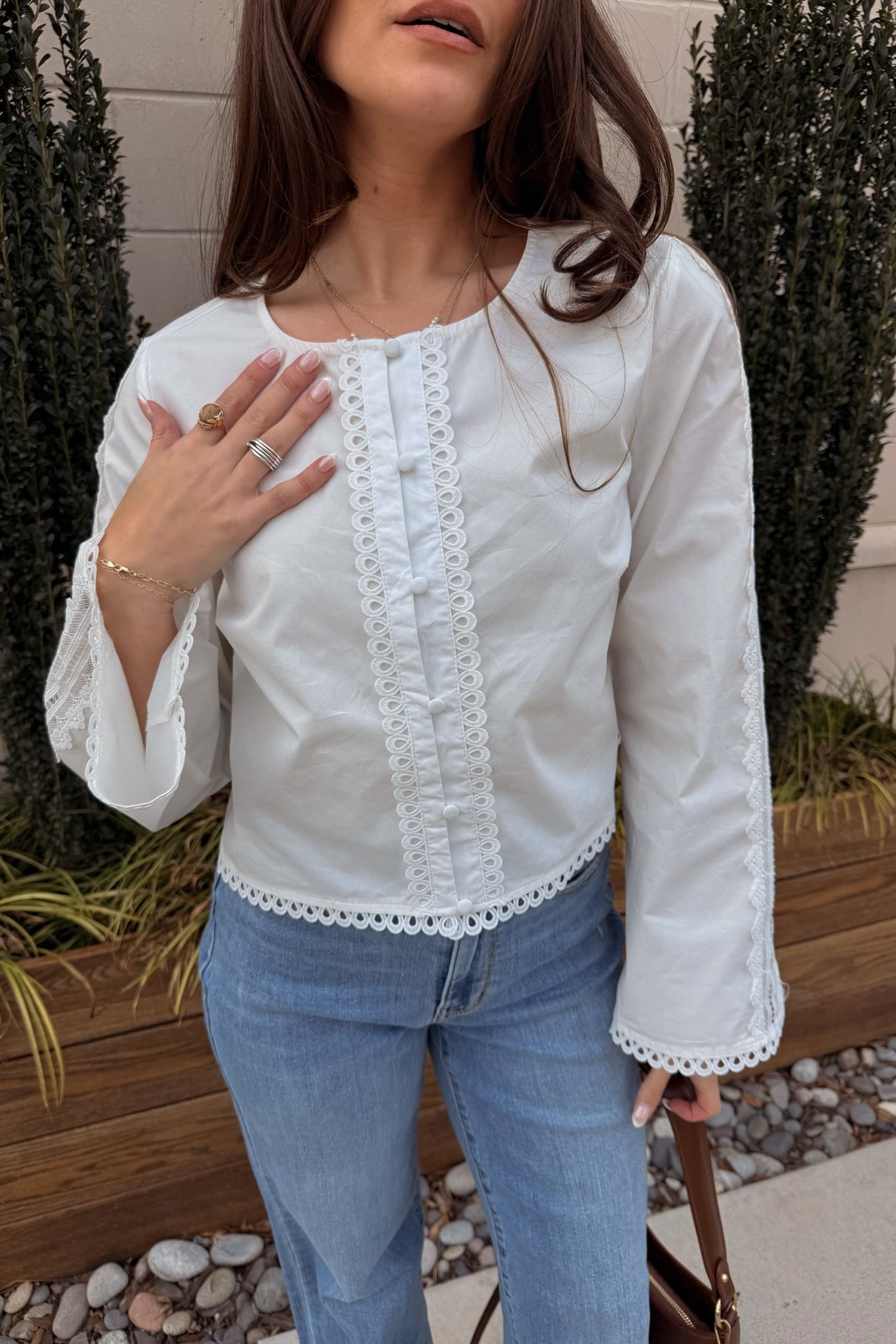 Soft, feminine, and effortlessly polished, the Carmella White Eyelet & Lace Top is a timeless piece made for elevated everyday styling. Crafted from lightweight white fabric with a smooth lining, this top features delicate eyelet scallop trim details that add beautiful texture and charm. The front button-up design and classic round neckline create a clean, flattering silhouette. The intricate lace accents bring a romantic finish.
