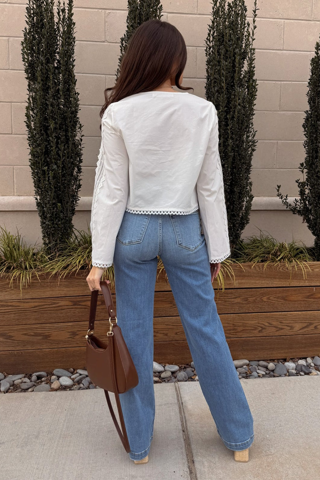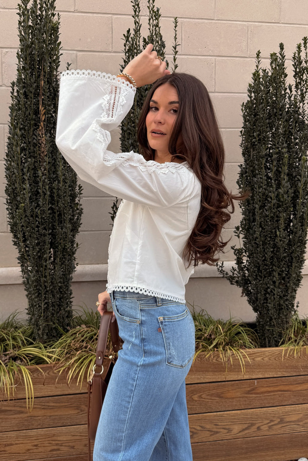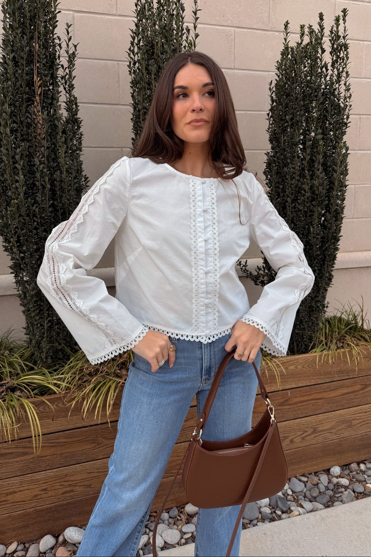 Long sleeves with lace detailing offer graceful coverage and visual interest. Perfect for both transitional seasons and year-round wear. Easy to dress up with tailored pants or soften with denim, the Carmella White Eyelet & Lace Top blends comfort with refined style. Whether worn casually or styled for special occasions, it’s a versatile staple with endless outfit potential.