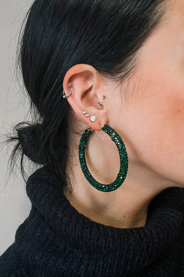The Carmen Emerald Stone Hoop Earrings feature large closed hoops with emerald green stones.